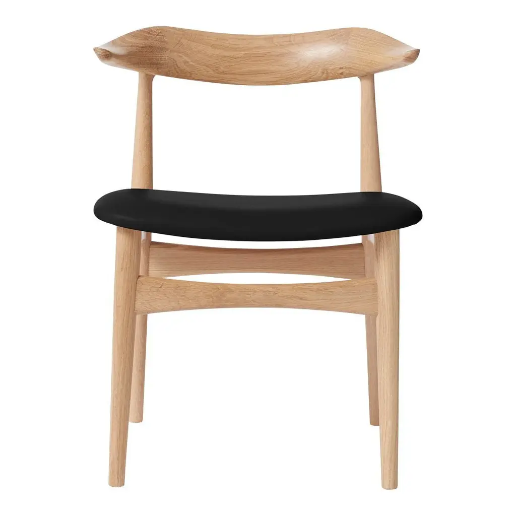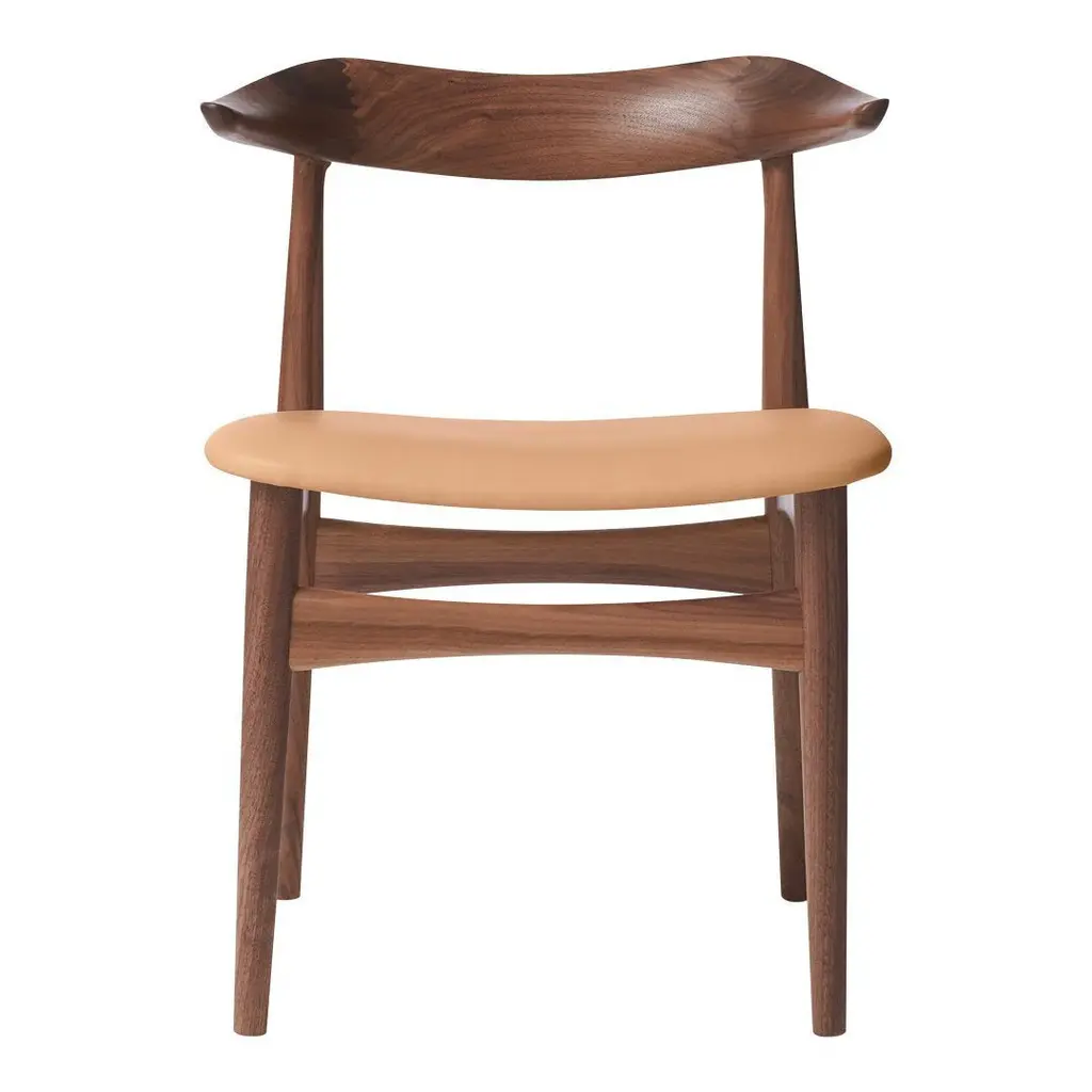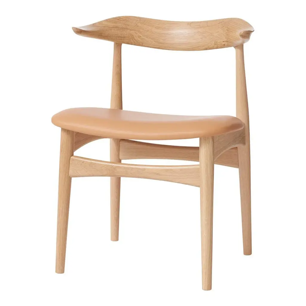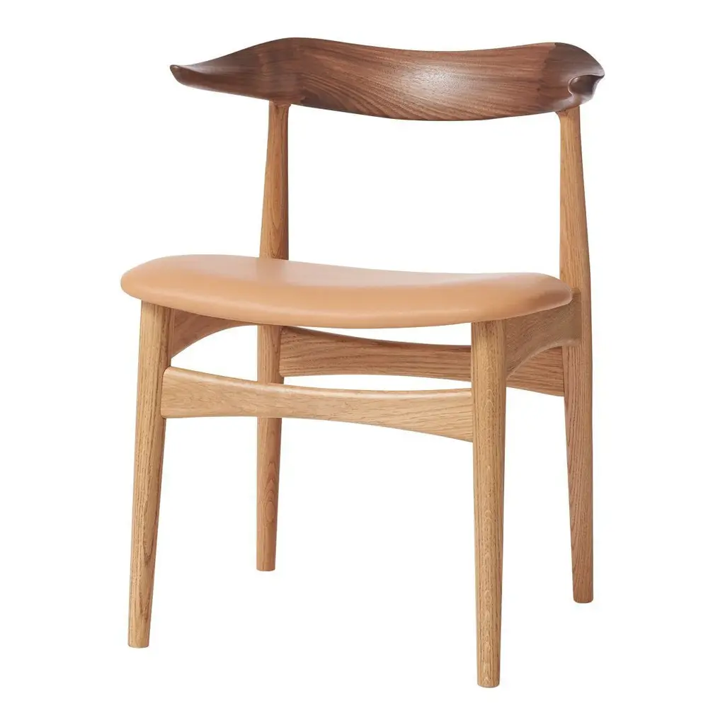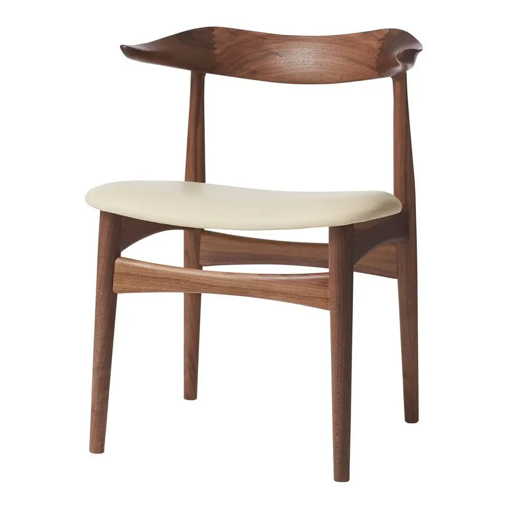 The Cow Horn Chair is an iconic 1960s chair and a sculptural masterpiece for design lovers, created by the internationally renowned Danish furniture designer, Knud Færch. The Cow Horn Chair provides exemplary seating comfort, both occupying and creating a space one of the fundamental ideas of Knud Færch's design. The beautiful mortising and complicated curved lines of the armrests make the Cow Horn Chair a genuine piece of craftsmanship, with a unique elegance and consummate finish. True to the design spirit of the 1960s, the dining chair is available in teak or a connoisseur version, in which the backrest and frame are in various types of wood. The seat is available in upholstery or the highest quality leather. Choose either an exclusive Kvadrat furnishing fabric or leather in carefully selected shades from the Warm Nordic universe. The chair is available in several exclusive types of wood.