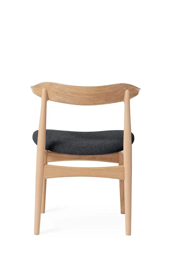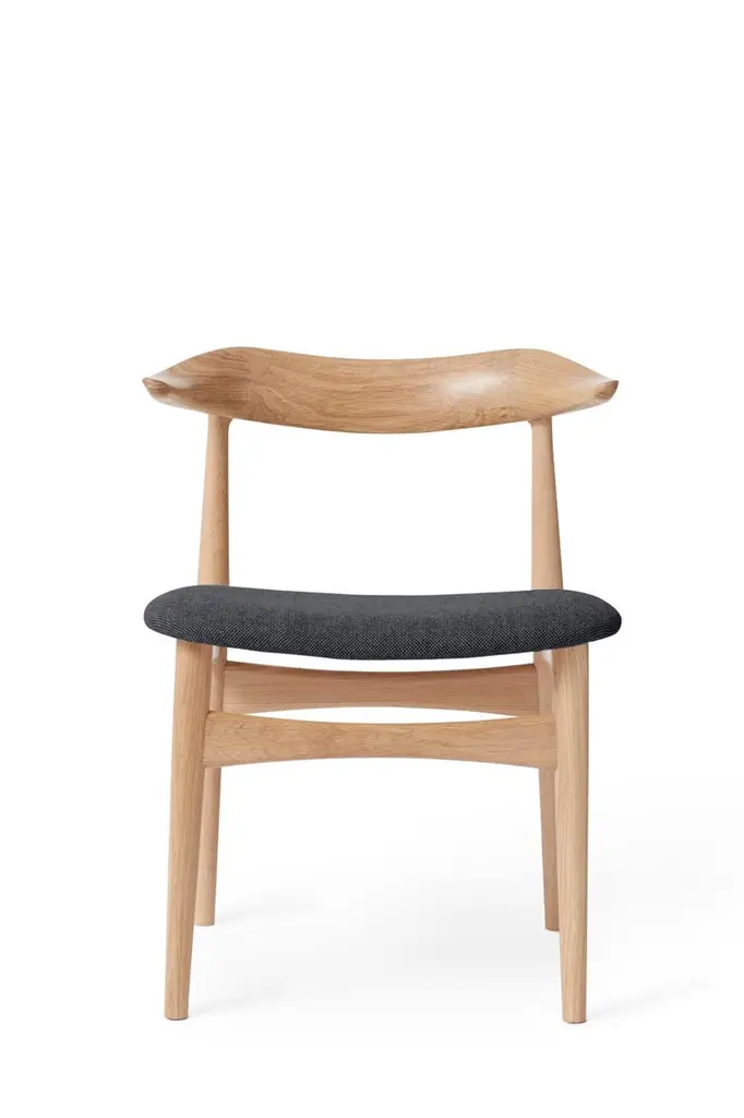 Cow horn chair oak anthracite melange by Warm NordicDimensions: D55 x W48 x H 74 cmMaterial: White oiled solid oak frame, Textile or leather upholstery.Weight: 7.5 kgAlso available in different colors and finishes. The Cow Horn Chair is an iconic 1960s chair and a sculptural masterpiece for design lovers, created by the internationally renowned Danish furniture designer, Knud Færch. The Cow Horn Chair provides exemplary seating comfort, both occupying and creating a space - one of the fundamental ideas of Knud Færch's design. The beautiful mortising and complicated curved lines of the armrests make the Cow Horn Chair a genuine piece of craftsmanship, with a unique elegance and consummate finish. True to the design spirit of the 1960s, the dining chair is available in teak or a connoisseur version, in which the backrest and frame are in various types of wood. The seat comes with upholstery in exclusive Kvadrat fabric or top quality leather. Choose either an exclusive Kvadrat furnishing fabric or leather in carefully selected shades from the Warm Nordic universe. The chair is available in several exclusive types of wood.Warm Nordic is an ambitious design brand anchored in Nordic design history and with a timeless, aesthetic style that inspires you to appreciate the little things in life. The company is the result of several years’ intense work on developing a new design brand with design history, quality and personality at its core. Warm Nordic boasts a colourful and charming universe of furniture, lamps and accessories full of personality. Our designs encapsulate the Nordic spirit, which in its essence is timeless, inclusive and warm.
