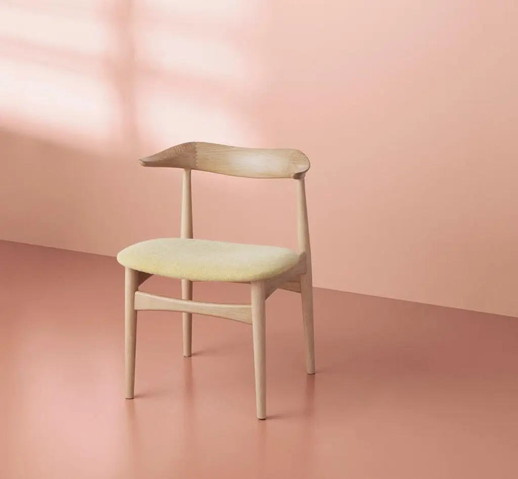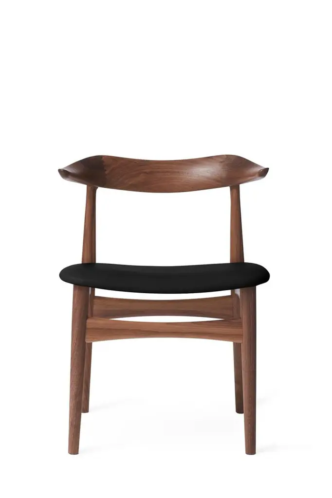 Cow Horn chair walnut black leather by Warm NordicDimensions: D 55 x W 48 x H 74 cmMaterial: Oiled solid walnut frame, Textile or leather upholstery.Weight: 7.5 kgAlso available in different colours and finishes.The Cow Horn Chair is an iconic 1960s chair and a sculptural masterpiece for design lovers, created by the internationally renowned Danish furniture designer, Knud Færch. The Cow Horn Chair provides exemplary seating comfort, both occupying and creating a space - one of the fundamental ideas of Knud Færch's design. The beautiful mortising and complicated curved lines of the armrests make the Cow Horn Chair a genuine piece of craftsmanship, with a unique elegance and consummate finish. True to the design spirit of the 1960s, the dining chair is available in teak or a connoisseur version, in which the backrest and frame are in various types of wood. The seat comes with upholstery in exclusive Kvadrat fabric or top quality leather. Choose either an exclusive Kvadrat furnishing fabric or leather in carefully selected shades from the Warm Nordic universe. The chair is available in several exclusive types of wood.Warm Nordic is an ambitious design brand anchored in Nordic design history and with a timeless, aesthetic style that inspires you to appreciate the little things in life. The company is the result of several years’ intense work on developing a new design brand with design history, quality and personality at its core. Warm Nordic boasts a colourful and charming universe of furniture, lamps and accessories full of personality. Our designs encapsulate the Nordic spirit, which in its essence is timeless, inclusive and warm.