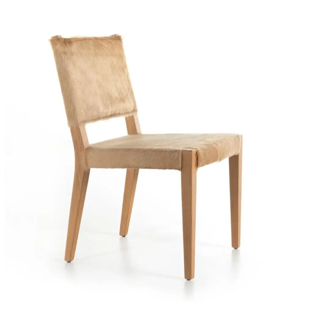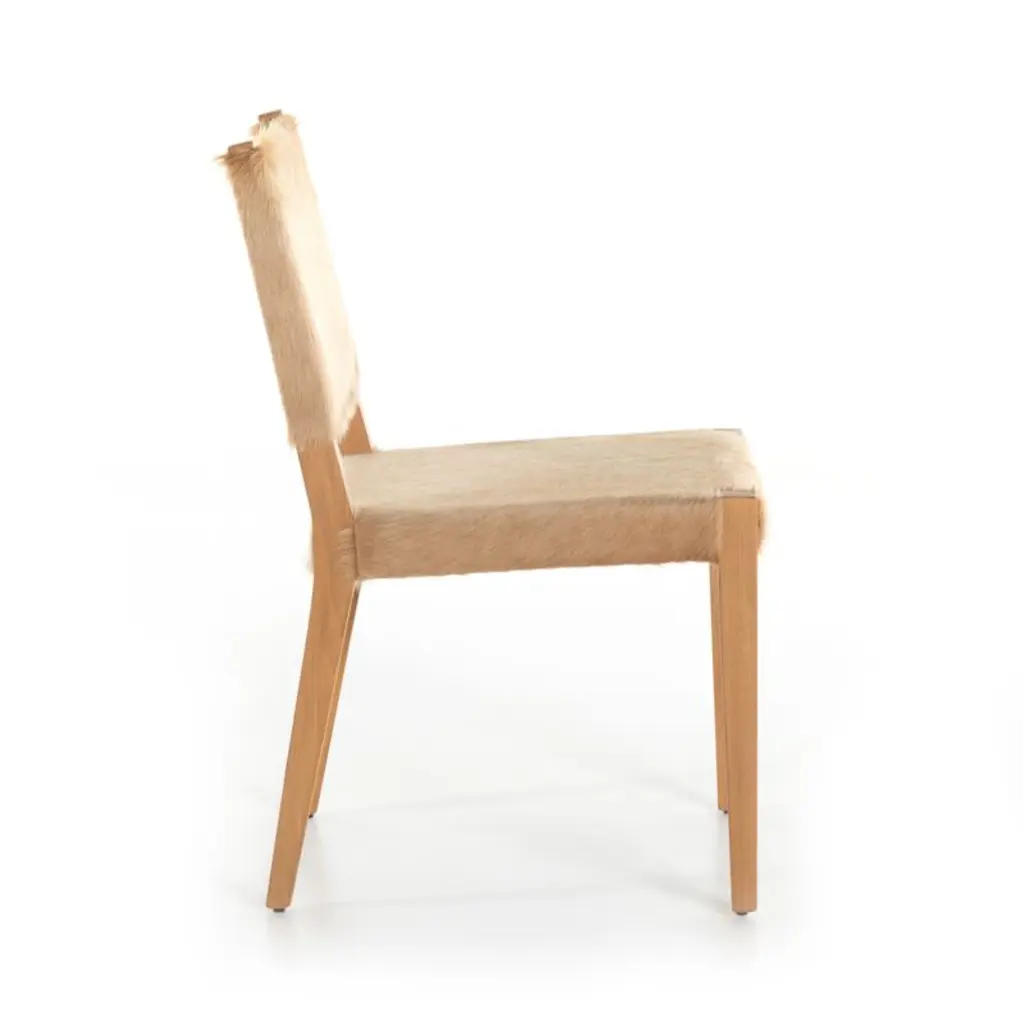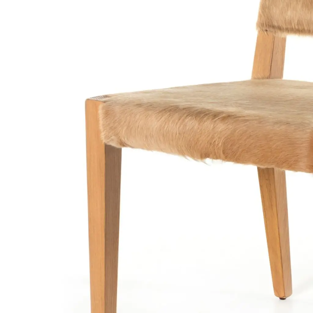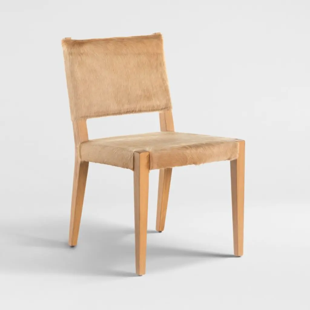 Our Cowley dining chair crafts a monochromatic look with plenty of natural texture. A sand-colored finish to the solid beech frame provides a clean-lined stage for light beige cowhide that neatly wraps the seat and back. Cowley's mix of naturally toned wood and hair-on-hide leather pairs exceptionally well with our live-edge dining tables.