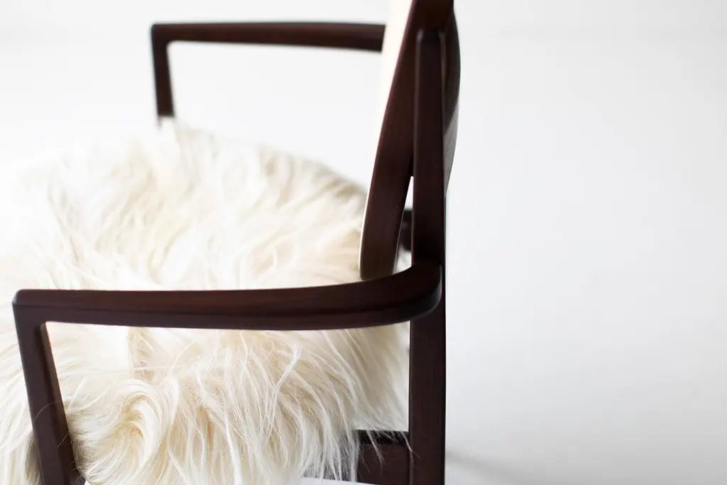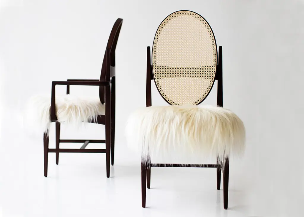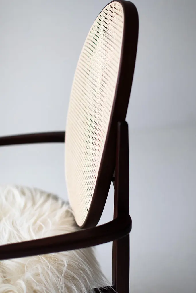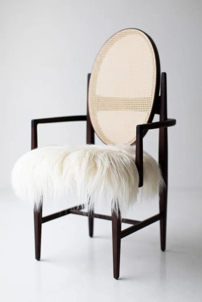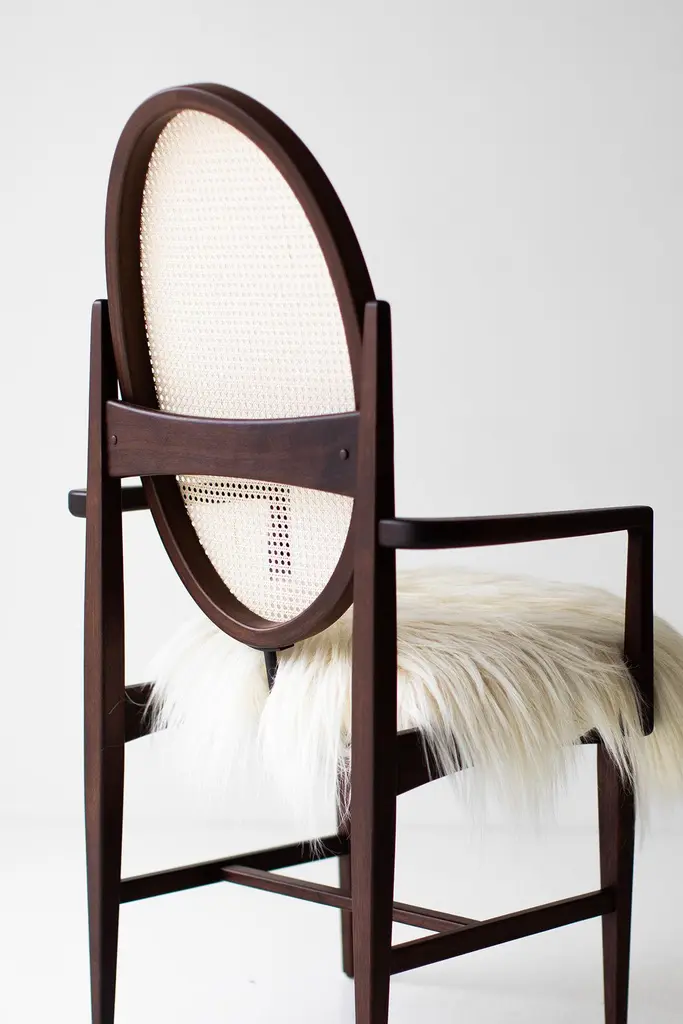 CraftAssocaites Dining Chairs, Baughman Mid Century Dining Chais, Walnut, FurThe Milo Baughman Oval Cane Back Walnut Arm Chair for Craft Associates® Furniture is expertly crafted. The chairs are shown here in solid walnut and sheepskin, but each is hand built and made to order so wood species and fabric can be customized. Craft Associates has a full fabric program available.Craft Associates® Furniture is proud each piece is made in the US. We strive to craft a product that will stand the test of time. We use the best materials and have the best craftsman in the business. We stand 100% behind our product.Designed by Milo Baughman, these dining arm chairs carry forward his legacy of clean lines, elegant forms, and functionality. It’s more than just a piece of furniture; we're proud to carry on Baughman’s enduring influence on modern design."Contemporary design at its timeless best." One of the most influential American furniture designers of the late 20th century, Milo Baughman, embodied contemporary design and adeptness in every creation. His work mainly revolved around residential furnishings. His Gallery 1 includes a variety of useful and simple contemporary pieces for the home. Drawing inspiration from fellow Californians Charles and Ray Eames, Baughman’s designs exuded a relaxed and breezy air, steering clear from ostentatious designs. His aesthetic simplicity was exceptionally profound, relying heavily on sturdy flat-bar chromed metal for seating and table frames, beautifully figured wood veneers and balanced geometric proportions. Designer: Milo BaughmanManufacturer: Craft Associates® Modern FurniturePeriod/Model: Mid Century ModernSpecs: Walnut dimensions H: 40.5"W: 23 "D: 21.5"SH: 18.25"pricingPricing to trade: YesSKU: CraftAssocaites Dining Chairs, Baughman Mid Century Dining Chais, Walnut, Fur