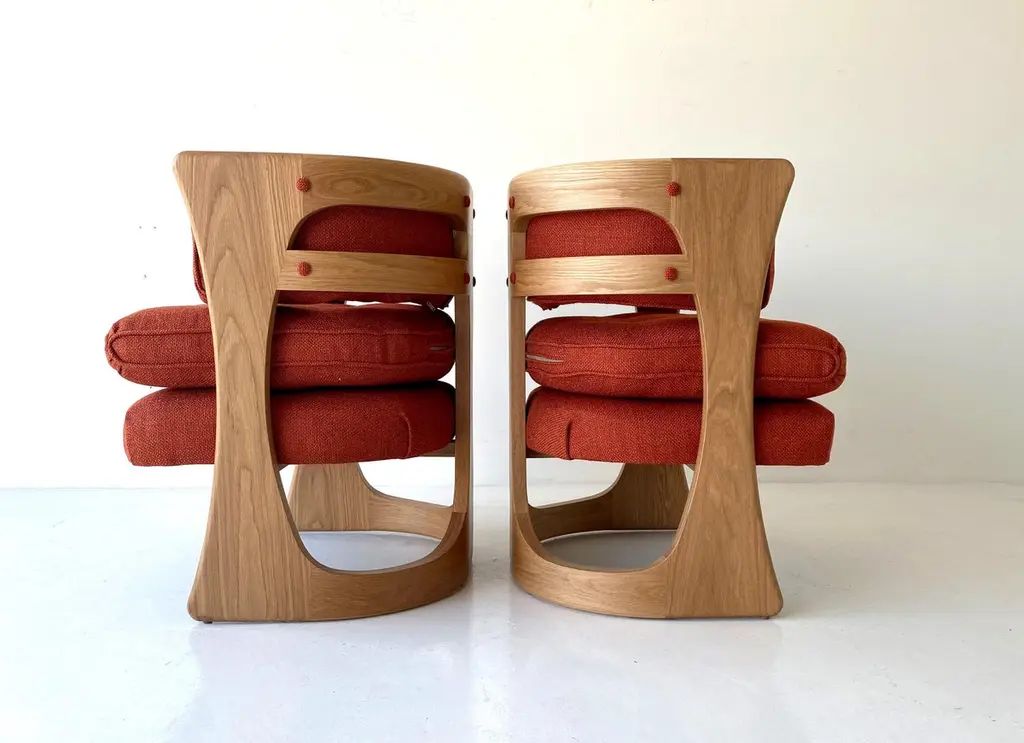 Modern Upholstered Dining Chairs, Barricas, OakThese Modern Upholstered Dining Chairs are part of the "Barricas Series" for Craft Associates Furniture. Each are expertly handcrafted in Oak and fabric. Each chair is constructed by our talented team by hand per client. The chairs are finished with a commercial grade matte finish that is durable and beautiful. Craft Associates Furniture is proud each piece is made in the US. They strive to craft a product that will stand the test of time. They use the best materials and have the best craftsman in the business. We stand 100% behind this product. All pieces are available in: Teak, walnut or Oak. Designer: Laura Trenchard Manufacturer: Craft Associates Modern Furniture Period/Model: Modern Specs: Oak, Fabric Dimensions :H: 30.25" (76.84cm) W: 25.25" (64.14cm) D: 22" (55.88cm).SH: 20" (50.8cm)SW: 23" (58.42cm)SD: 20.5" (52.07cm)