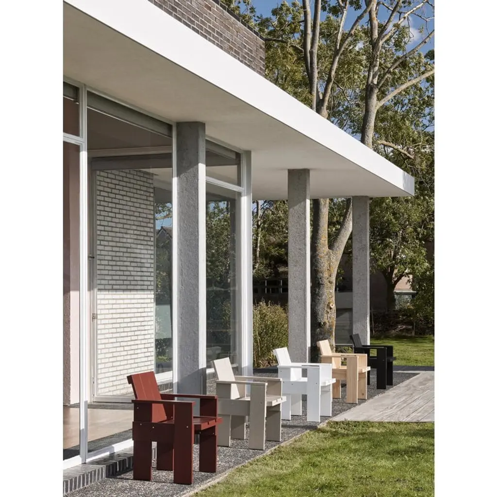 The Crate dining chair is part of HAY’s collection of wooden outdoor furniture. The dining chair gets its sturdy character from clean and balanced lines. The deep seat and tilted backrest ensure not only a stylish appearance but also ultimate comfort, which can be even further improved with plush seat cushions, sold separately. The Crate terrace chair is based on the original chair designed by Dutch architect and designer Gerrit Thomas Rietveld in 1934. At that time, the chair was made from leftover wooden shipping crates, but the Rietveld Originals and HAY reinterpretation uses lacquered pine as the material. Finished with a weatherproof coating, the Crate dining chair is ideal for outdoor spaces from the terrace to the garden and balcony.