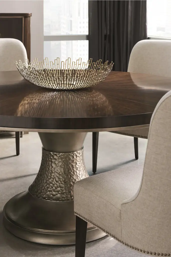 For a clean, classic look around modern or transitional dining tables, the Streamline Side Chair is hard to beat. Fully upholstered in a neutral fabric, the chair has tapered saber wood legs that are finished in Bourbon Glaze to a high sheen. Its tight seat is completed with a band of brass nails at the base.