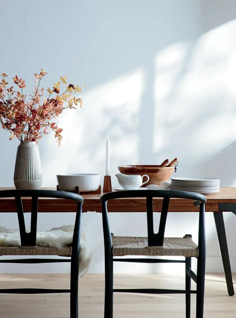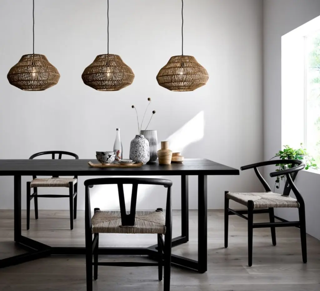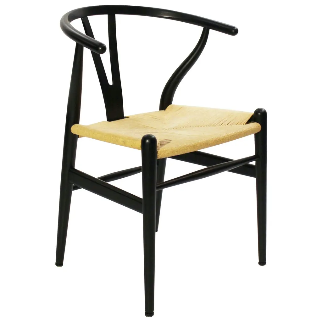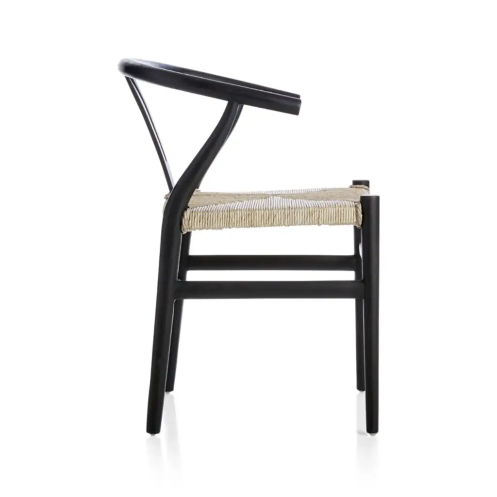Inspired by traditional Chinese design, this modern design classic goes all natural for sophisticated dining. Fashioned with its signature Y-back and semi-circular arms, the dining chair gets a fresh dose of texture with a woven synthetic wicker seat on a frame of black-finished teak.