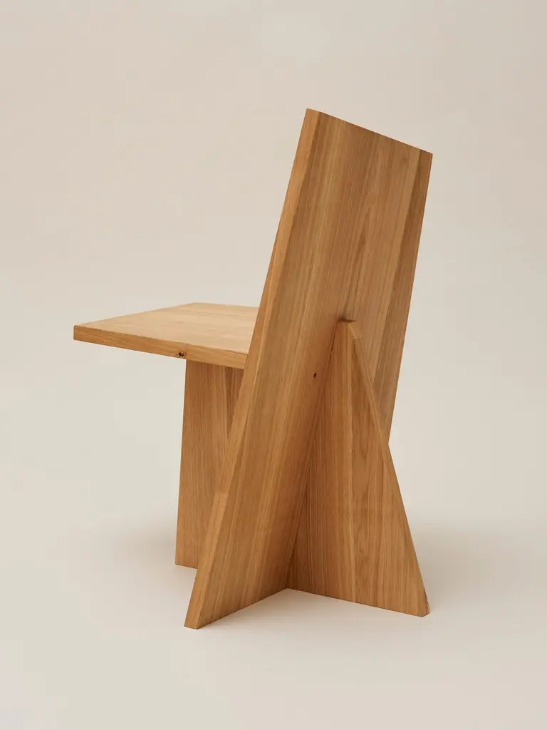 Crooked dining chair by Nazara LazaroDimensions: H 86 cm x W 53 cm x D 58 cmMaterials: Massive oak with oil wax surfaceAlso available in natural massive oak, walnut, and white lacquered wood.The Crooked Collection is an ongoing series of asymmetric and angular furniture pieces. It is based on a very simple concept: the absence of 90° angles and symmetries. Every piece is made to order, using hand glued timber from selected oak slabs, planed and finished with hard wax oil. The design remains as pure as possible by keeping all the joins hidden. The use of massive oak gives a very premium finish and provides a warm contrast to the angular lines.