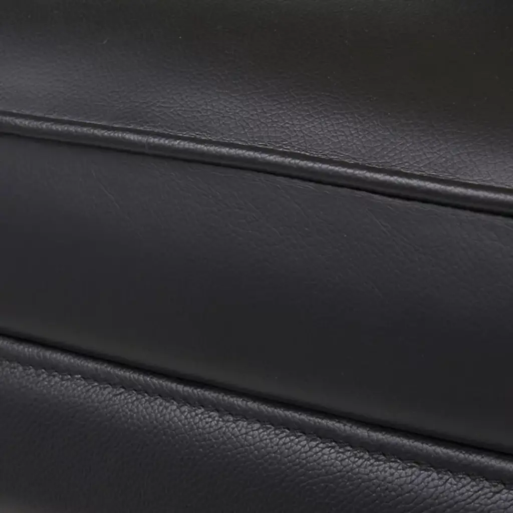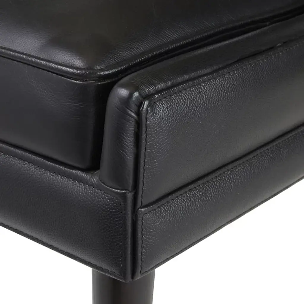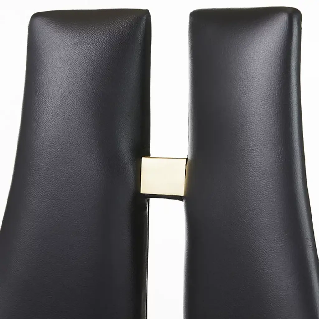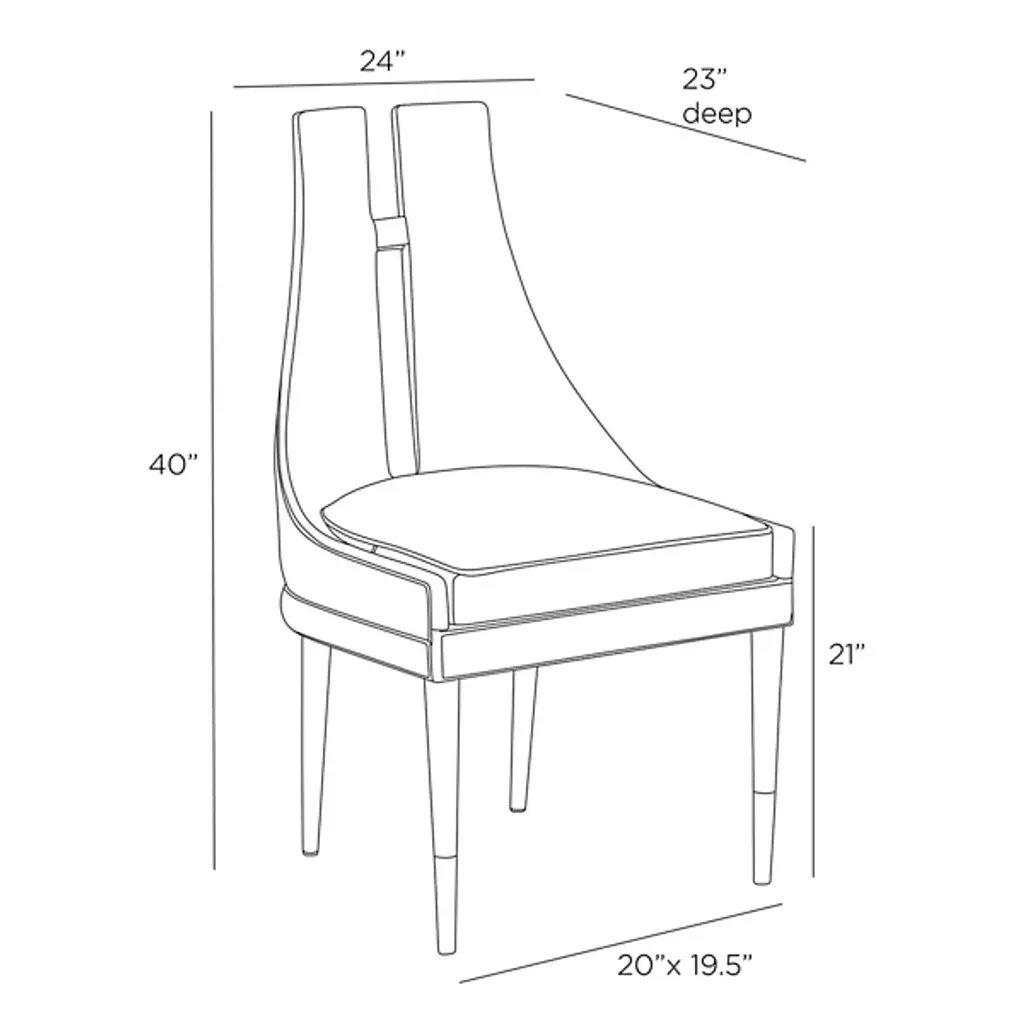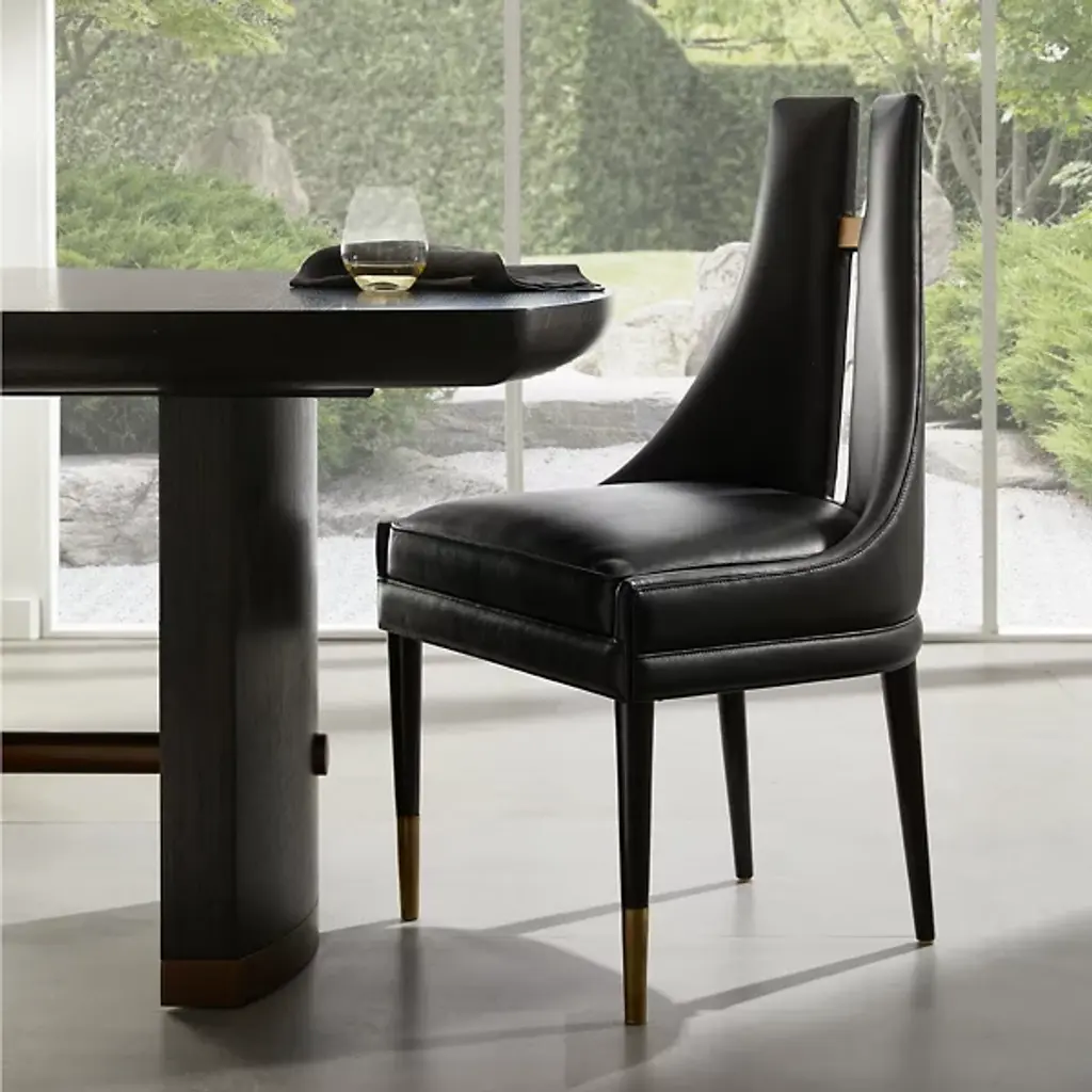 The Crowley Dining Chair from Arteriors perfectly balances masculine and feminine elements with its tall, swooping back and curving black leather upholstery. A vertical gap, reminiscent of an open-backed dress, adds a touch of elegance. Made in Vietnam, this chair features polished antique brass joinery, enhancing its transitional style. The slender ebony beechwood legs are tipped with brass ferrules, adding refinement. Subtle variations in the leather ensure each piece is unique, making this chair a distinct addition to any space.