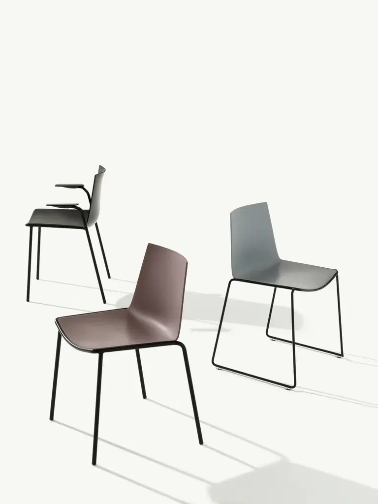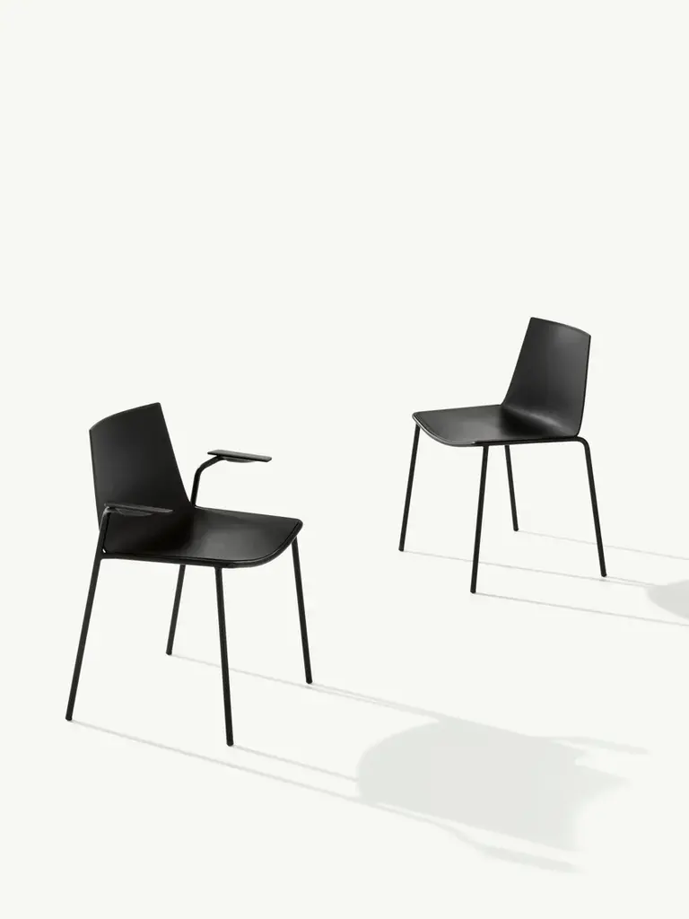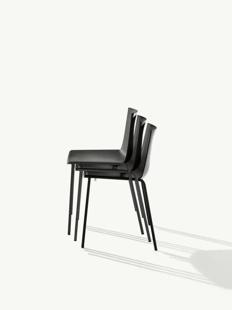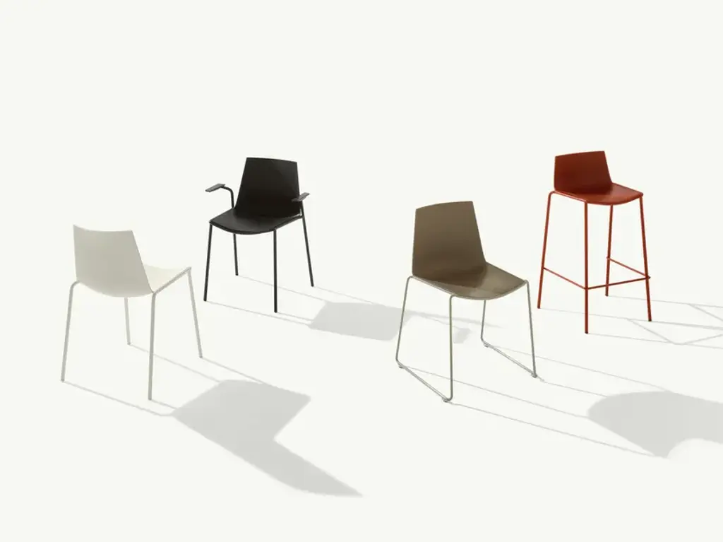 Chair with steel frame, 4 legs. Polypropylene shell.Cuba is a family of seats in steel and polypropylene made using the injected air-moulding technology, born for the public market. Simple and sober lines lend Cuba a universal character, suitable for any context, indoor and outdoor. Steel twits and turns as a frame around the seat, with a non-usual technique of metal folding.The seat is available in 6 different colours: white, red, gray, clay, black and pistachio.The whole Cuba range is stackable.