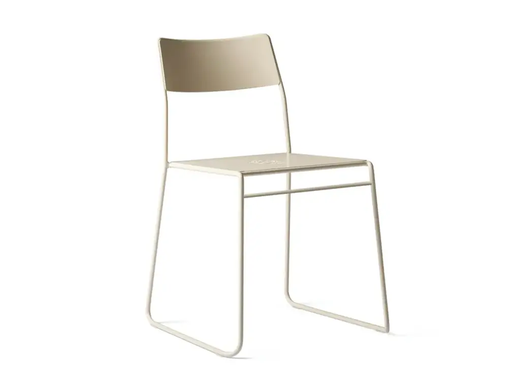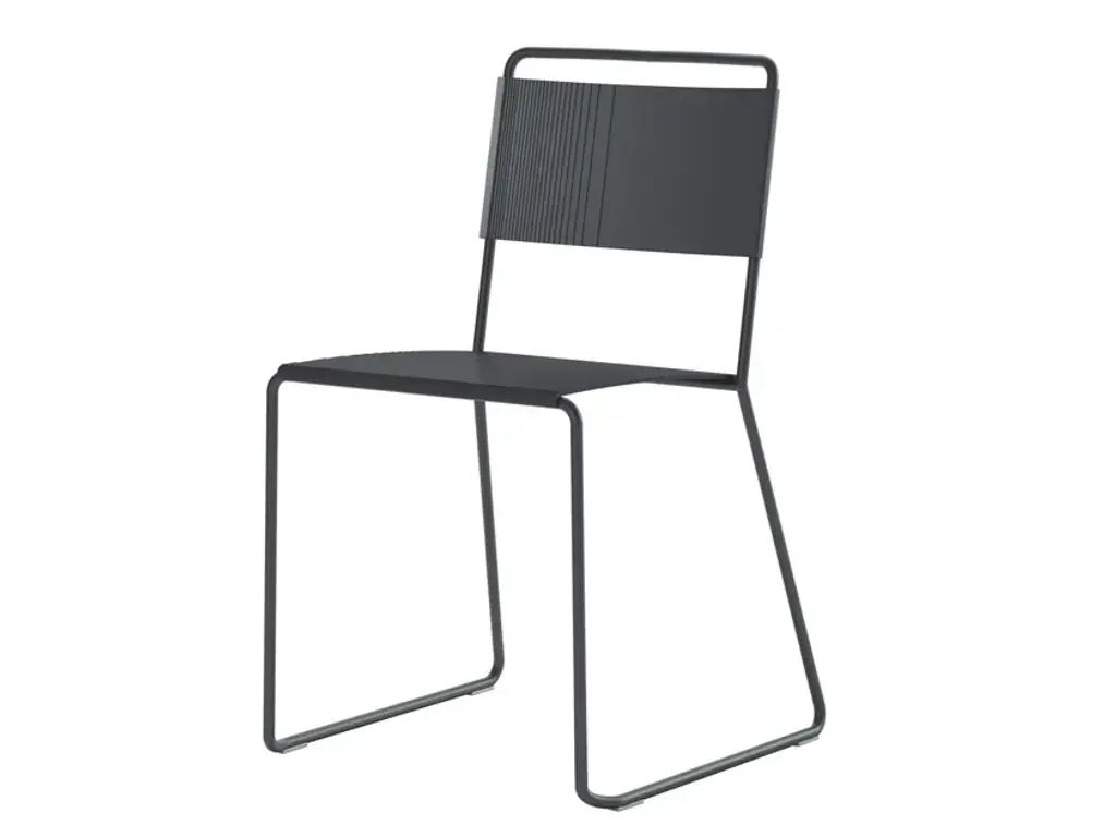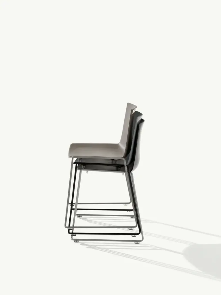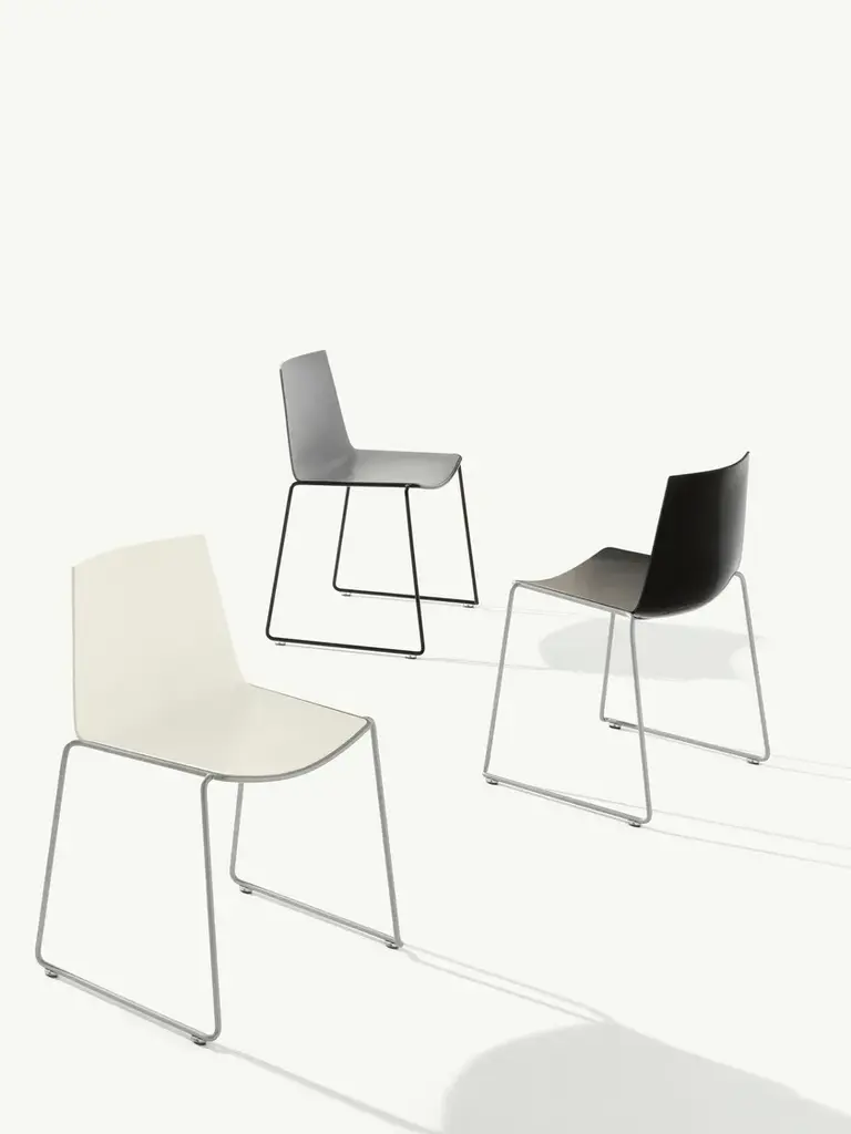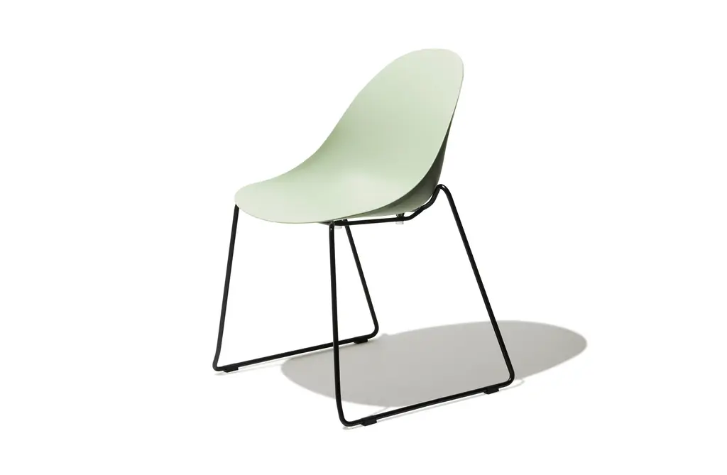 Chair with sled steel frame. Polypropylene shell.Cuba is a family of seats in steel and polypropylene made using the injected air-moulding technology, born for the public market. Simple and sober lines lend Cuba a universal character, suitable for any context, indoor and outdoor. Steel twits and turns as a frame around the seat, with a non-usual technique of metal folding.The seat is available in 6 different colours: white, red, gray, clay, black and pistachio.The whole Cuba range is stackable.