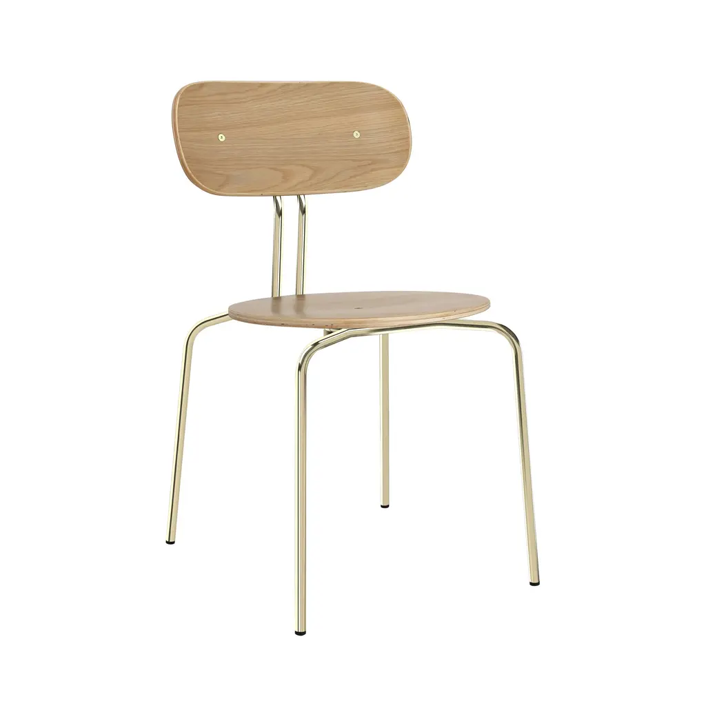 The Curious Chair is a stackable seating option crafted from oak veneer, available with brass or black legs. Designed by Luigi Vittorio Cittadini, it offers an optional seat cushion in 17 colors of 100% recycled Horizons fabric. This chair is suitable for various settings, including dining areas, dressing tables, and living rooms.