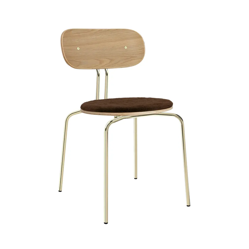 The Curious Chair is a stackable seating option crafted from oak veneer, available with brass or black legs. Designed by Luigi Vittorio Cittadini, it offers an optional seat cushion in 17 colors of 100% recycled Horizons fabric. This chair is suitable for various settings, including dining areas, dressing tables, and living rooms.