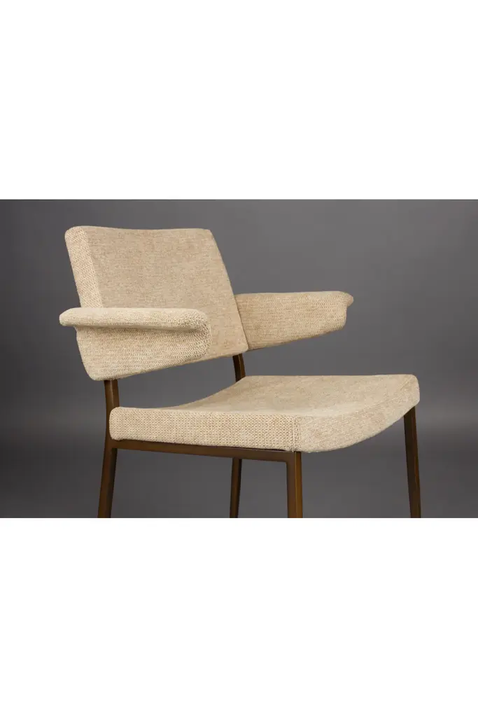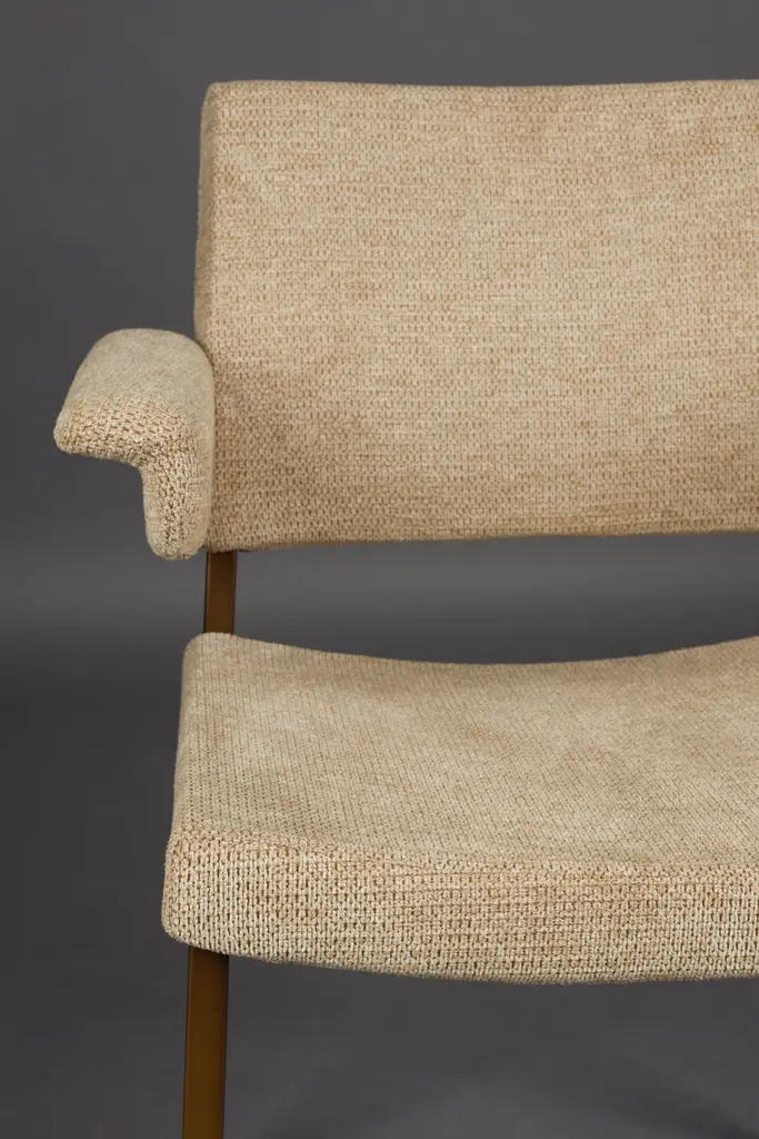 Create a warm fifties vibe in your dining room with the Dutchbone Portland. The first thing you’ll notice about this dining chair is its backrest with curved armrests, reminiscent of wings. Combined with the gently curved seat, it offers an exceptionally comfortable sitting experience. The soft, coarsely woven upholstery adds a playful contrast to the frame. Yet, the antique finish on the metal ties both materials together beautifully, resulting in a warm, cohesive design.