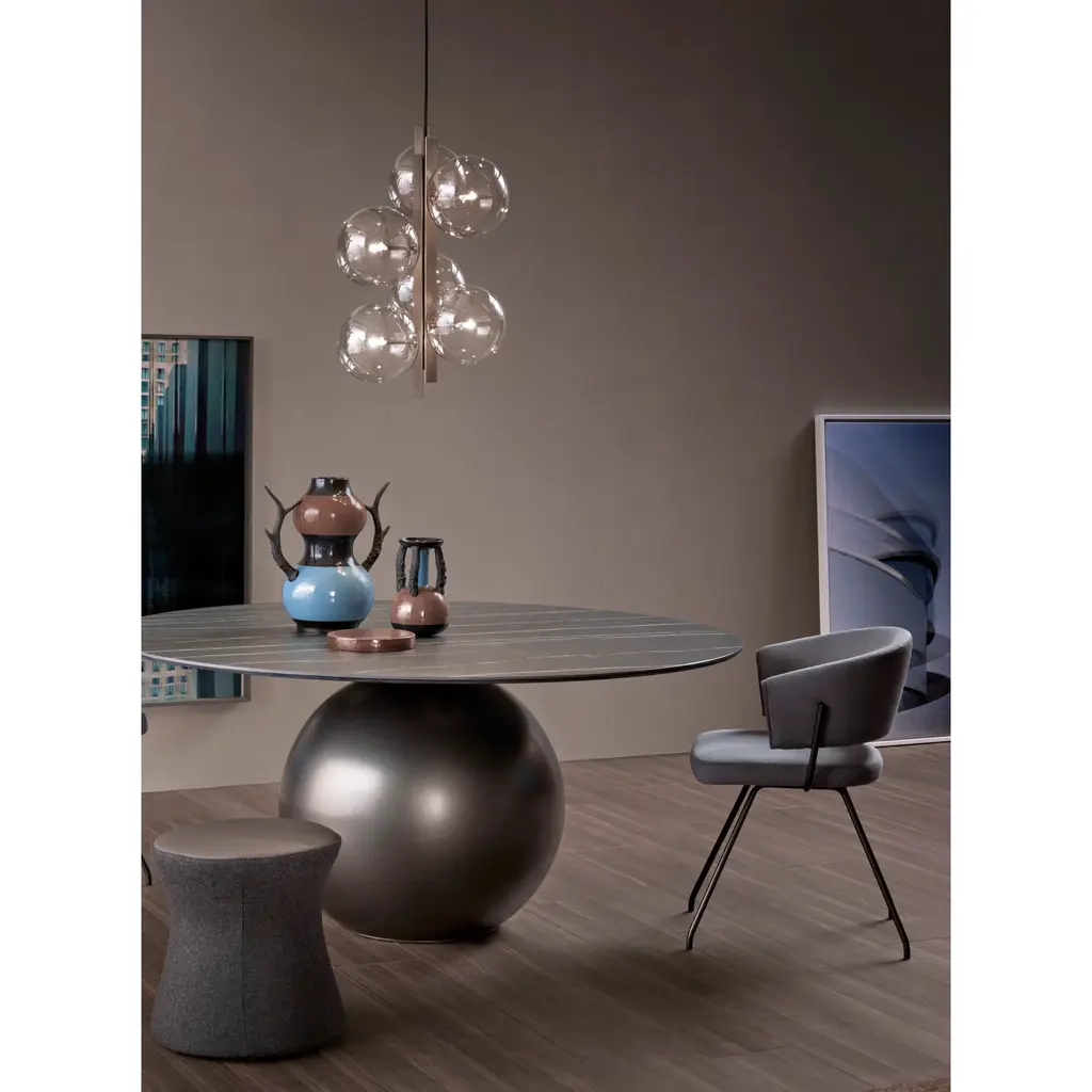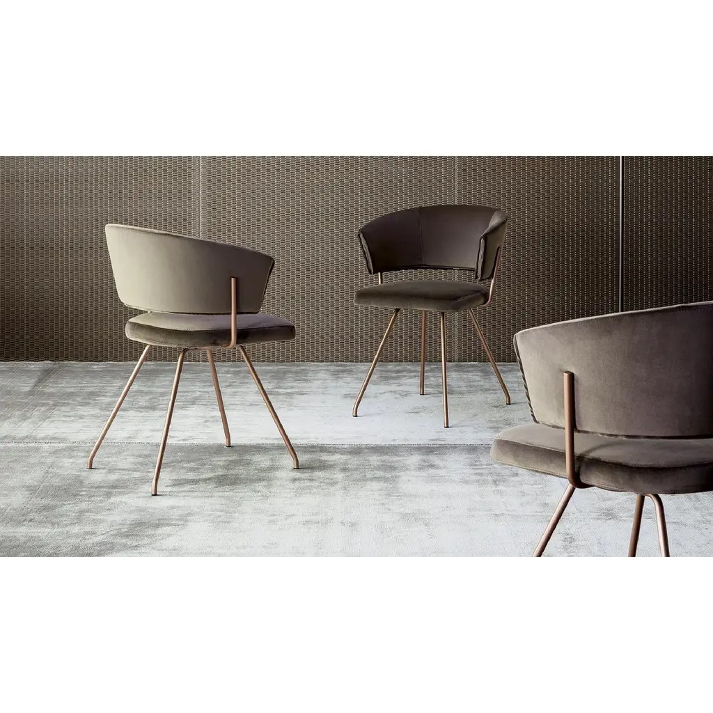The assembly of curved shapes and simple tubular metal elements creates a balanced shape, which is ideal both in residential settings and in smart contract environments such as offices, waiting rooms and hotel lobbies. The main characteristic of Bahia is the curved backrest that extends forward in a single line, allowing the arms to rest freely while enveloping the user's back for maximum comfort. Comfortable from the first glance, thanks to its organic shapes, the collection is also characterized by slender legs in metal, flexing outwardly: and the frame, thin but rigorous, that highlights through contrast the sinuousness of the backrest and seat. The Bahia dining chair is upholstered in leather, eco-leather or fabric.