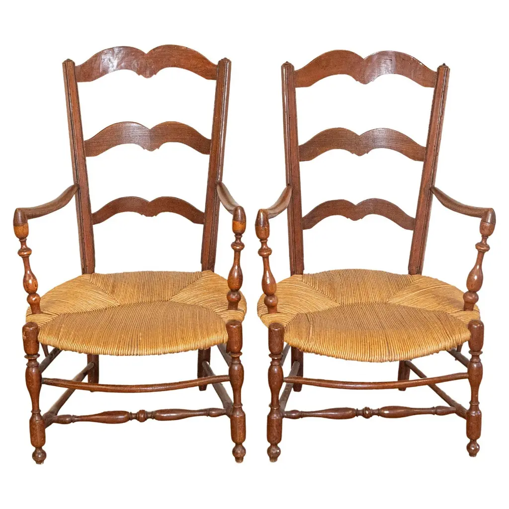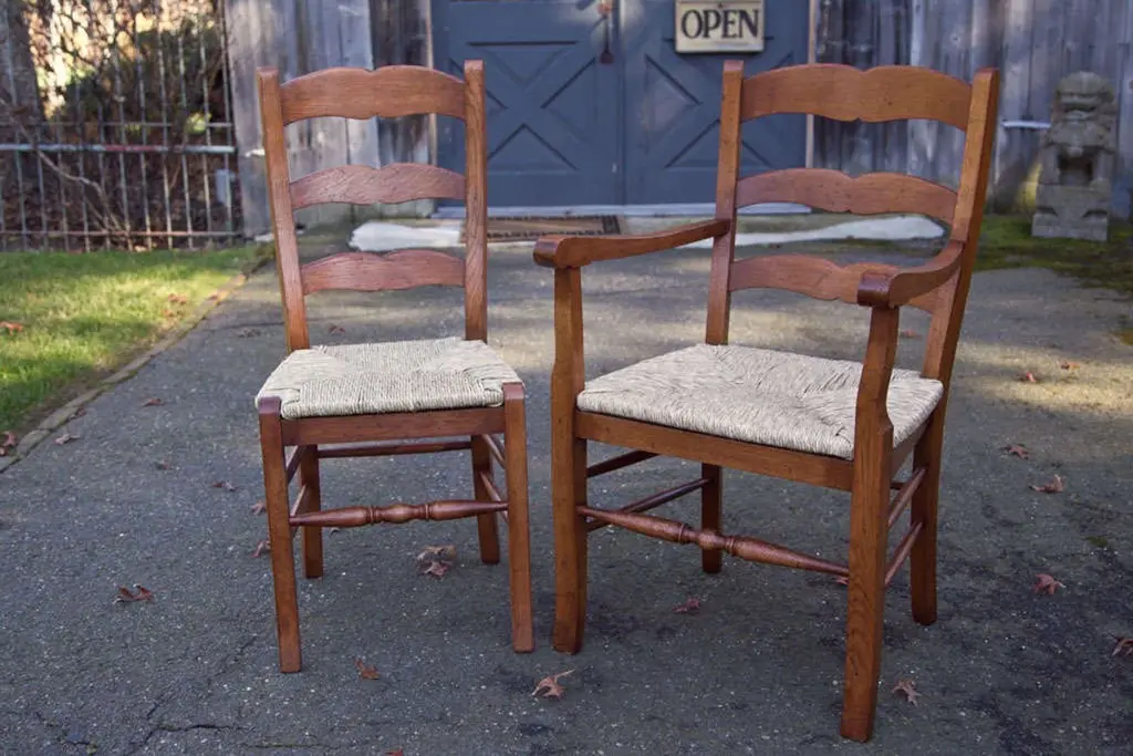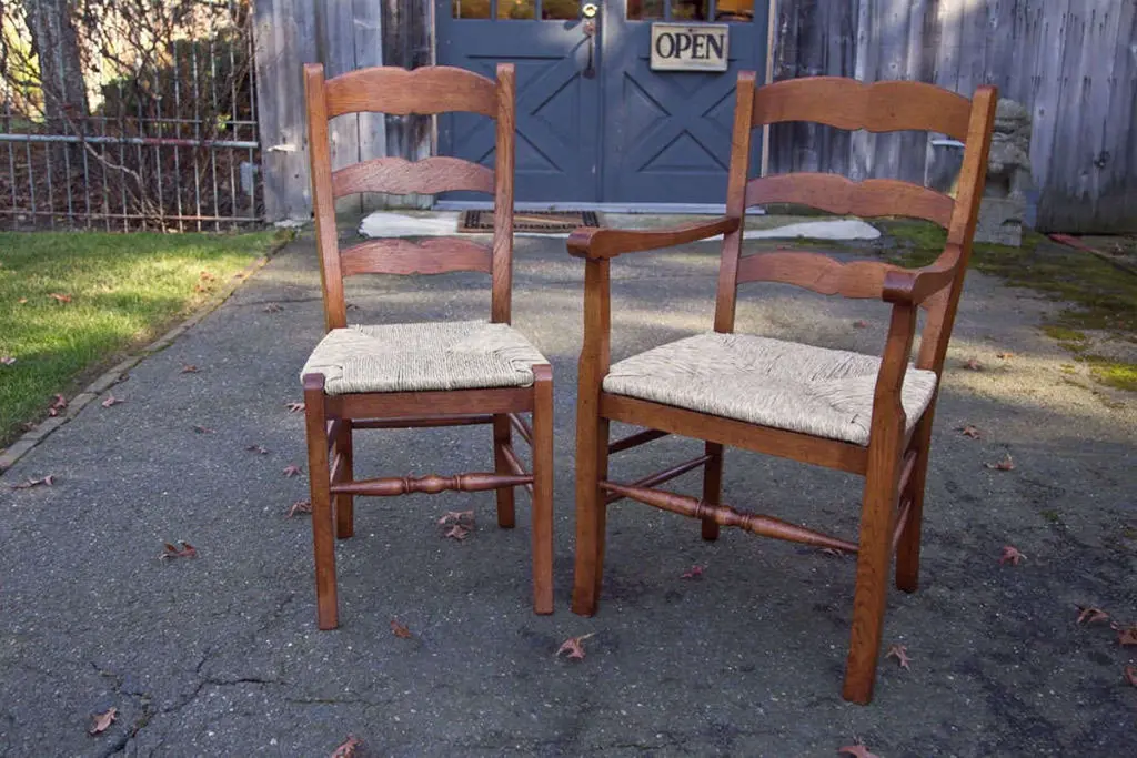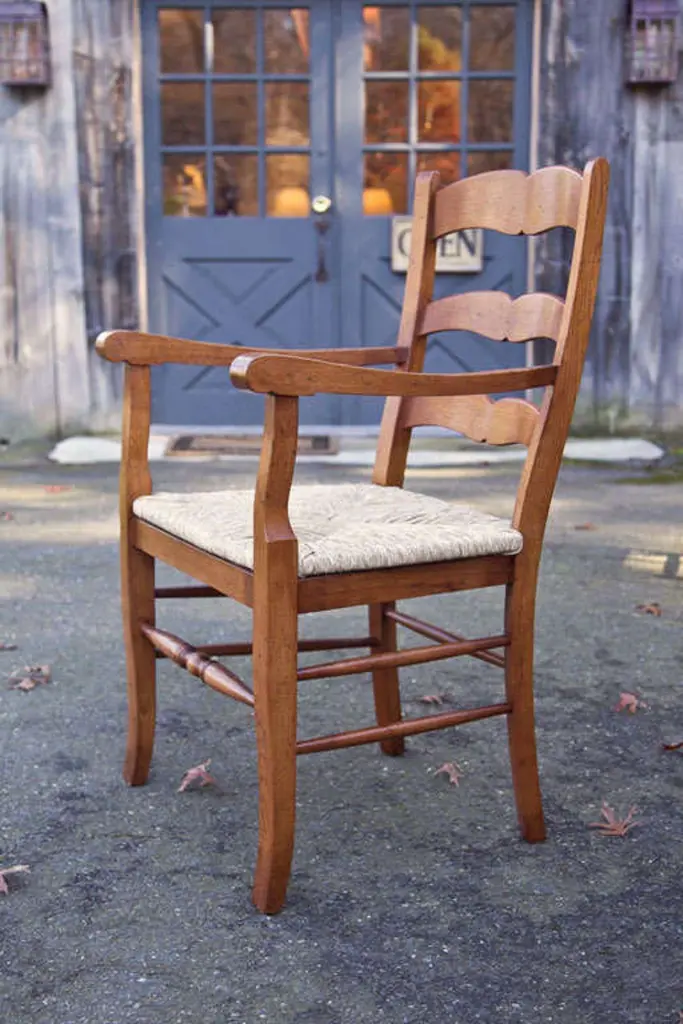 These chairs, constructed in sturdy oak, but finished in a fruitwood stain offer the best of both worlds: Handsome French country style and solid, substantial construction. The rush slip seats are a classic touch, but can be over upholstered for a more finished appearance.The armchair, slightly larger than the side chair measures 38" high, 22" deep and 23" wide. The highest point on the arm is 28".