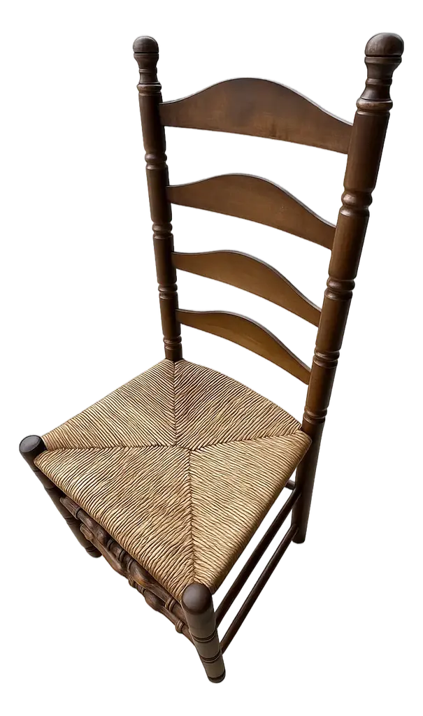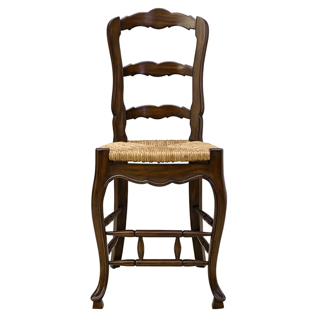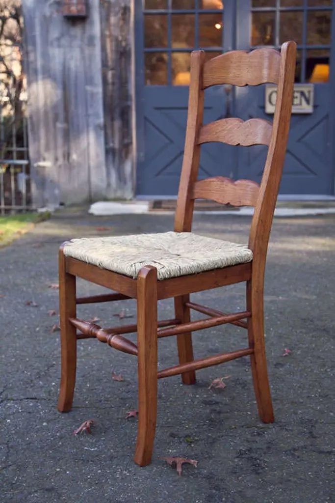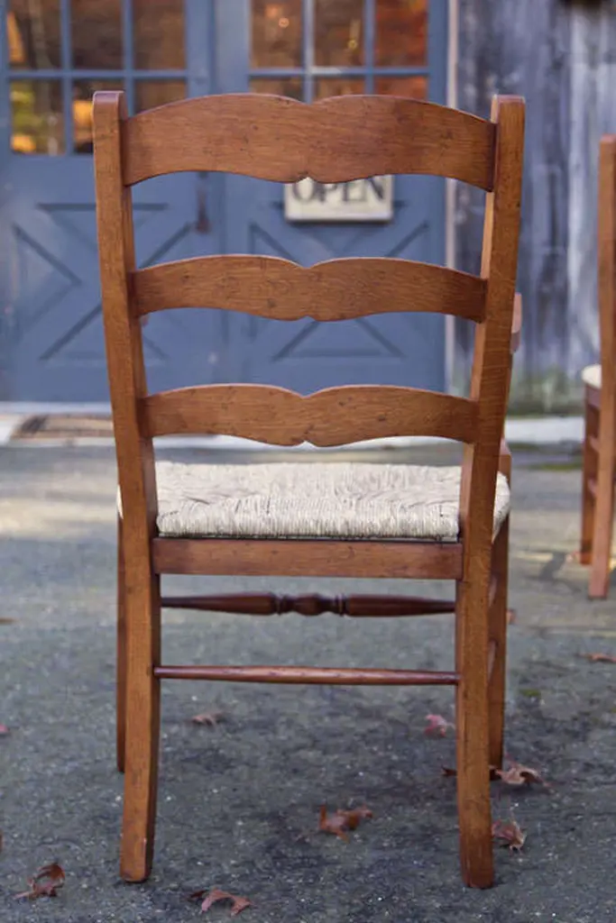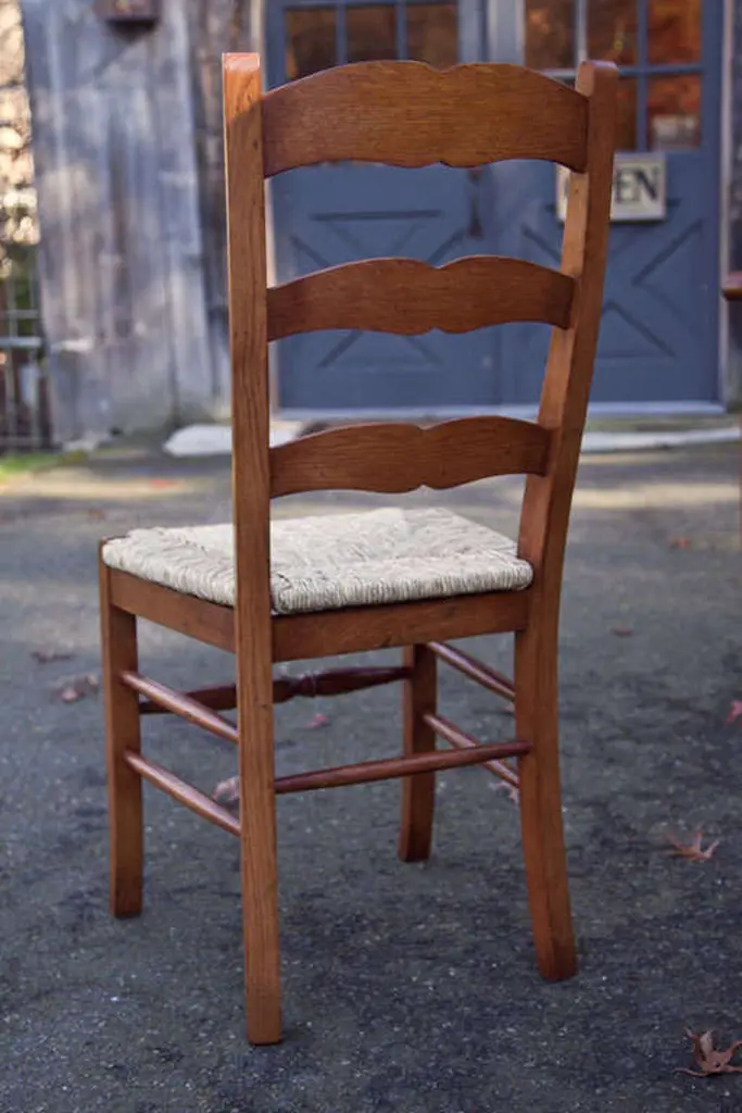These chairs, constructed in sturdy oak, but finished in a fruitwood stain offer the best of both worlds: Handsome French country style and solid, substantial construction. The rush slip seats are a classic touch, but can be over upholstered for a more finished appearance.The armchair, slightly larger than the side chair measures 38" high, 22" deep and 23" wide. The highest point on the arm is 28".