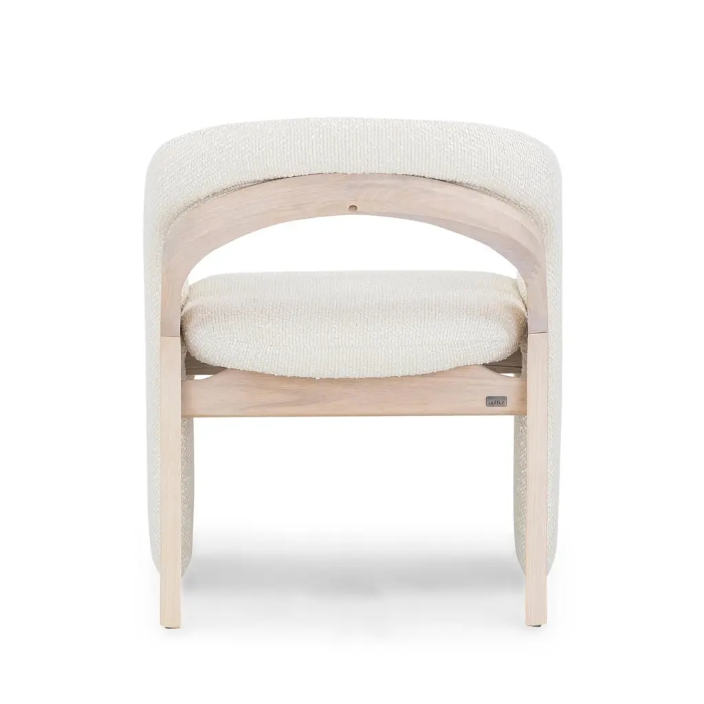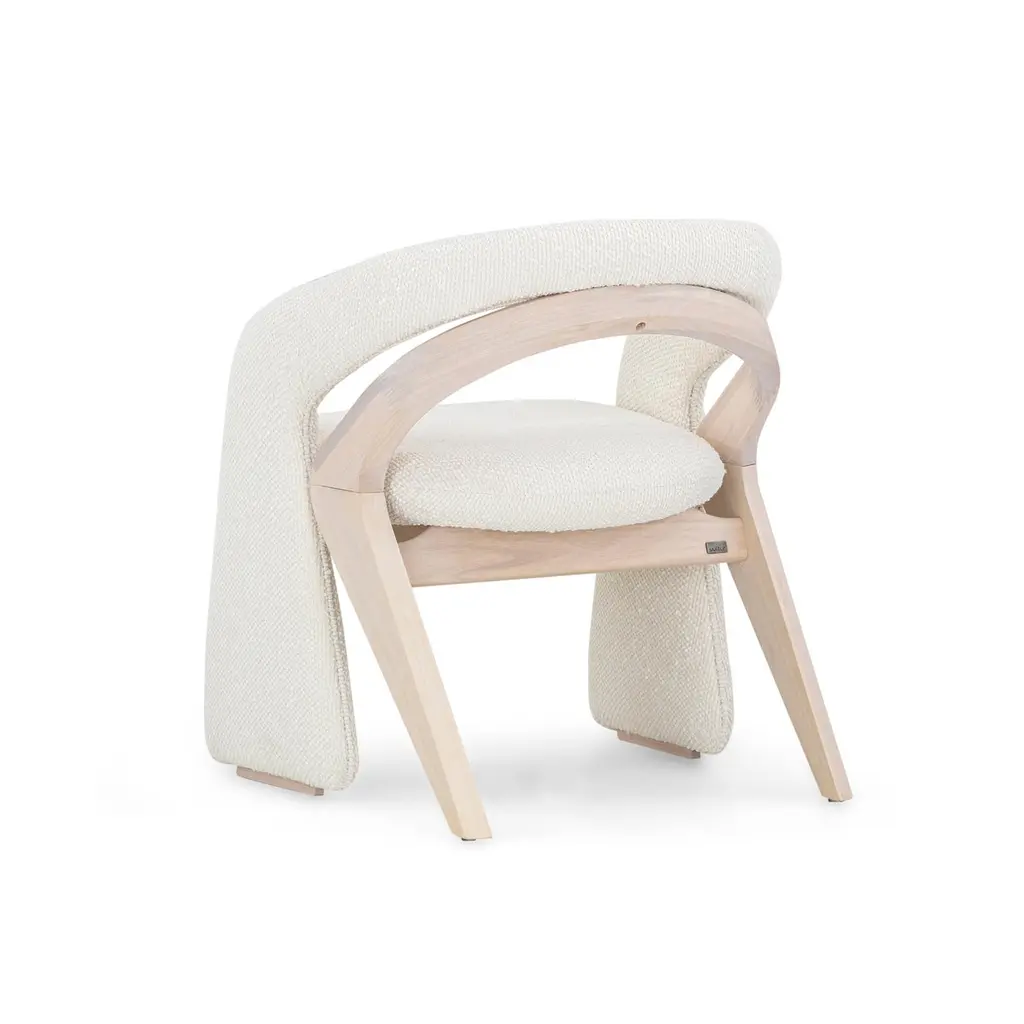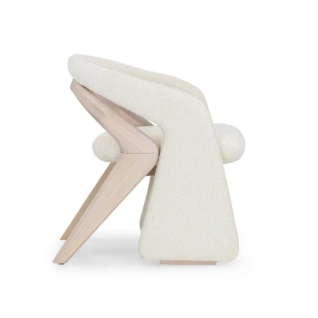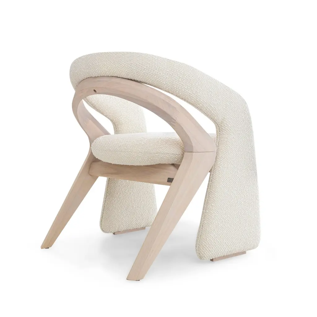 An Olga Scandinavian Modern style dining chair designed by Aciole Félix For Uultis, with Dover Oak whitewash finish, upholstered in white boucle fabric. The Olga dining chair is a bold yet refined addition to any modern space, seamlessly blending style and function. Designed with a striking open-back silhouette, this piece features a Dover Oak whitewashed frame, giving a subtle nod to natural wood grains while maintaining a contemporary aesthetic. Upholstered in plush white boucle fabric, the Olga chair brings a soft, textured touch to your dining or office setup. The interplay between the wood’s minimalist curves and the fabric’s cozy allure creates a harmonious look that exudes elegance and comfort.Perfect for dining areas, the Olga chair works exceptionally well at the head of the table, adding a statement of sophistication. Pair it with Cappio chairs to form a cohesive yet dynamic dining set, where Olga anchors the ends and Cappio lines the sides. Beyond the dining room, this versatile chair transitions beautifully to home offices or living spaces, offering a comfortable seating option for work or relaxation. Its ergonomically curved back and padded seat ensure extended comfort, while the durable frame promises long-lasting use.Ideal for contemporary interiors with daring design themes, the Olga chair is delivered fully assembled for immediate enjoyment. Crafted with environmentally conscious materials, it’s a sustainable choice for homes or commercial spaces seeking a blend of modernity and warmth.