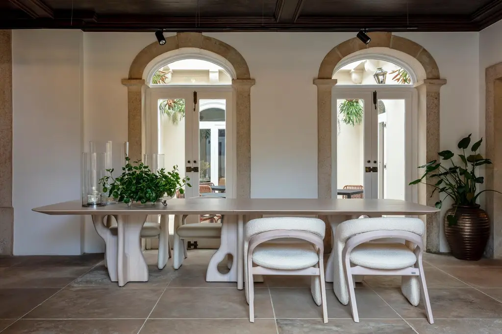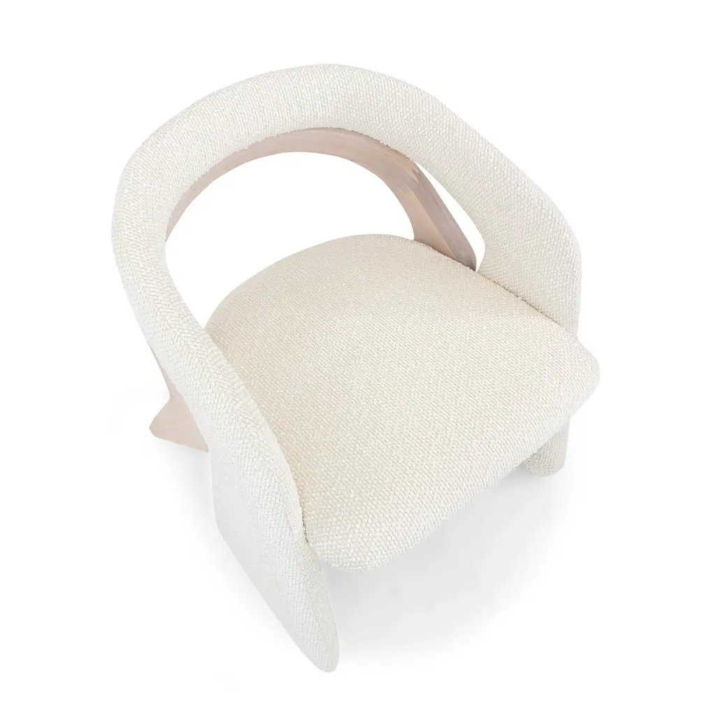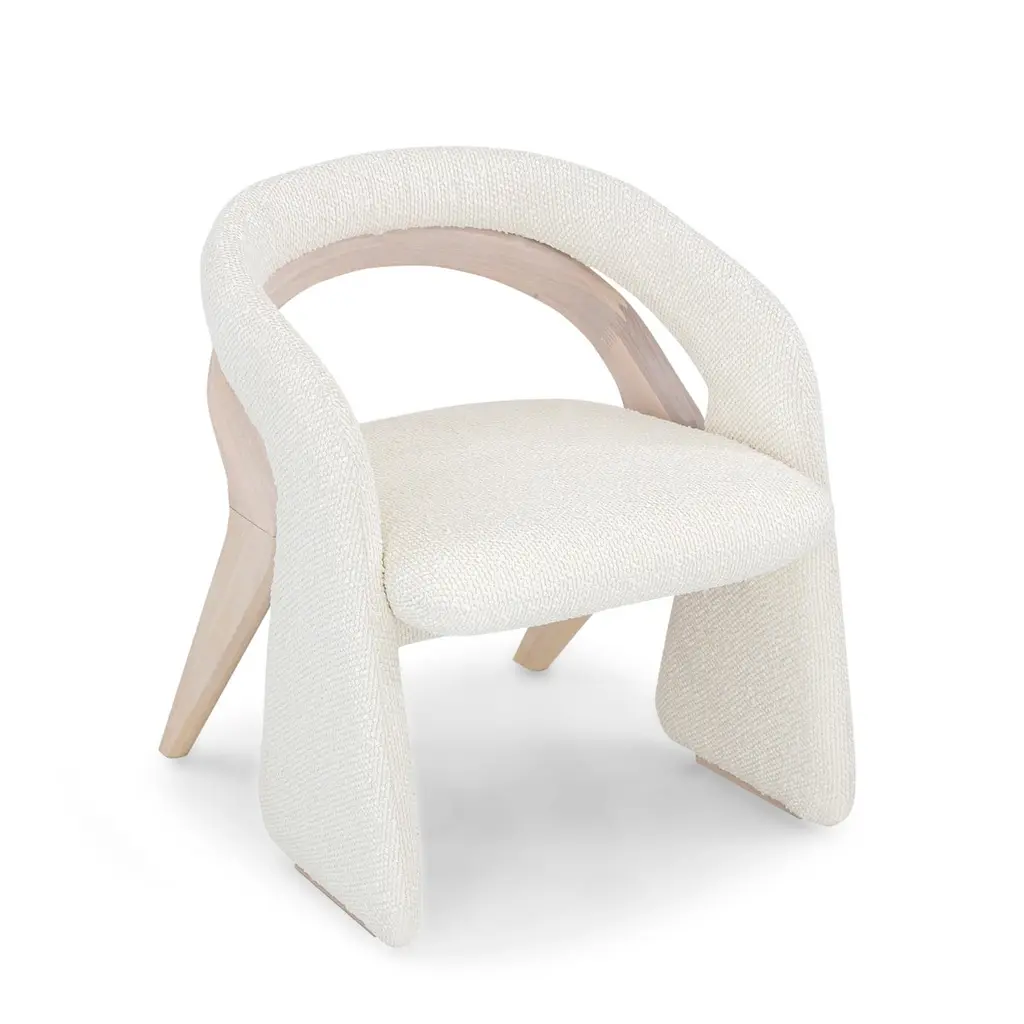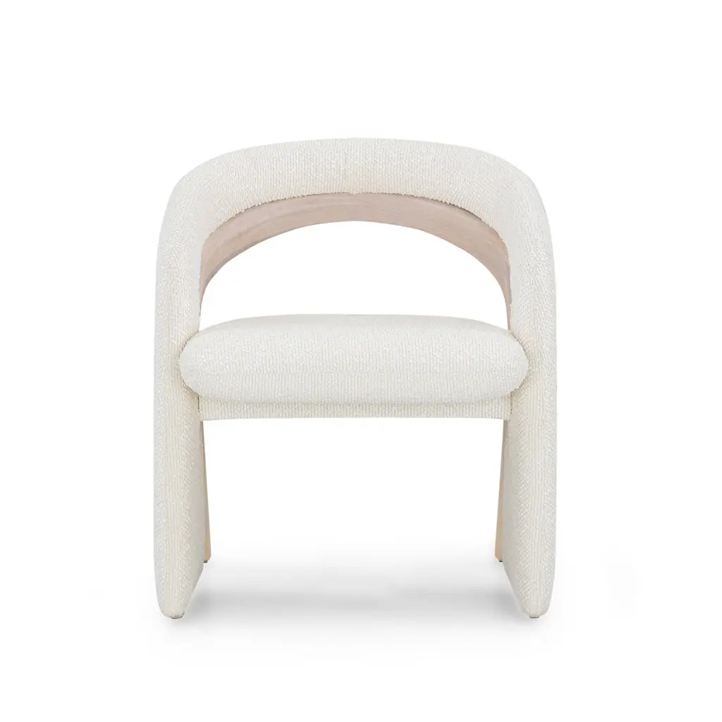 An Olga Scandinavian Modern style dining chair designed by Aciole Félix For Uultis, with Dover Oak whitewash finish, upholstered in white boucle fabric. The Olga dining chair is a bold yet refined addition to any modern space, seamlessly blending style and function. Designed with a striking open-back silhouette, this piece features a Dover Oak whitewashed frame, giving a subtle nod to natural wood grains while maintaining a contemporary aesthetic. Upholstered in plush white boucle fabric, the Olga chair brings a soft, textured touch to your dining or office setup. The interplay between the wood’s minimalist curves and the fabric’s cozy allure creates a harmonious look that exudes elegance and comfort.Perfect for dining areas, the Olga chair works exceptionally well at the head of the table, adding a statement of sophistication. Pair it with Cappio chairs to form a cohesive yet dynamic dining set, where Olga anchors the ends and Cappio lines the sides. Beyond the dining room, this versatile chair transitions beautifully to home offices or living spaces, offering a comfortable seating option for work or relaxation. Its ergonomically curved back and padded seat ensure extended comfort, while the durable frame promises long-lasting use.Ideal for contemporary interiors with daring design themes, the Olga chair is delivered fully assembled for immediate enjoyment. Crafted with environmentally conscious materials, it’s a sustainable choice for homes or commercial spaces seeking a blend of modernity and warmth.