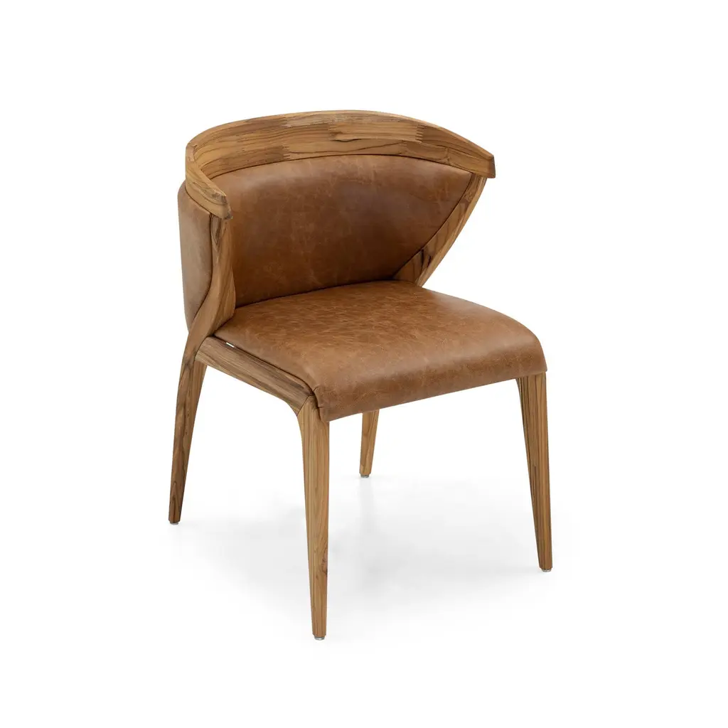 A Mat teak wood dining chair designed by Sérgio Batista for Uultis, with distressed caramel upholstery. The Mat dining chair seamlessly blends modern design with the warmth of natural teak wood and distressed caramel upholstery. Each chair is uniquely crafted, with the natural variations in teak ensuring no two pieces are alike. The wood is finished with a matte, velvety teak touch, preserving its natural texture and delivering a soft, tactile experience.Designed for both comfort and style, the chair’s upholstered seat and gently curved backrest make it ideal for long, relaxed dinners or casual gatherings. Its versatile design allows it to function as a statement piece in a dining room or as a sophisticated accent chair in a living space or office. Whether paired with a rustic teak dining table or contrasted with contemporary materials, the Mat chair brings character and elegance to any environment.Crafted with sustainability in mind, the Mat chair uses eco-friendly materials and finishes. Fully assembled, it’s ready to enhance your space from the moment it arrives. The combination of comfort, craftsmanship, and environmentally conscious design makes it a standout addition to any home.