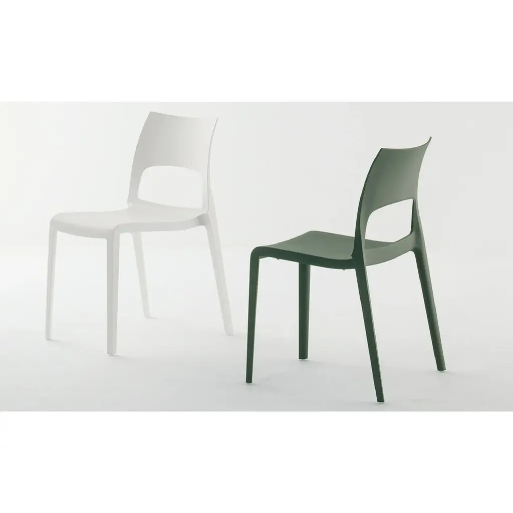 With a sobriety of use and image, emphasized by the design of the backrest, which is marked by its single opening, Idole is a lightweight stackable chair, with monocoque body in resistant plastic material. Available in five elegant colors, it can fit into every environment with style. The Idole designer plastic chair is a robust and comfortable object for everyday use, thanks also to the use of innovative materials and production techniques and its extreme ease of handling. The curvature of the backrest is emphasized by the flared line of the back legs, for an essential but dynamic result: a look that makes it versatile in use, suitable for public or private spaces, perfect for the dining room, the bar area but also for offices or meeting rooms.
