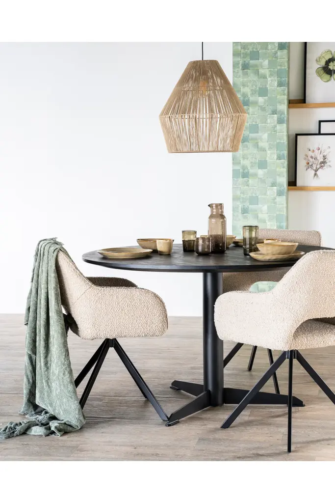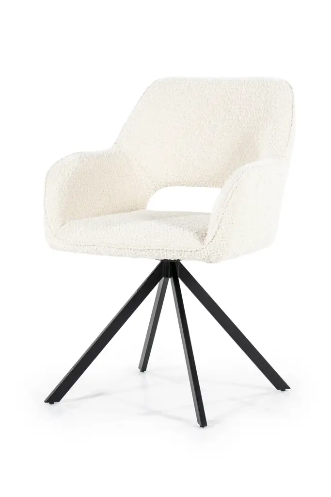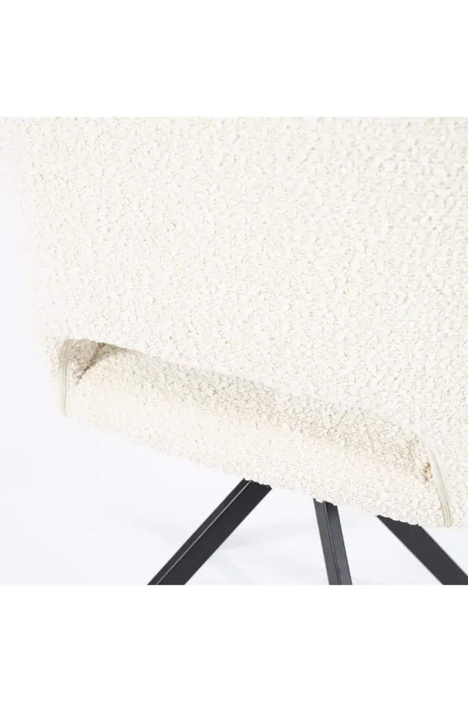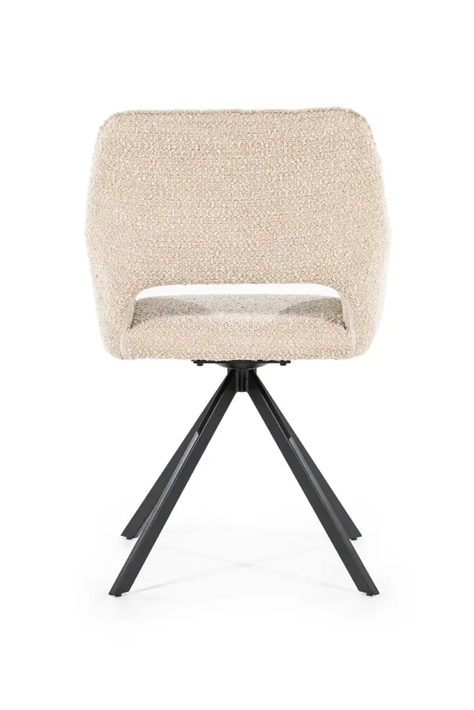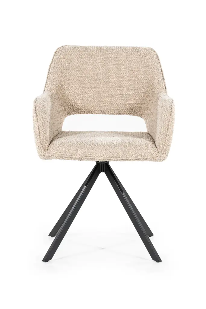Dining Armchair Fabio by Eleonora is luxuriously upholstered in a tactile fabric that invites you to sit down and relax. Its distinctive cut-out back design adds a modern flair, setting it apart from ordinary dining chairs. Supported by sleek black metal quadrupod legs, Fabio combines form and function effortlessly. This piece is sure to turn an ordinary meal into an unforgettable feast with loved ones.