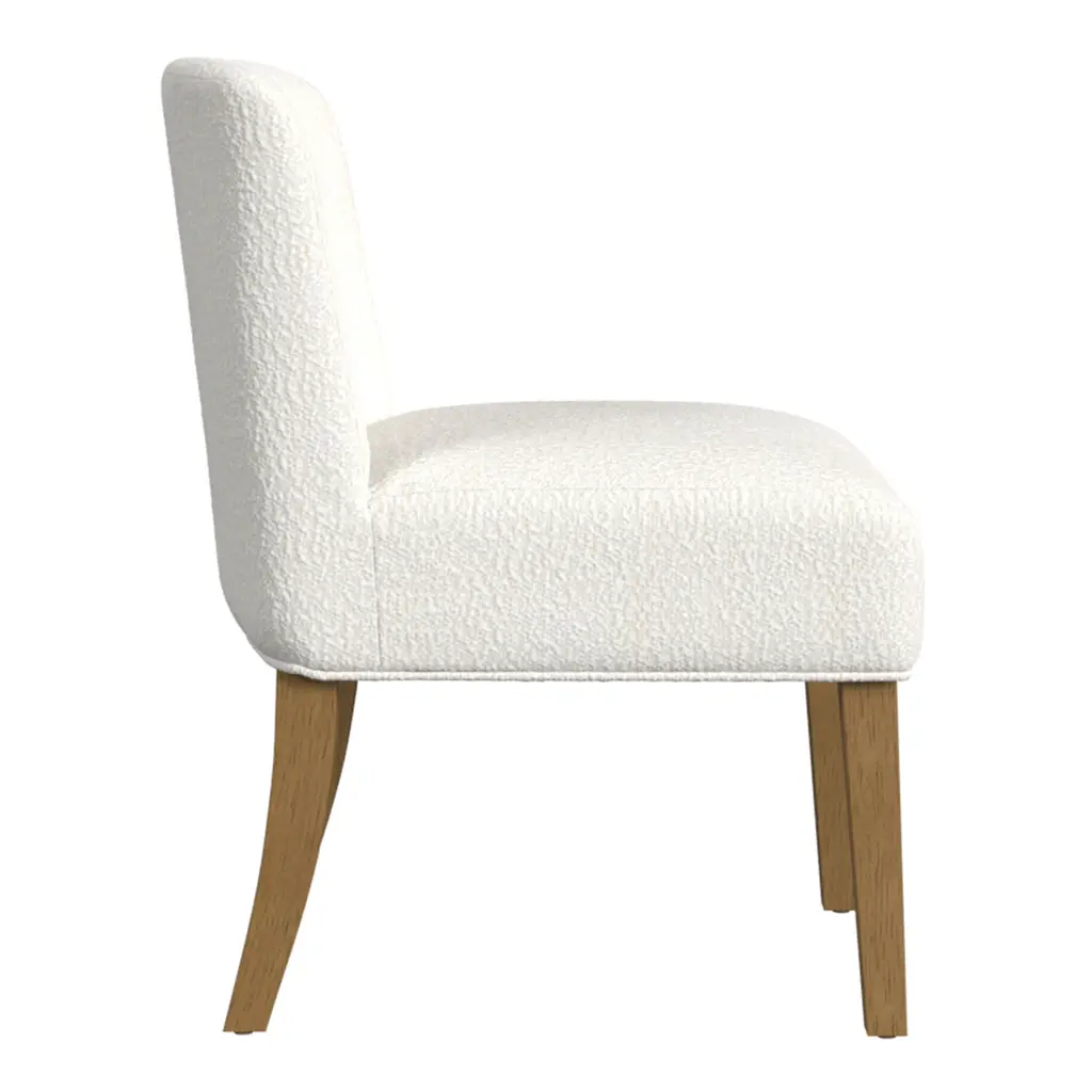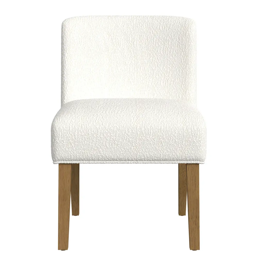 Built for comfort with a simple silhouette, the Cyprus dining chair features a gently curved back and padded seat covered in tactile upholstery. A streamlined side chair with crisp modern styling, its clean profile is completed with Scandi-style wood legs in a honey-oak finish. A clean, contemporary armless chair that stays cozy through long family meals, it will always be welcome as an extra seat in the office or living room.