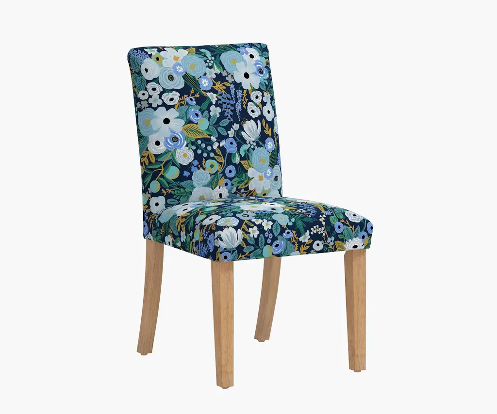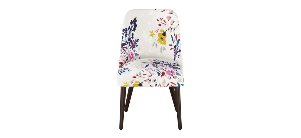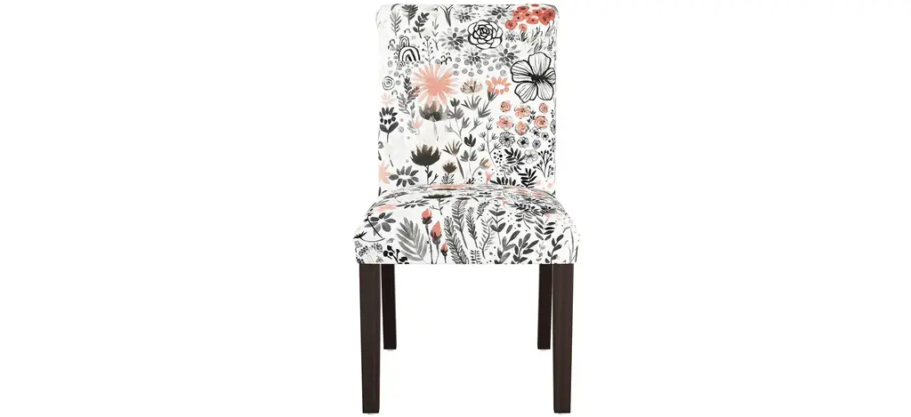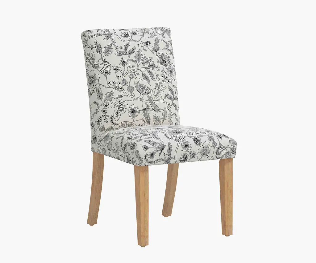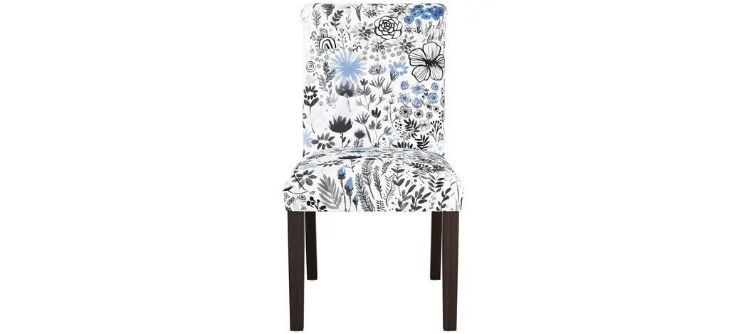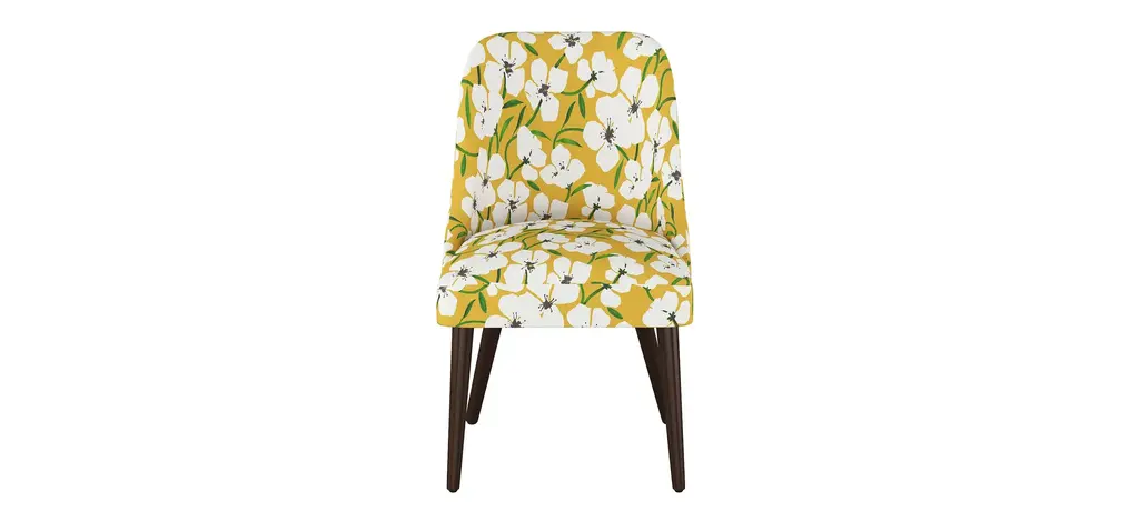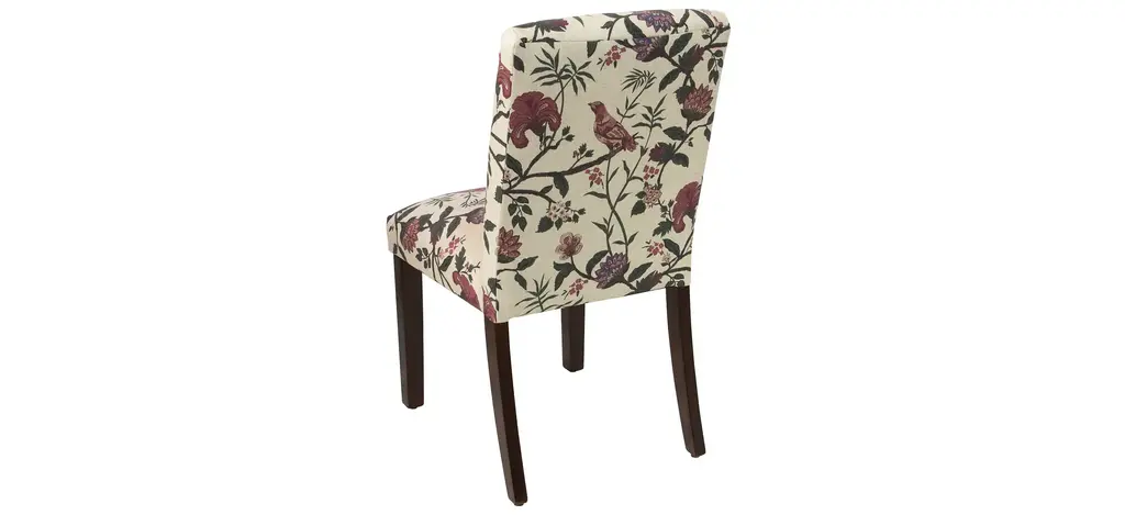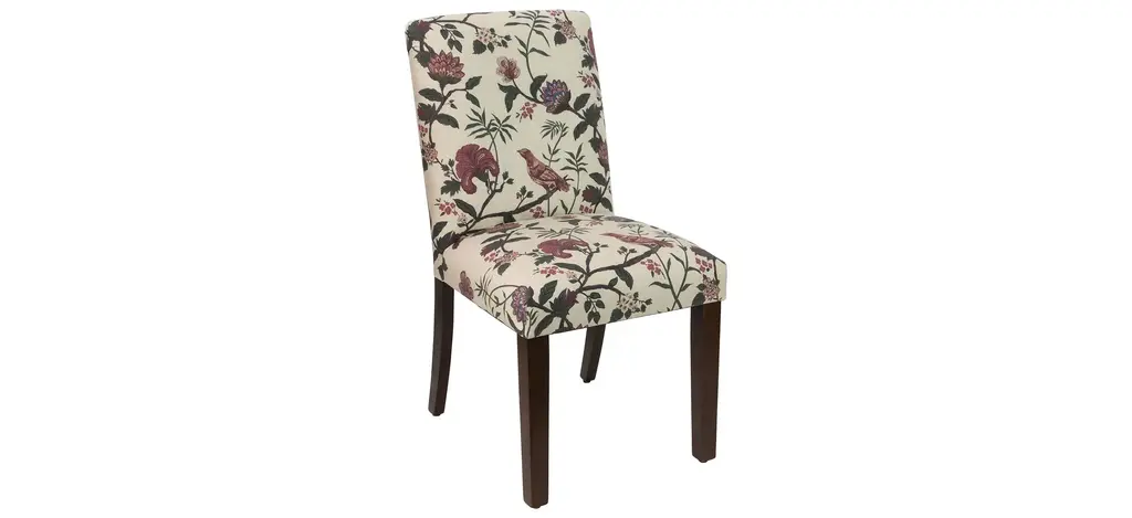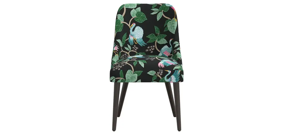 Secure the ideal Dana dining chair for your table when you select this versatile piece. With its hand upholstered Bird fabric, and superior construction, you can feel good about adding it to your overall dining designin multiples! Manufactured in Illinois and made to order, this square chair is graced with tasteful tapered wooden legs that add an air of sophistication. In addition, the armless construction makes it a sensible choice for dining areas both large and small.