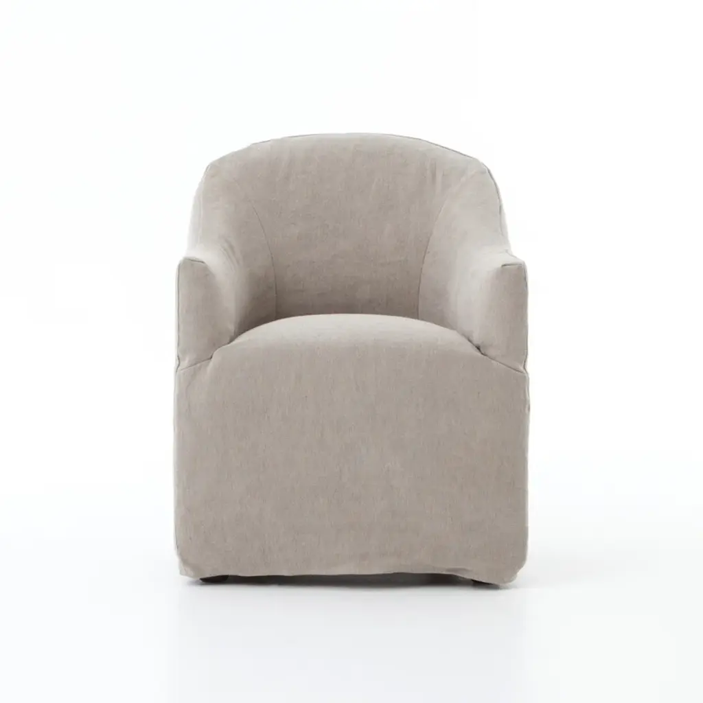 A petite piece with a modern flair and endless placement possibilities, our Dani dining chair works as well behind your office desk as it does around your table. Set atop casters for easy movement from place to place, Dani can be tailored in the fabric of your choice.