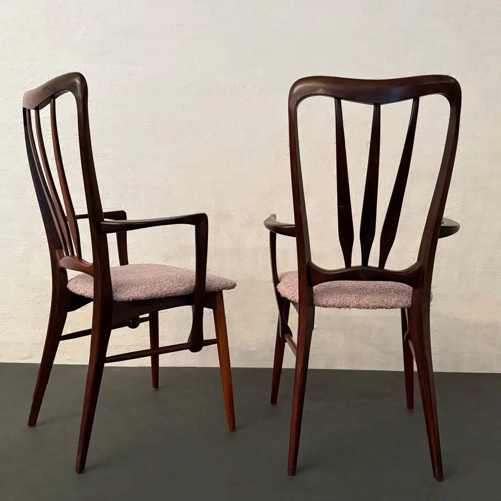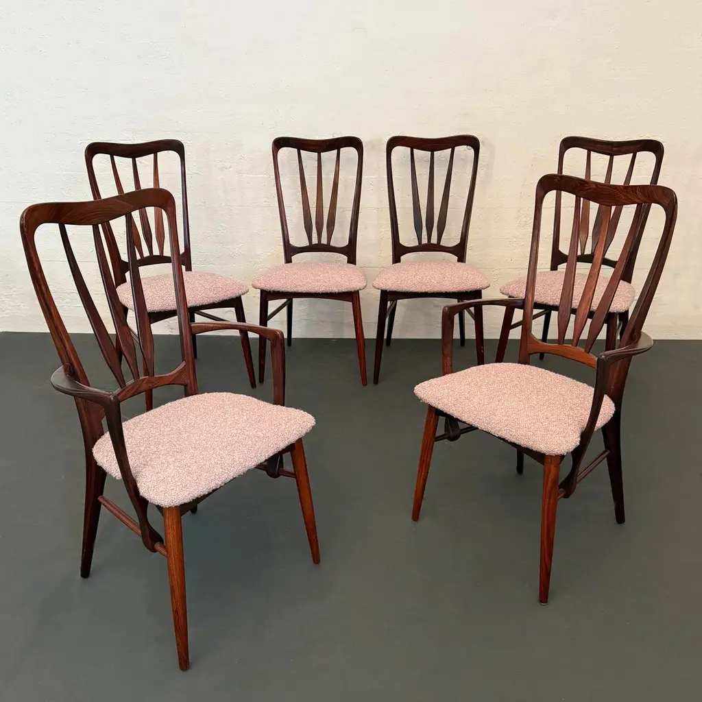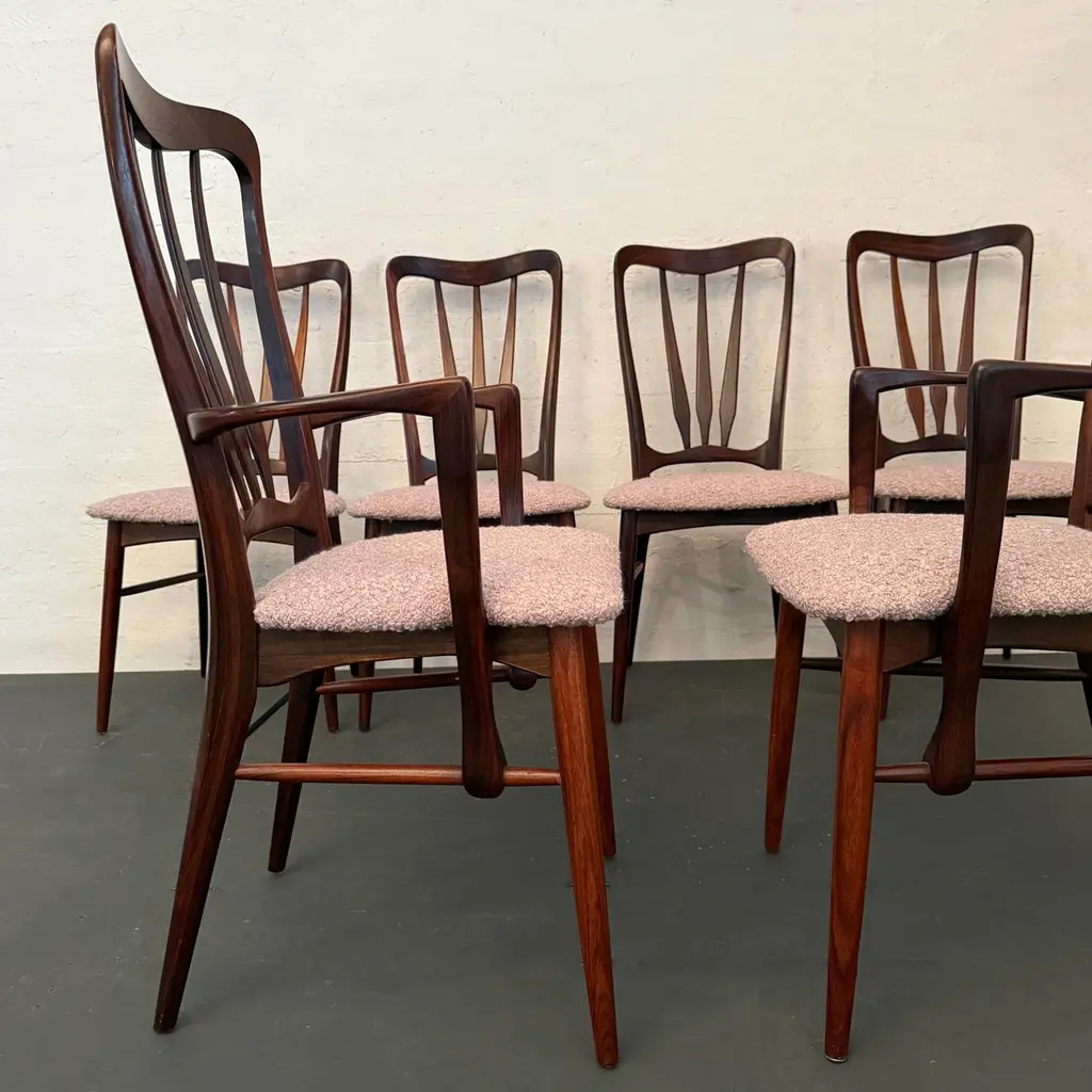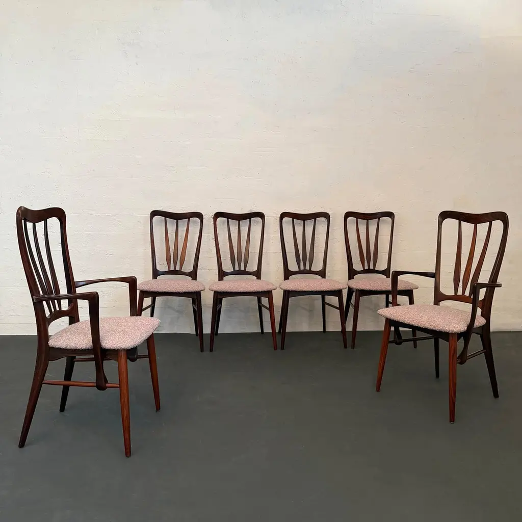 Set of six, Danish modern, rosewood, “Ingrid” dining chairs by Niels Koefoed for Koefoeds Hornslet consists of four side chairs and two captain armchairs. The curvaceous frames feature high backs with a deep rosewood grain throughout and outstanding joinery details that make these chairs so special. The seats are newly upholstered in blush pink cotton bouclé.The side chairs measure: 18” width x 18” depth x 38.5” height, seat height is 18”The armchairs measure: 20.5” width x 18” depth x 38.5” height, seat height is 18”, arm height is 25.5”