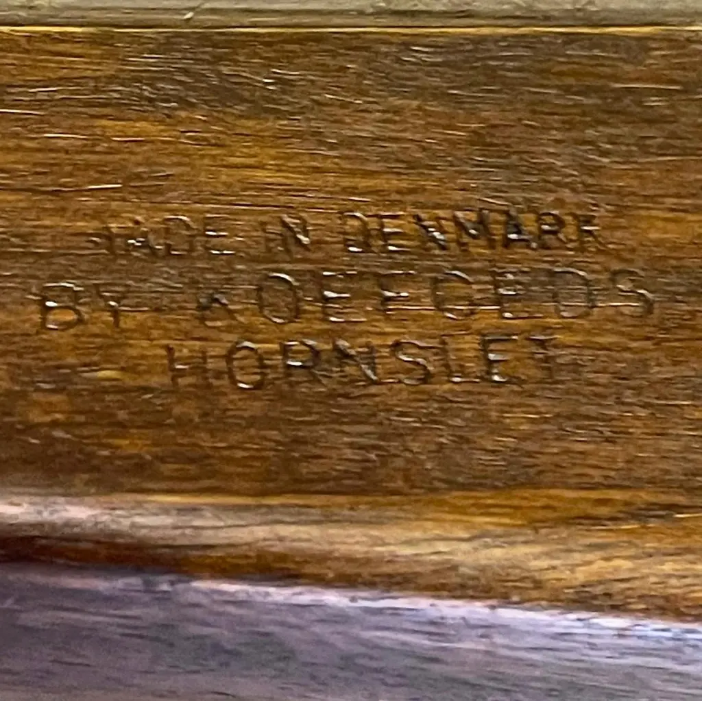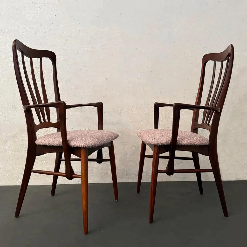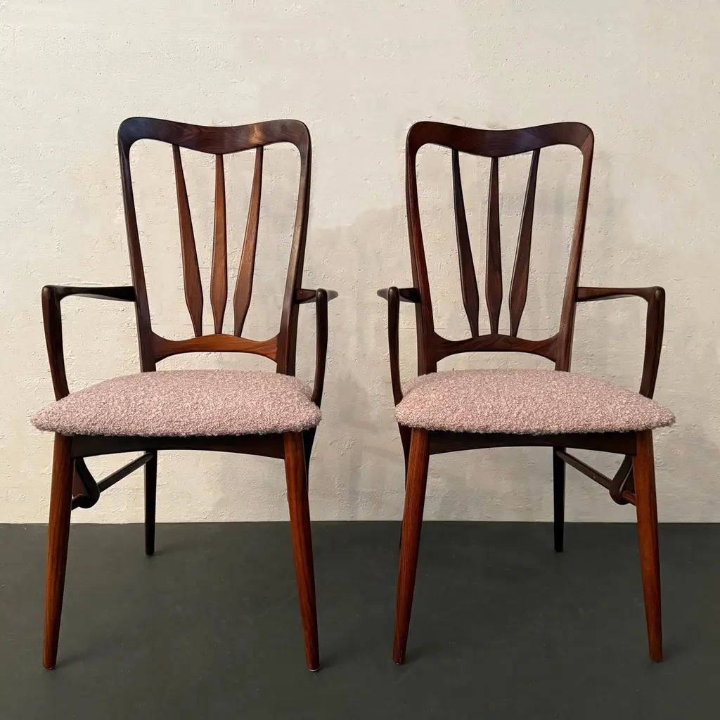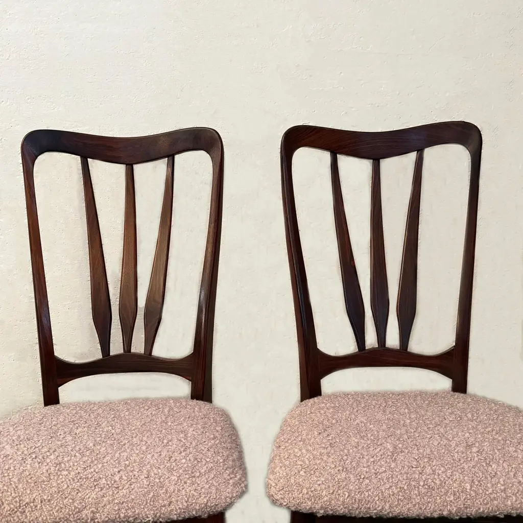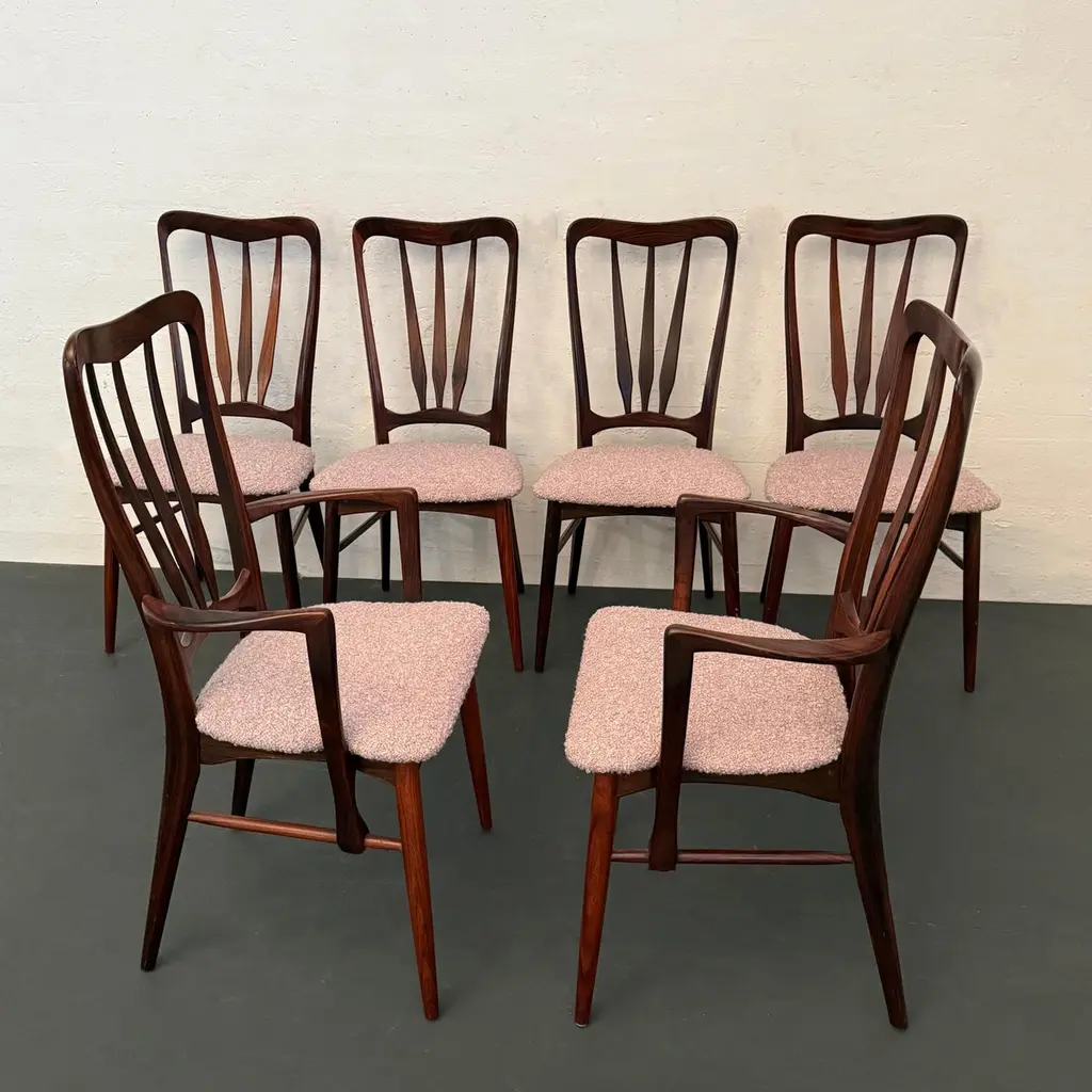 Set of six, Danish modern, rosewood, “Ingrid” dining chairs by Niels Koefoed for Koefoeds Hornslet consists of four side chairs and two captain armchairs. The curvaceous frames feature high backs with a deep rosewood grain throughout and outstanding joinery details that make these chairs so special. The seats are newly upholstered in blush pink cotton bouclé.The side chairs measure: 18” width x 18” depth x 38.5” height, seat height is 18”The armchairs measure: 20.5” width x 18” depth x 38.5” height, seat height is 18”, arm height is 25.5”