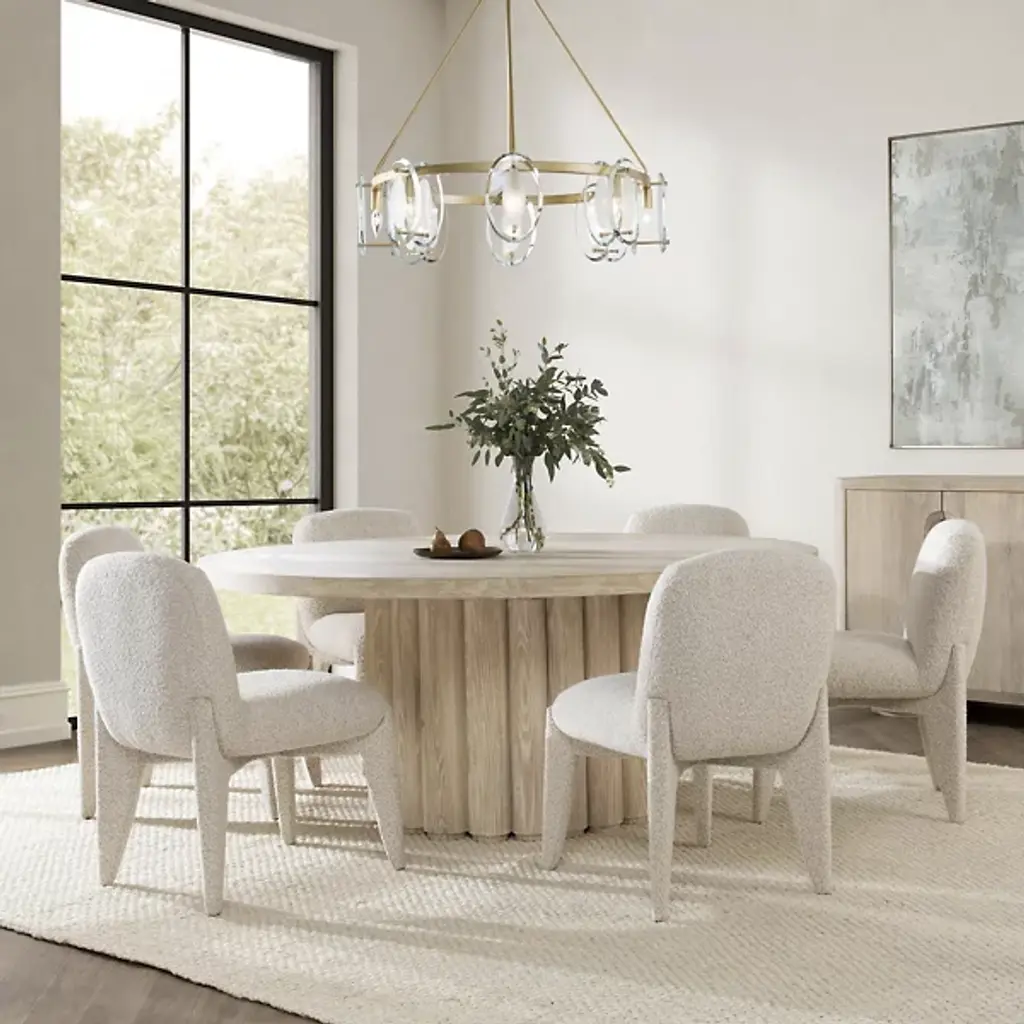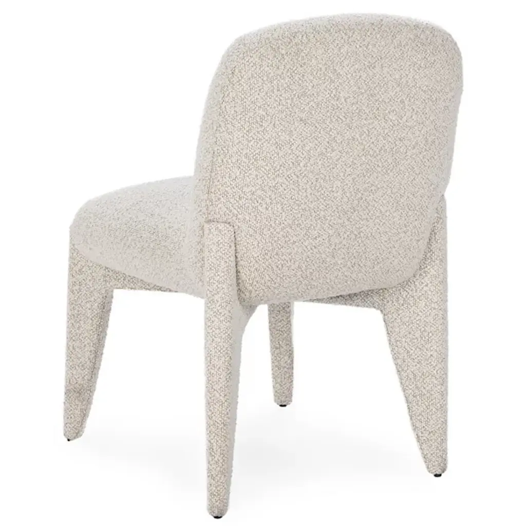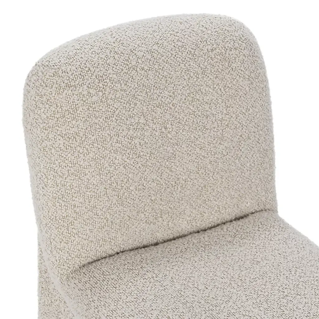 The Danson Dining Chair from Classic Home brings boucle fabric upholstery with textured softness across its wide seating area. Wooden legs provide stable support, while an ergonomic curved backrest ensures proper posture during extended dining sessions. Padded cushioning maintains comfort throughout meals and social gatherings. Polyester construction resists wear from daily use, making it practical for busy households. Comfort-focused design meets versatile aesthetics in contemporary dining spaces where seating must accommodate both style preferences and regular family use.