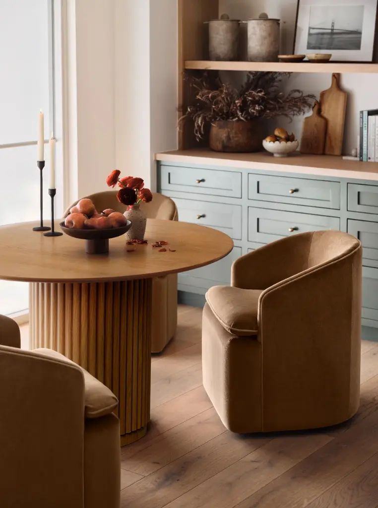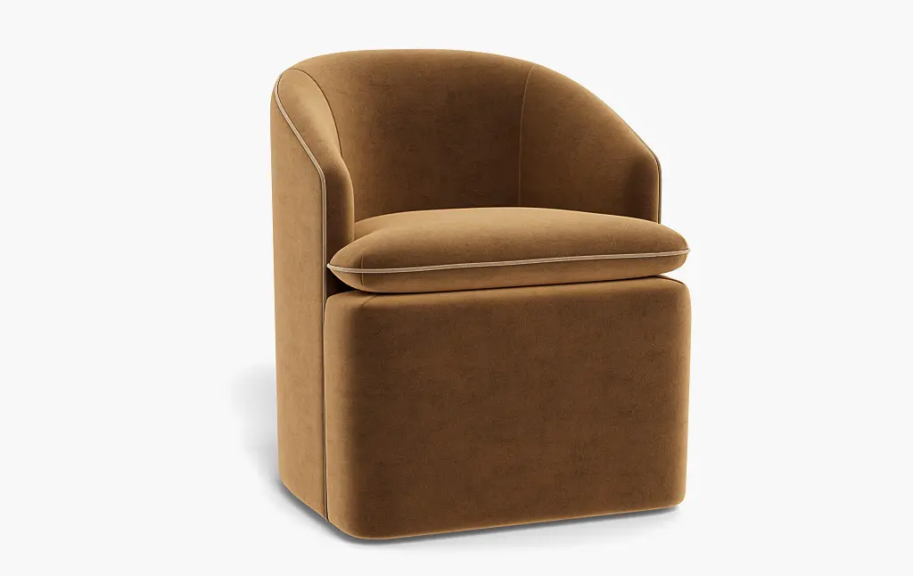 Comfort meets durability in the fully-upholstered Daphne dining chair. Available in performance fabric with contrast piping or leather upholstery, this piece will stand up to wine spills, spaghetti stains, and more. Plus, it features reversible cushions and castor wheels that lock for ease of use, so you can dine in style. Contract grade.