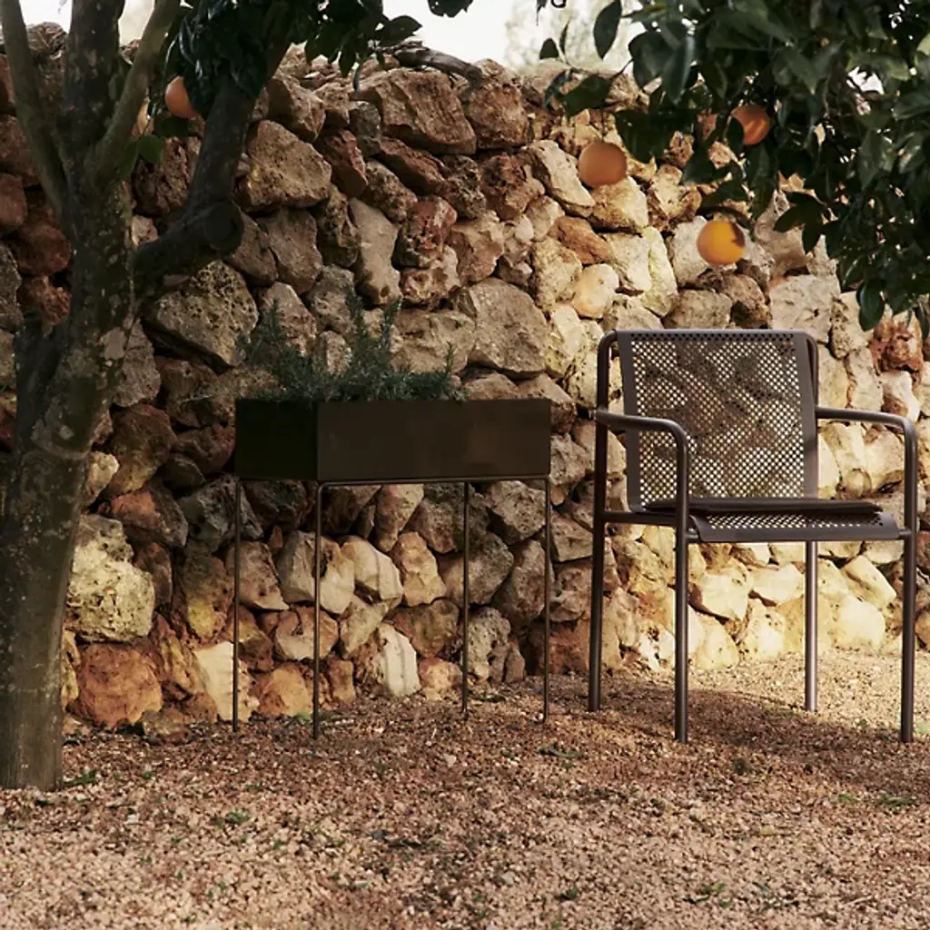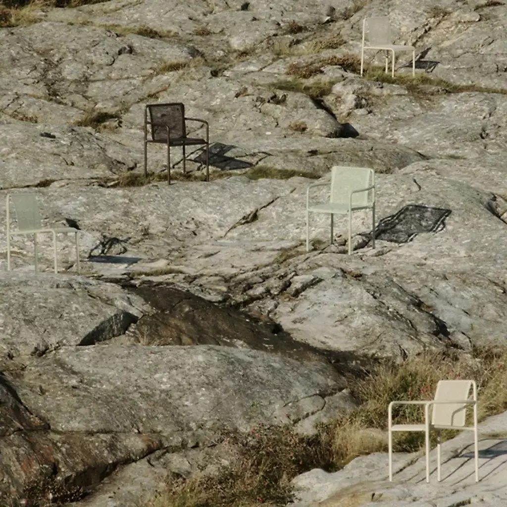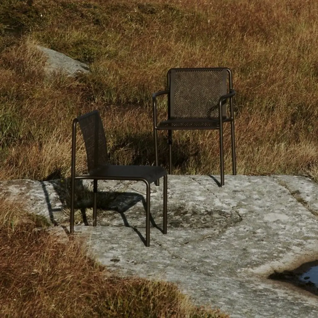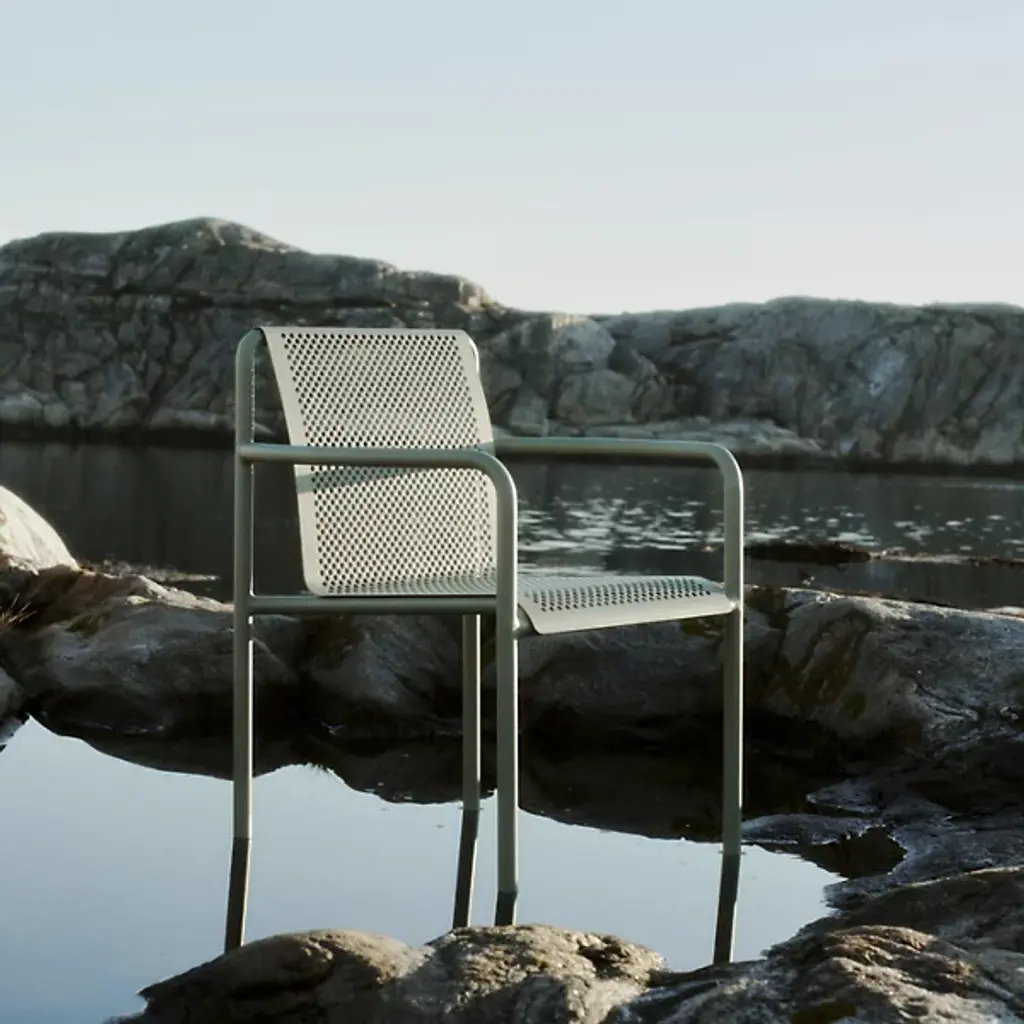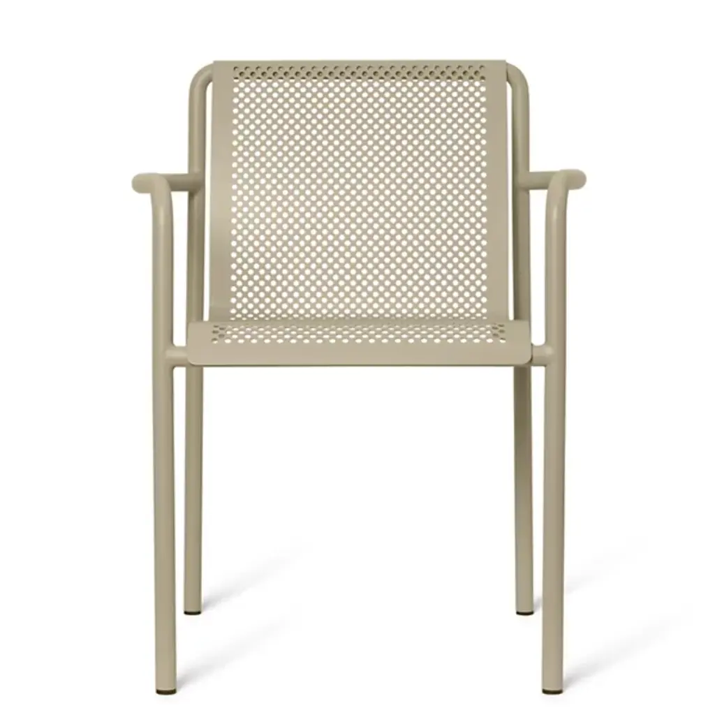 The Dapple Outdoor Dining Armchair from Ferm Living displays a balance of natural inspiration and Scandinavian restraint. Its perforated seat and back are inspired by the shifting light of the sun through a canopy of leaves, demonstrating stately character and practical function by allowing air to circulate and water to drain. Fashioned from electro-galvanized steel with a durable powder-coated finish, it resists the elements while presenting fine detail. Slim legs and simple, curved arms complete the seat; its airy, straightforward presence is equally suited to casual patio settings or more formal outdoor dining arrangements.