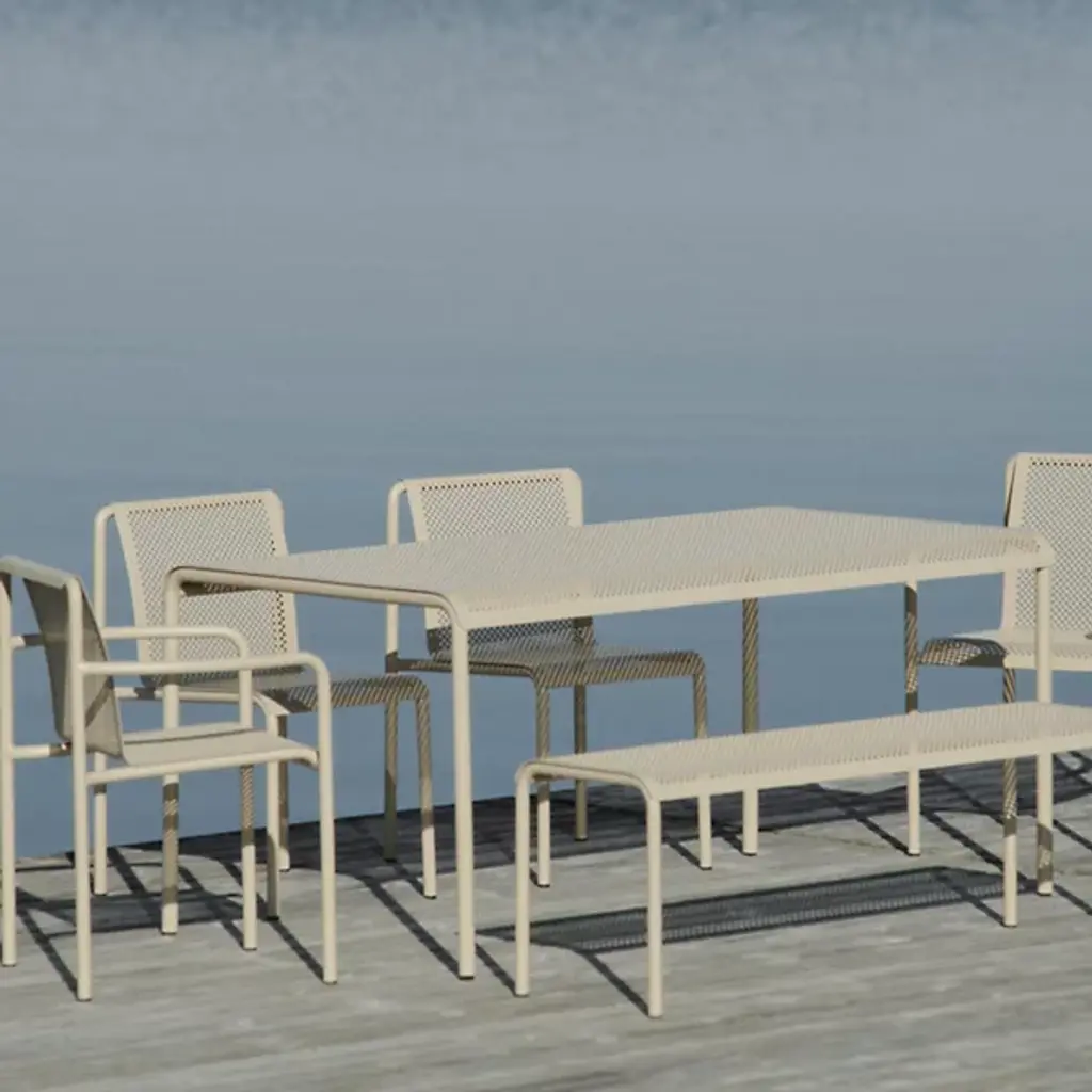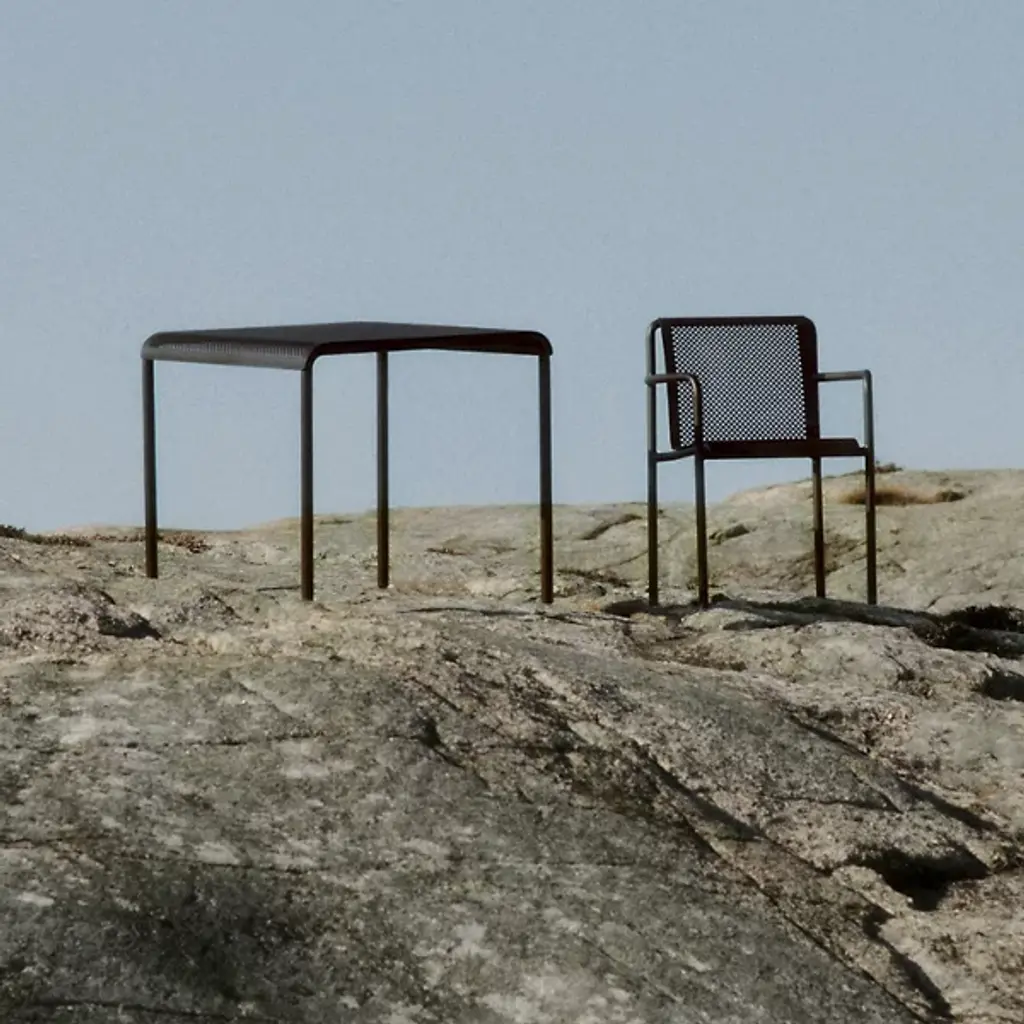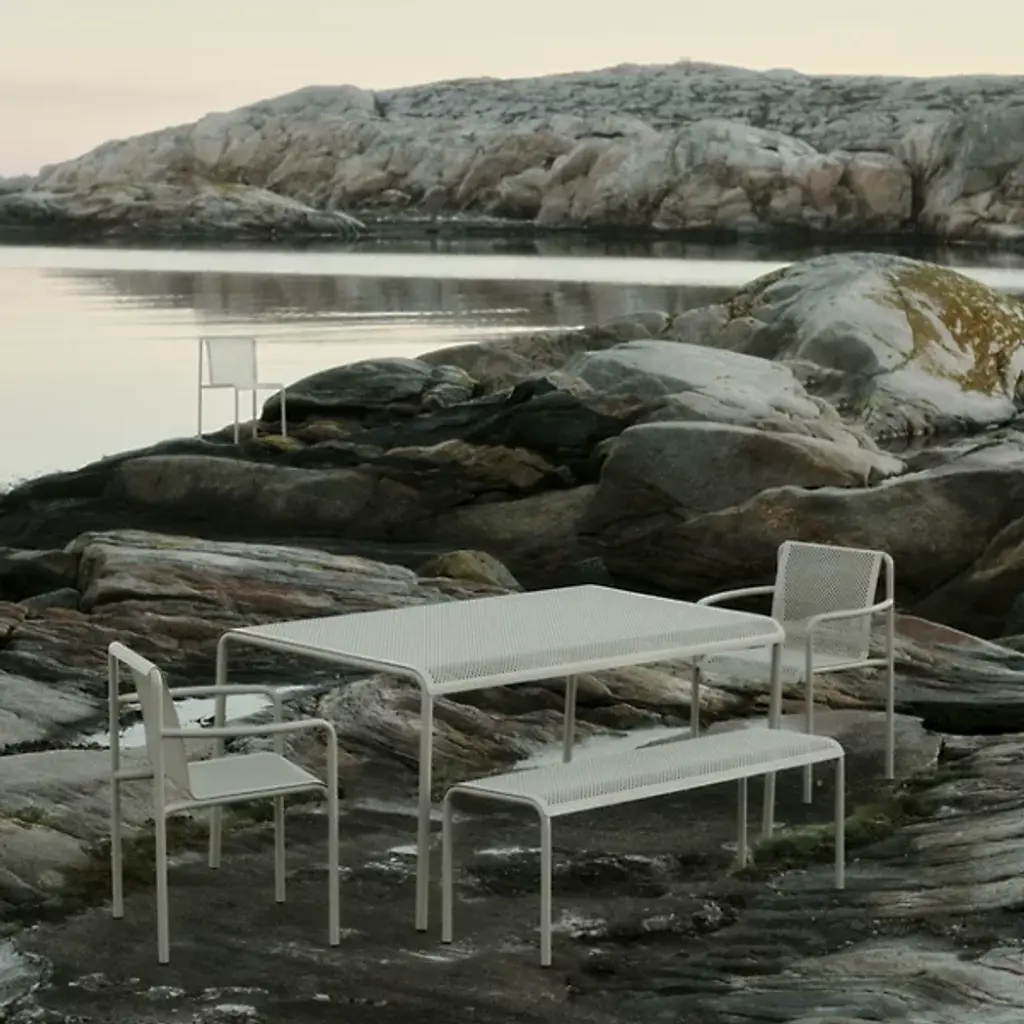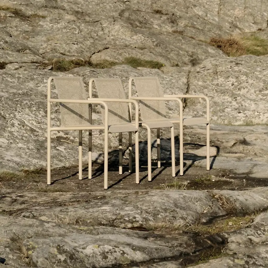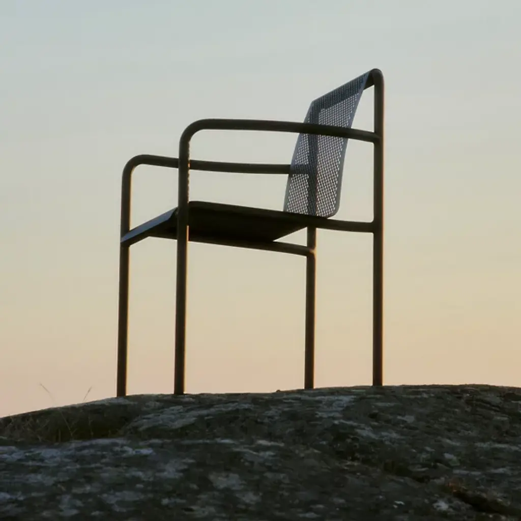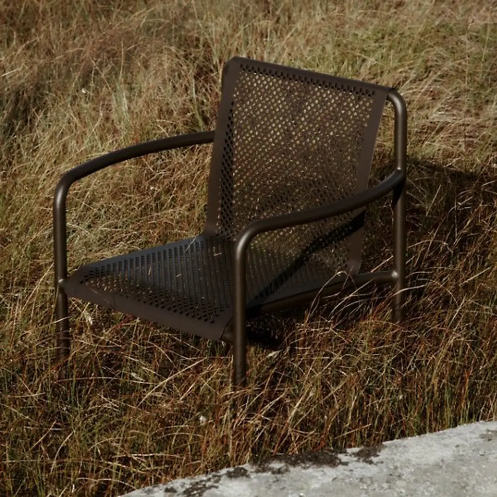 The Dapple Outdoor Dining Armchair from Ferm Living displays a balance of natural inspiration and Scandinavian restraint. Its perforated seat and back are inspired by the shifting light of the sun through a canopy of leaves, demonstrating stately character and practical function by allowing air to circulate and water to drain. Fashioned from electro-galvanized steel with a durable powder-coated finish, it resists the elements while presenting fine detail. Slim legs and simple, curved arms complete the seat; its airy, straightforward presence is equally suited to casual patio settings or more formal outdoor dining arrangements.