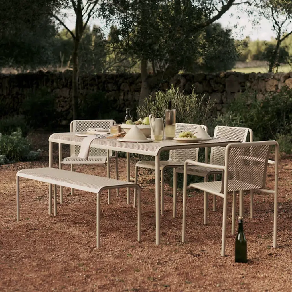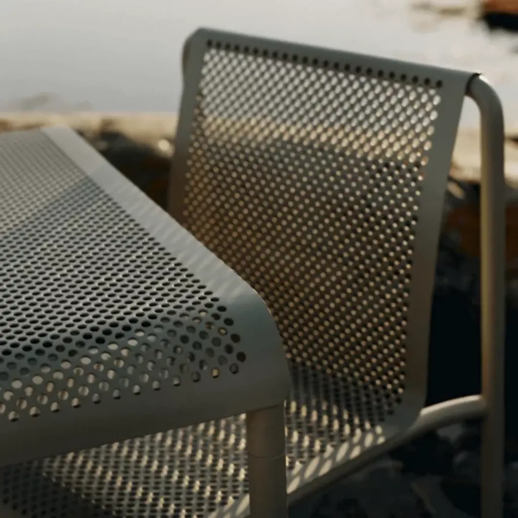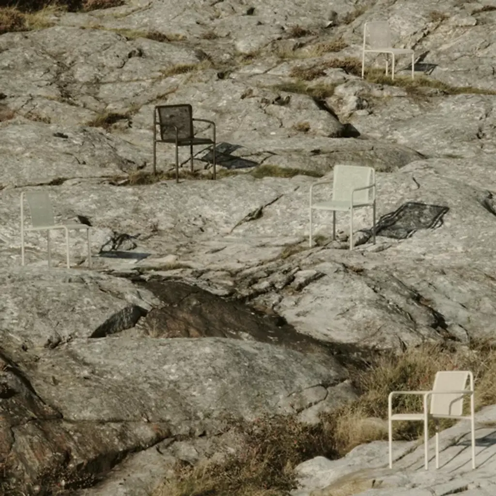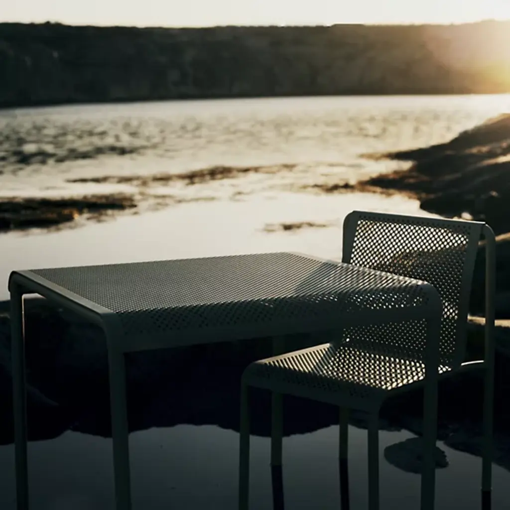 The Dapple Outdoor Dining Chair from Ferm Living channels contemporary simplicity and Scandinavian minimalism through durable materials and thoughtful details. Its design takes cues from nature, of sunlight filtering through a canopy and casting distinctive shadows. The perforated seat and back encourage airflow while preventing moisture from pooling, and the electro-galvanized steel creates a resilient finish that withstands outdoor conditions. Four slim, strong legs support the seat, creating a piece that can be dressed down for patio gatherings or dressed up for garden dining spaces.