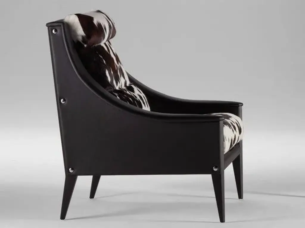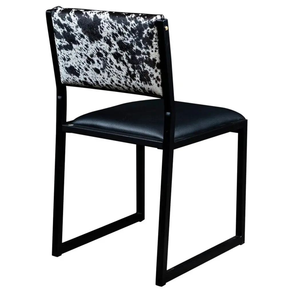 Boasting an art moderne influence, the Darcy Dining Chair features a black and white spotted hide seat and a streamlined stainless steel frame in a matte black finish. Hide is a natural material. Variations in coloration are to be expected and add to the uniqueness and charm of each piece.
