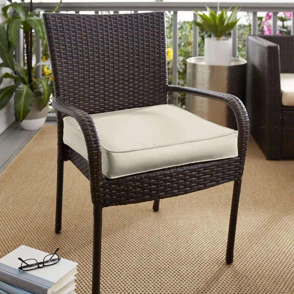 This 4-piece set of outdoor seat cushions adds plush relaxation in your garden or on the porch. Each has an interior insert made from foam for just the right amount of support. The square design features an acrylic Sunbrella fabric cover with piped edges that's removable with a quick zip for easy cleaning. Plus, each cushion has ties for attaching to your chairs (sold separately). We love that this upholstery is specially created to be resistant to weather, UV/fading, and stains for holding up to everyday use. Make sure to measure your chairs when selecting a size (based on availability).