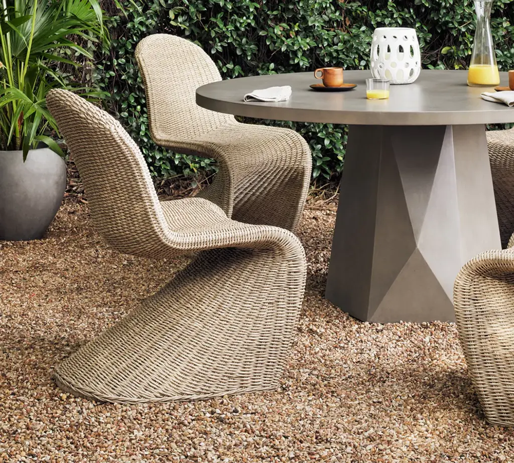 Elegant curves pair with all-weather wicker to create our daring and perfectly poseable Dawn dining chair. Pulled up to your outdoor dining table or standing on its own, this piece is as clever as it is comfortable. Cover or store indoors during inclement weather or when not in use.