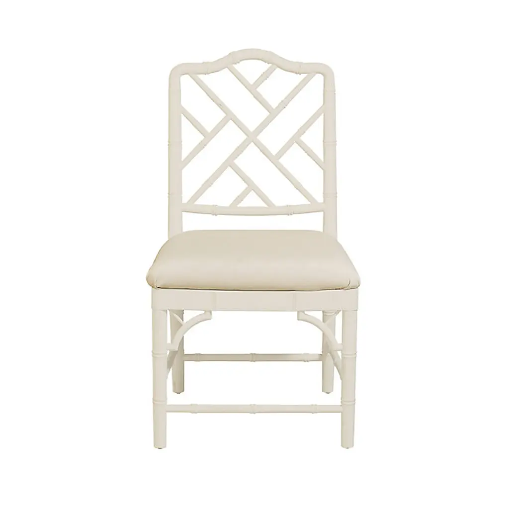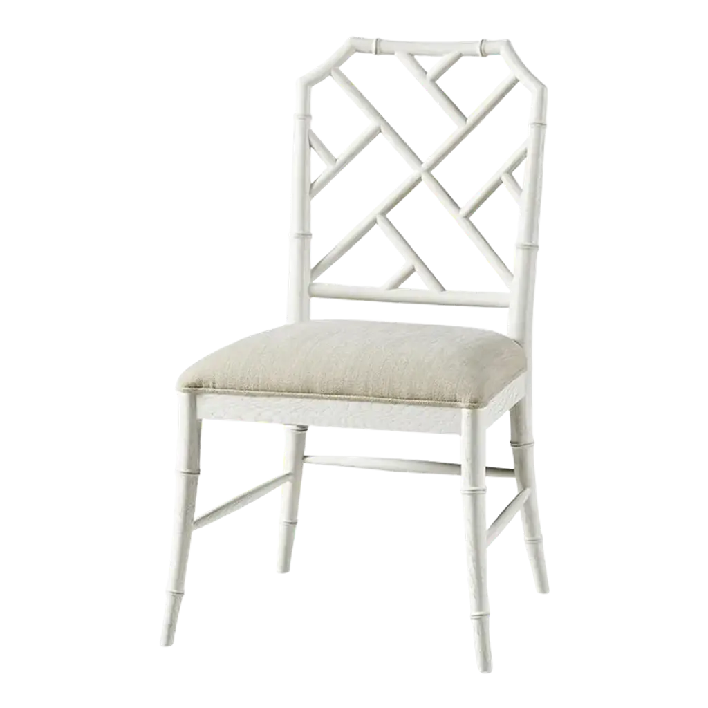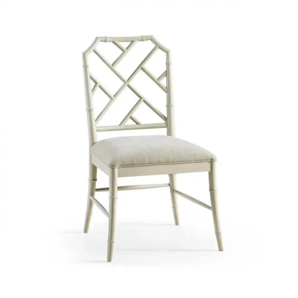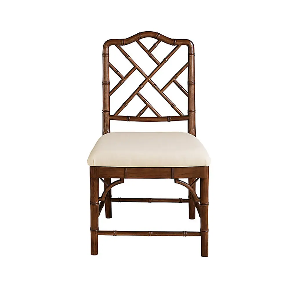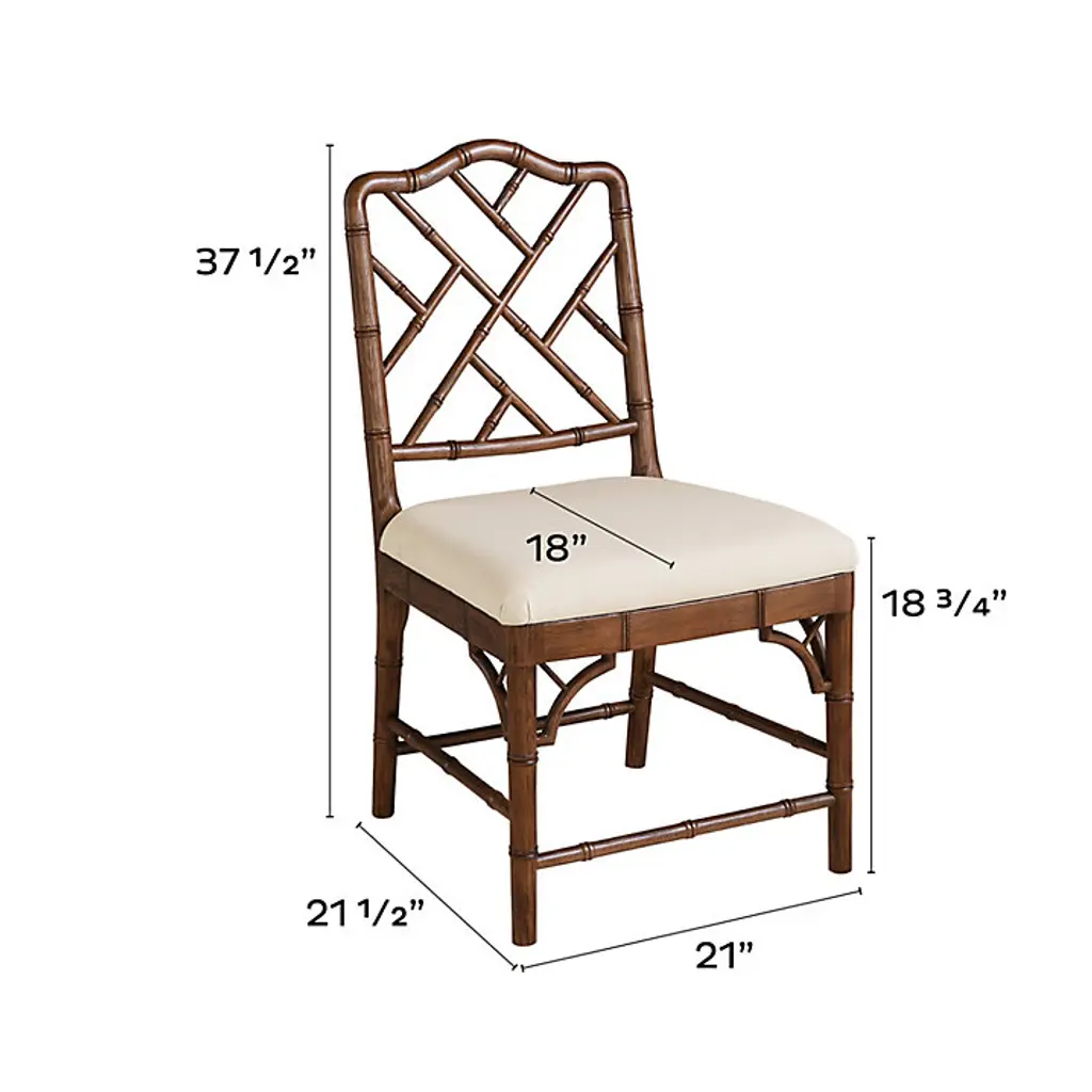 Our Dayna Side Chairs capture the sophisticated soul of Chinese Chippendale styling. Solid beech wood frames are artisan crafted with classic fretwork hand finished with lightly rubbed, bamboo-inspired turnings. Richly padded slip seat is expertly upholstered in our cleanable, family-friendly Sandberg Parchment InsideOut performance fabric, a beautiful choice for spill-prone areas like the dining room, kitchen island and breakfast nook. Seat can be removed for easy re-covering in your favorite fabric from our gorgeous selection of more than 300 styles. Dayna Side Chair features: Ballard Designs Performance Fabrics by InsideOut features:
