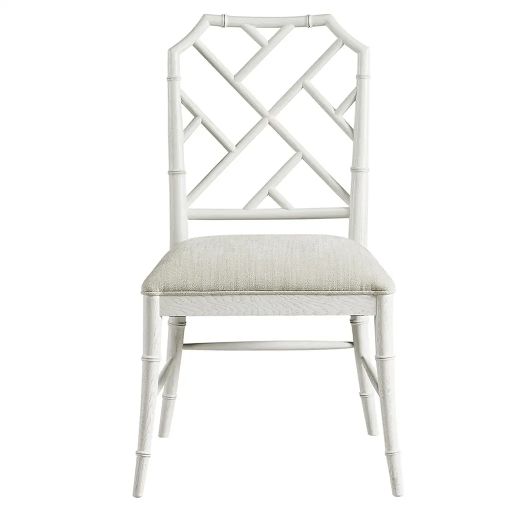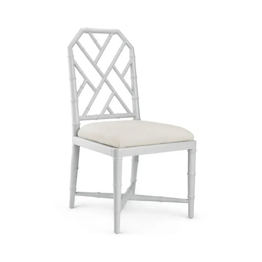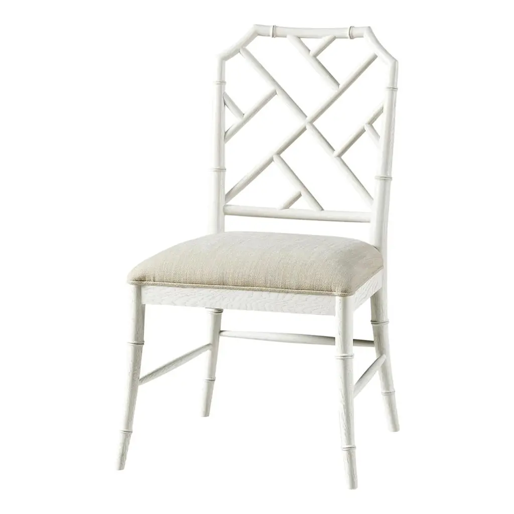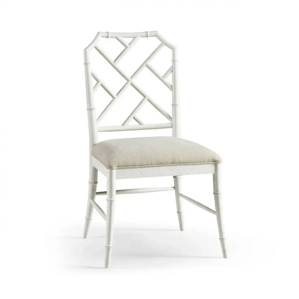 Our Dayna Side Chairs capture the sophisticated soul of Chinese Chippendale styling. Solid beech wood frames are artisan crafted with classic fretwork hand finished with lightly rubbed, bamboo-inspired turnings. Richly padded slip seat is expertly upholstered in our cleanable, family-friendly Sandberg Parchment InsideOut performance fabric, a beautiful choice for spill-prone areas like the dining room, kitchen island and breakfast nook. Seat can be removed for easy re-covering in your favorite fabric from our gorgeous selection of more than 300 styles. Dayna Side Chair features: Ballard Designs Performance Fabrics by InsideOut features: