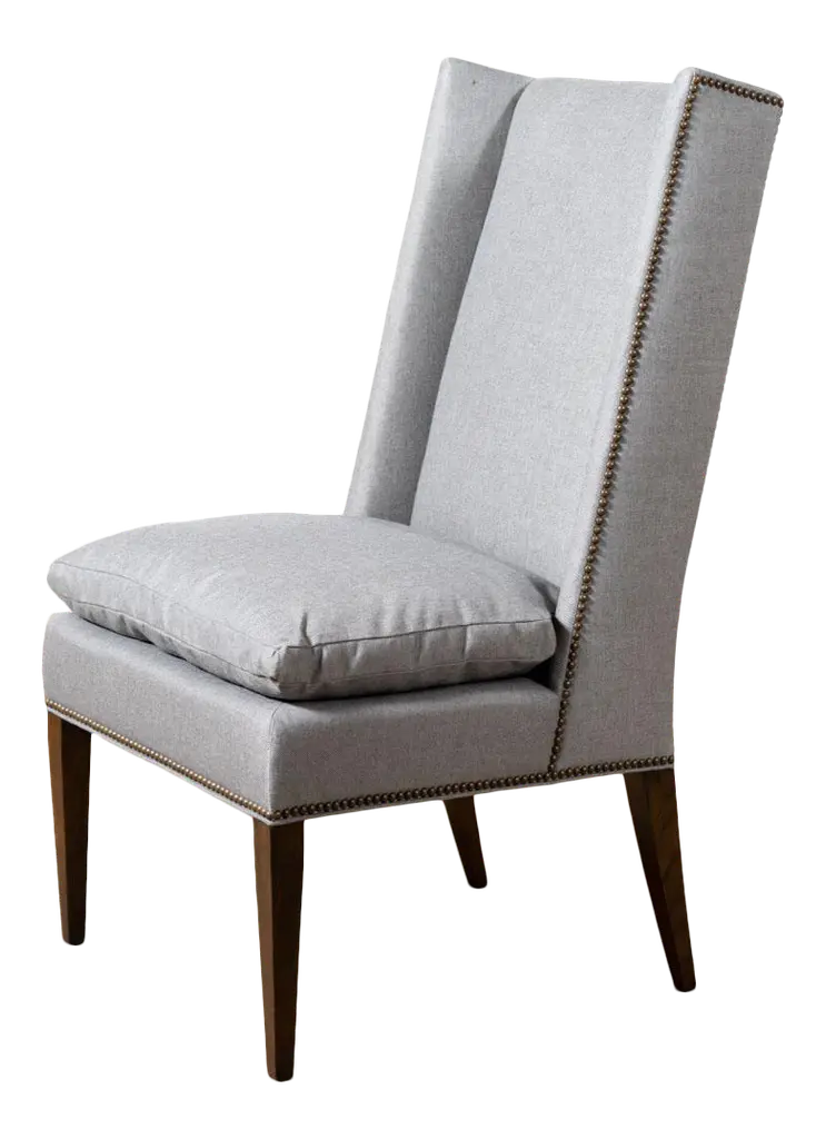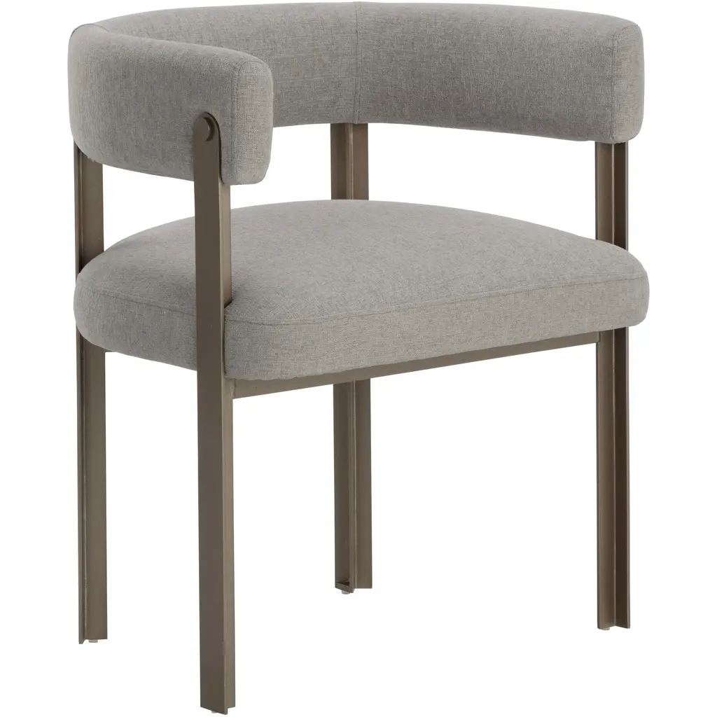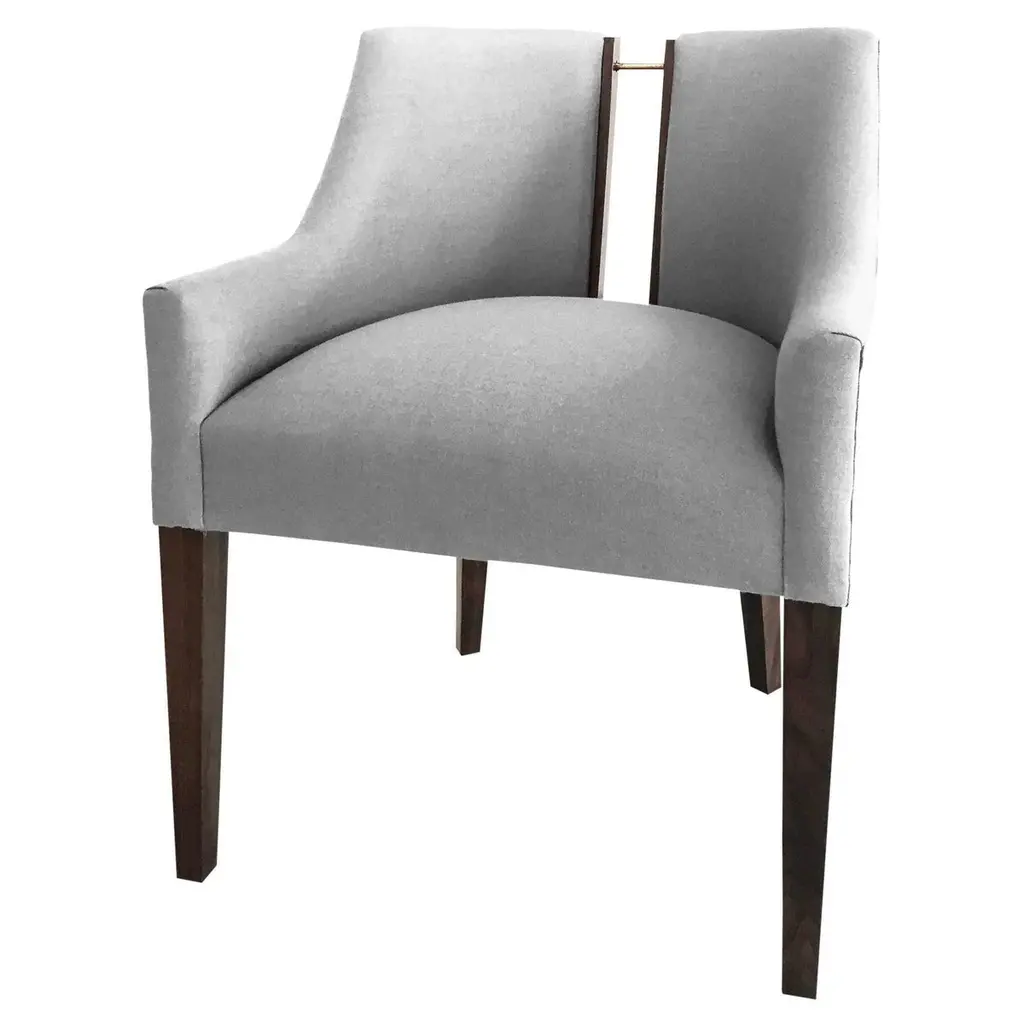 Our Declan dining chair exudes sophisticated elegance. It is sleek and curvaceous, with the perfectly unexpected walnut and brass back detailing. A modern chair with Classic proportions. Pictured here in solid walnut, darkened brass and upholstered in luxurious wool.
