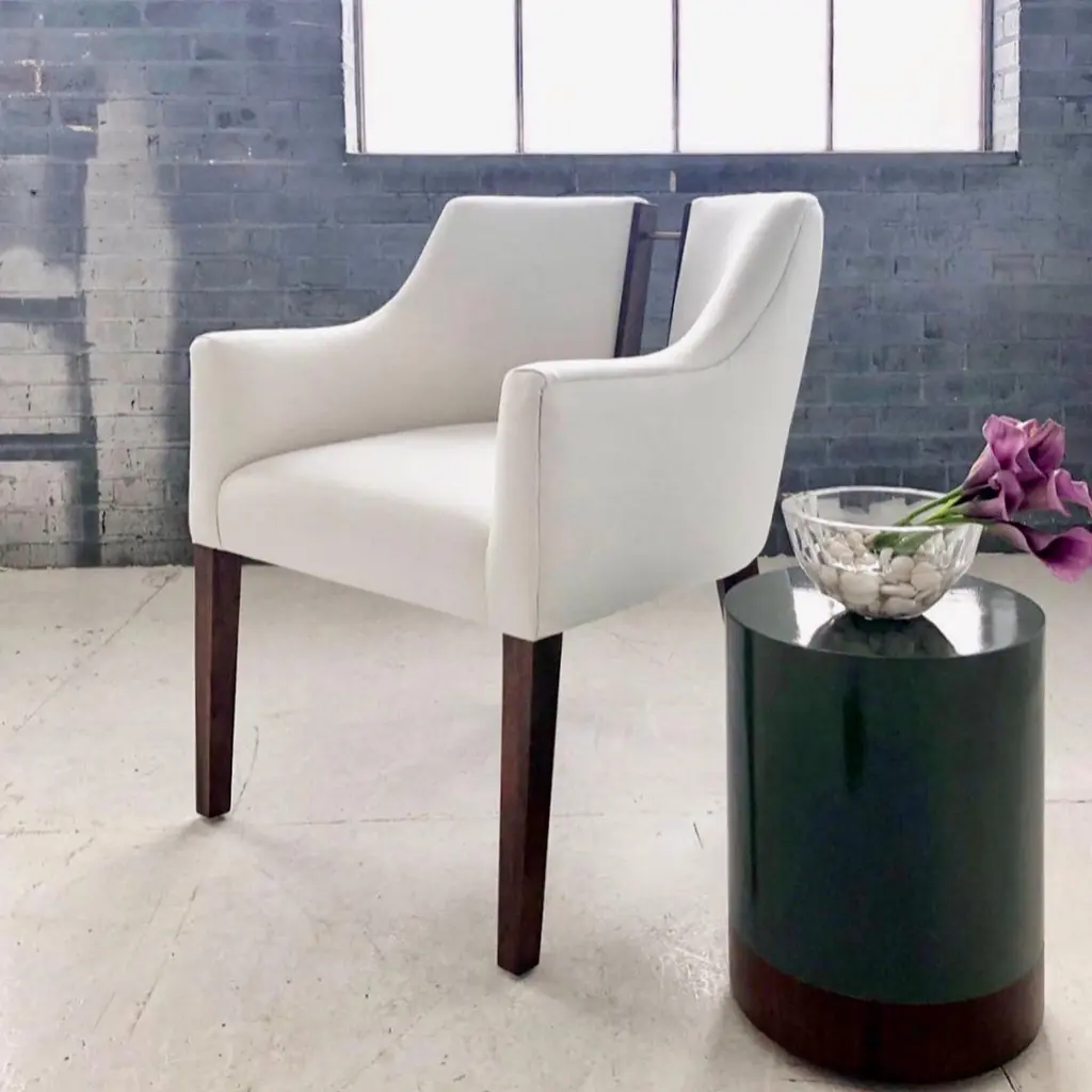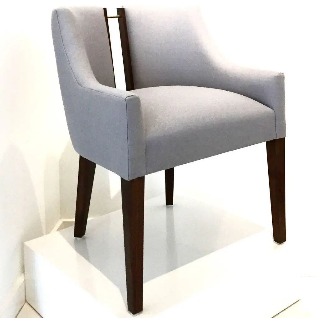 Our Declan dining chair exudes sophisticated elegance. It is sleek and curvaceous, with the perfectly unexpected walnut and brass back detailing. A modern chair with Classic proportions. Pictured here in solid walnut, darkened brass and upholstered in luxurious wool.