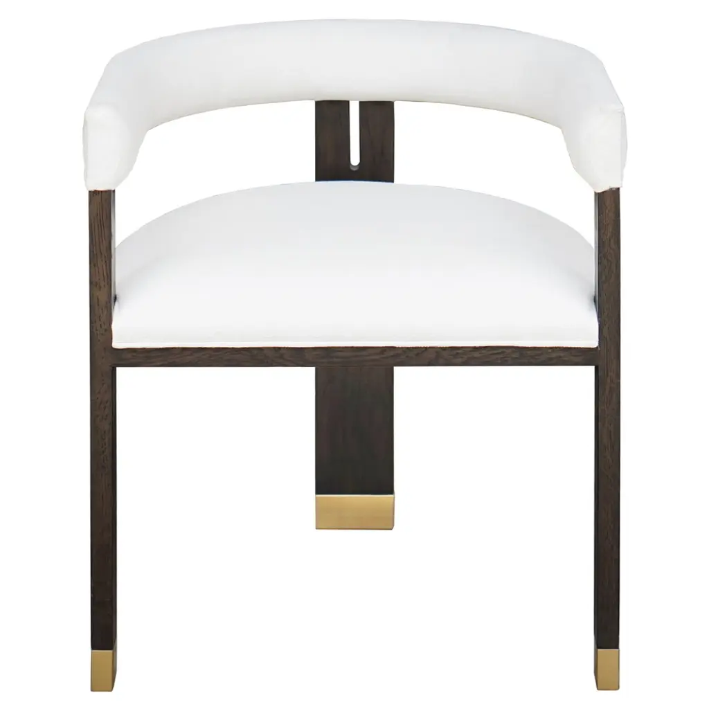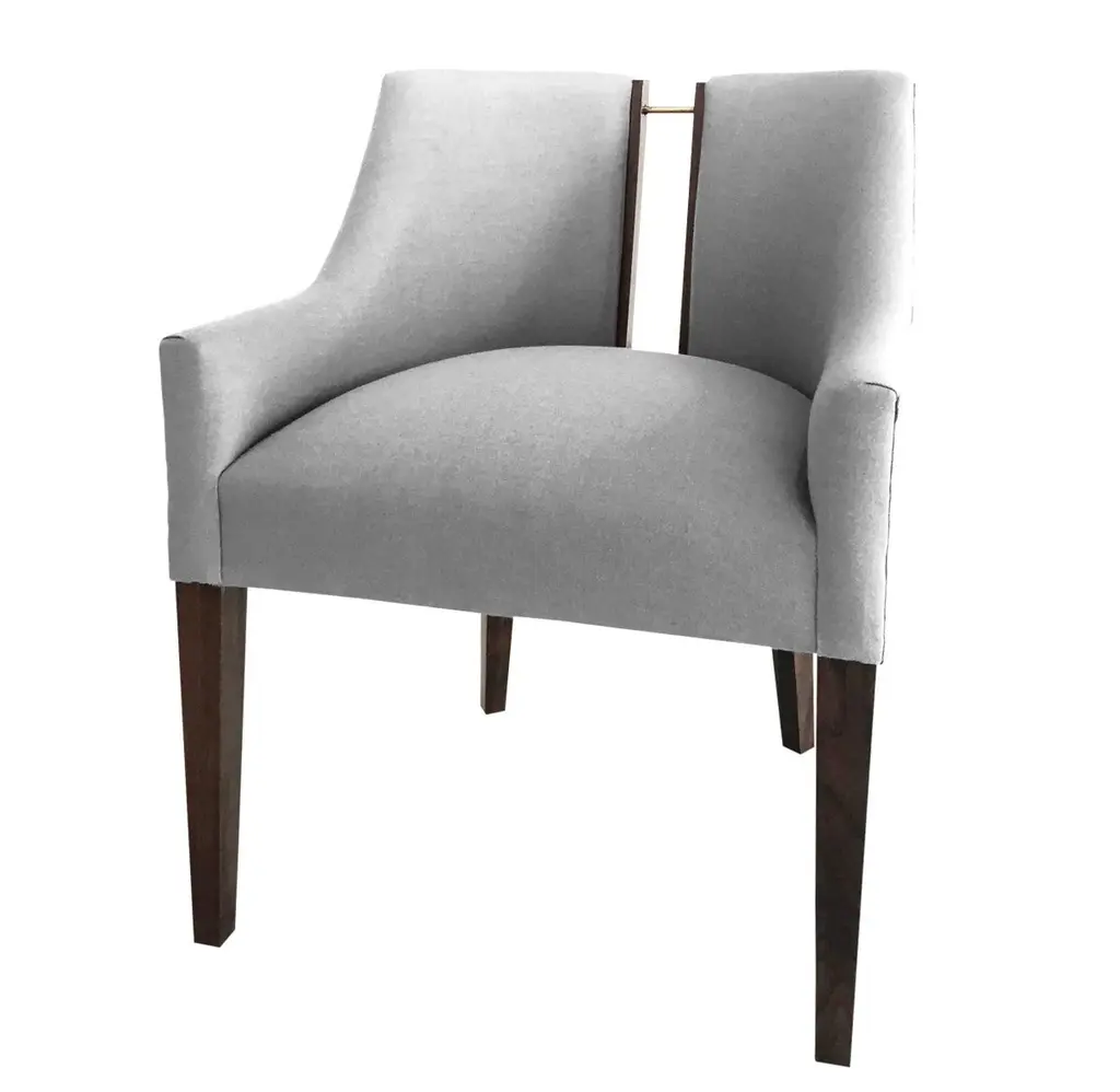 Our Declan dining chair exudes sophisticated elegance. It is sleek and curvaceous, with the perfectly unexpected walnut and brass back detailing. A modern chair with Classic proportions. Pictured here in solid walnut, darkened brass and upholstered in luxurious wool.