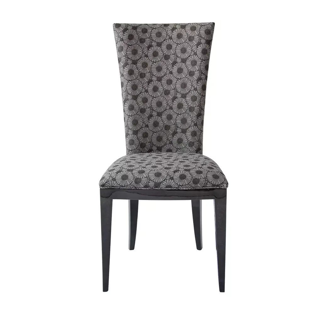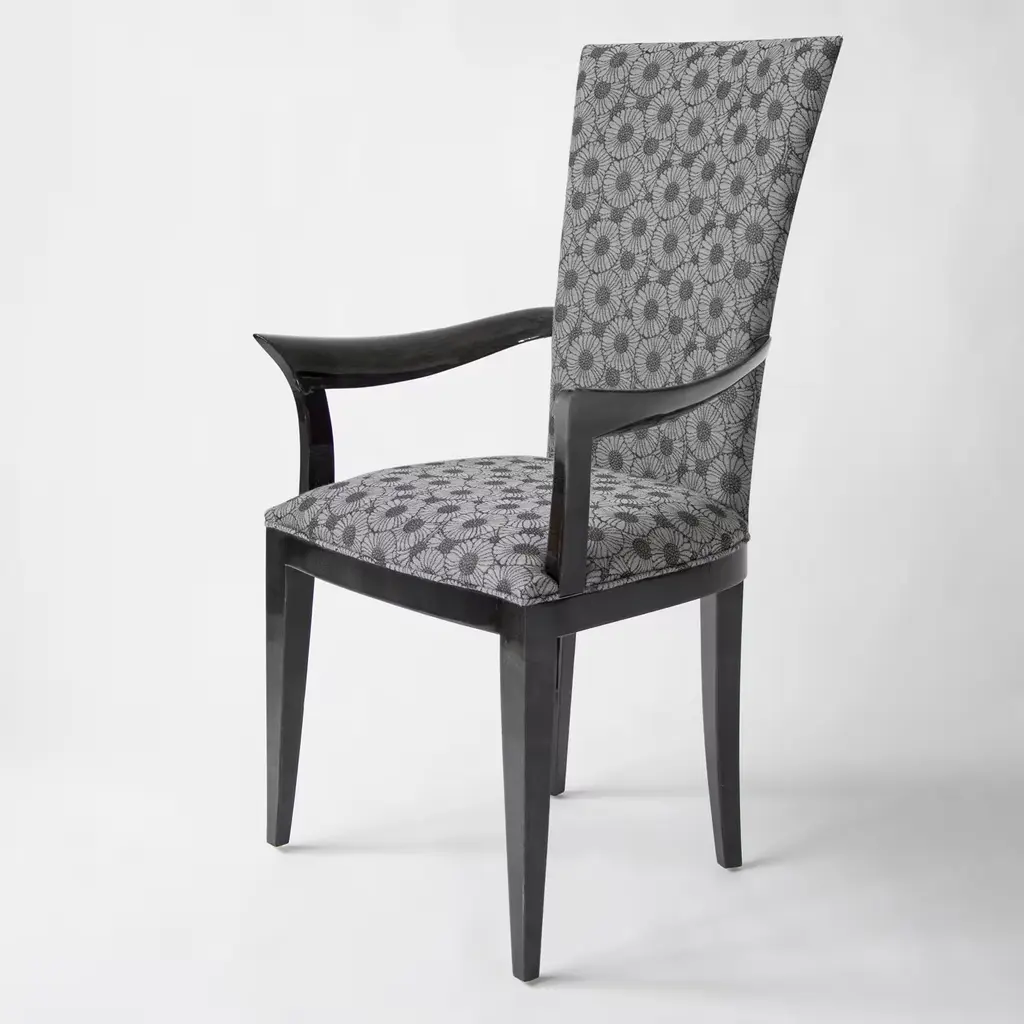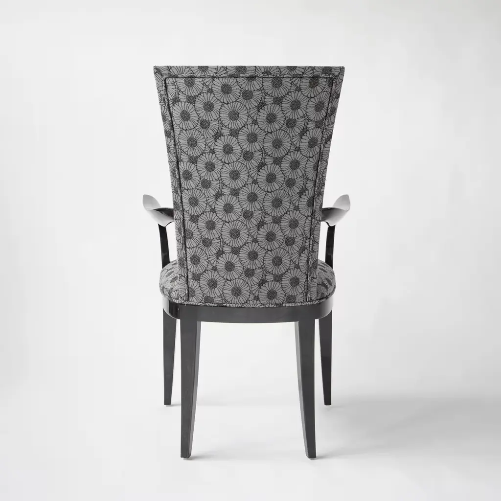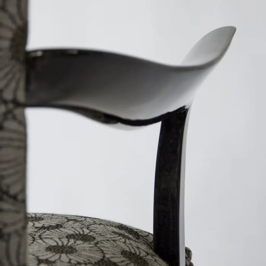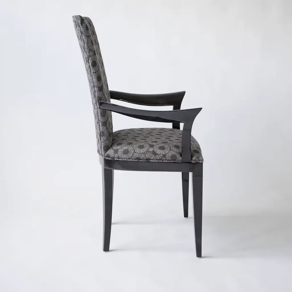 The Deco Chair is an exquisite example of designer seating, featuring an elegant and sophisticated structure covered with gloss anthracite gray parchment and a padded seat and back upholstered in vintage fabric. Complete with armrests, it will compliment any modern or classic decor in your dining room, living area or lounge room with its captivating design.