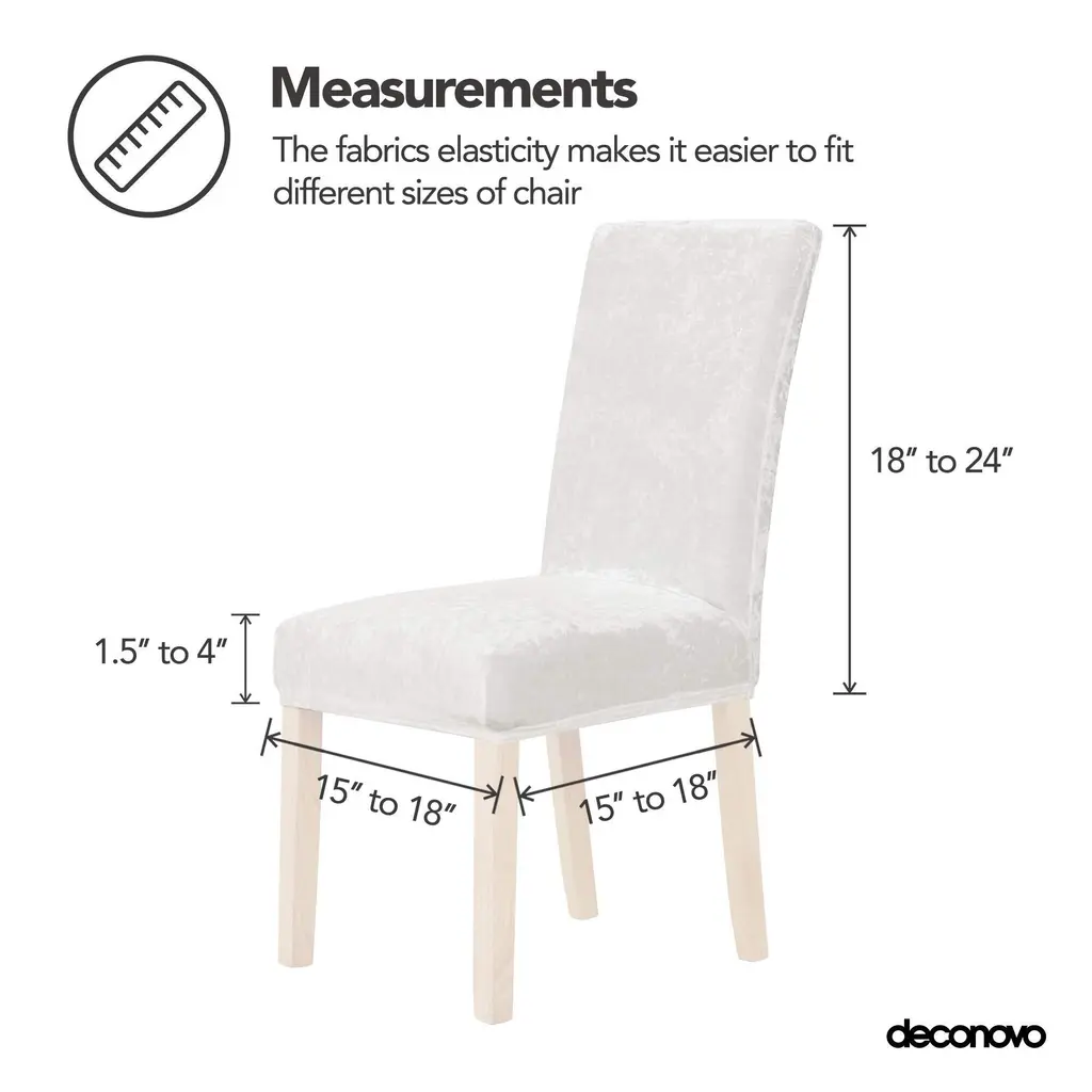 Transform your dining space with the Deconovo Velvet Stretch Chair Slipcovers. This set of 6 slipcovers is made from a high-quality blend of 97% polyester and 3% spandex, offering a soft and luxurious velvet texture that adds comfort and style to your chairs. The stretchable fabric provides a snug and tailored fit, perfect for chairs with back heights from 18" to 24" and seat widths ranging from 15" to 18". Key Features: