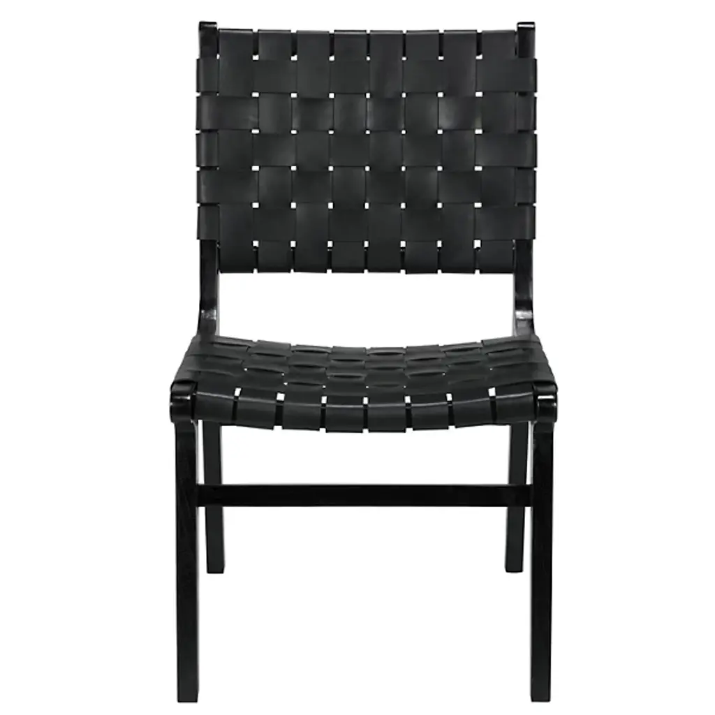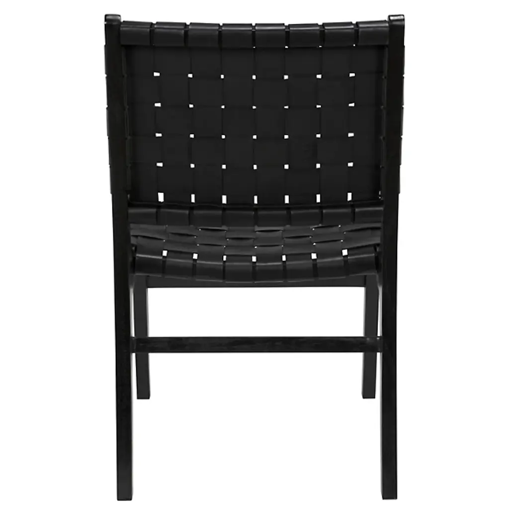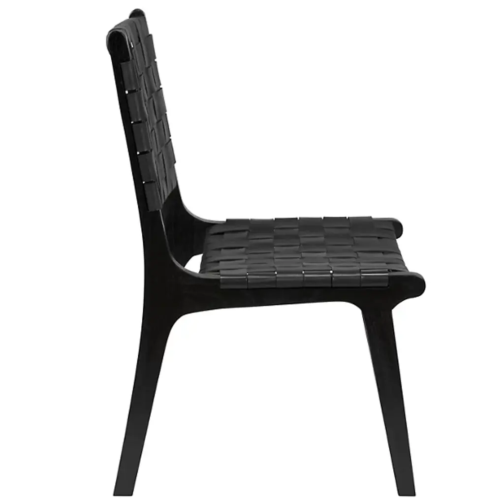The Dede Dining Side Chair from Noir combines expert craftsmanship with luxurious materials to create a stylish and comfortable seating option. Thick leather strips are meticulously handwoven around a natural teak frame, forming the seat and back with an elegant texture and rich look. The slim, tapered teak legs offer sturdy support while enhancing the chair's sleek, modern design. This unique piece effortlessly blends comfort with sophistication, making it an ideal addition to any dining space or contemporary decor.