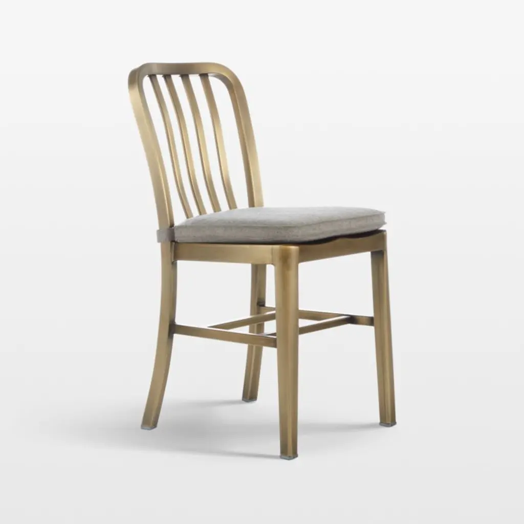 With its modern attitude and clean design, our aluminum Delta dining chair is a Crate and Barrel classic, now in a brushed brass finish. Contemporary with an industrial nod, the lightweight chair ensures a comfortable sit with a contoured back and molded seat. Crafted of machine-cut aluminum, each chair is welded together, hand polished to a soft sheen and given a brushed brass finish. A Crate and Barrel exclusive, the Delta dining chair is designed and tested for use in commercial spaces such as offices, restaurants and hotels. Our plush cushion elevates the look and feel and attaches to the chair with fabric tab fasteners.