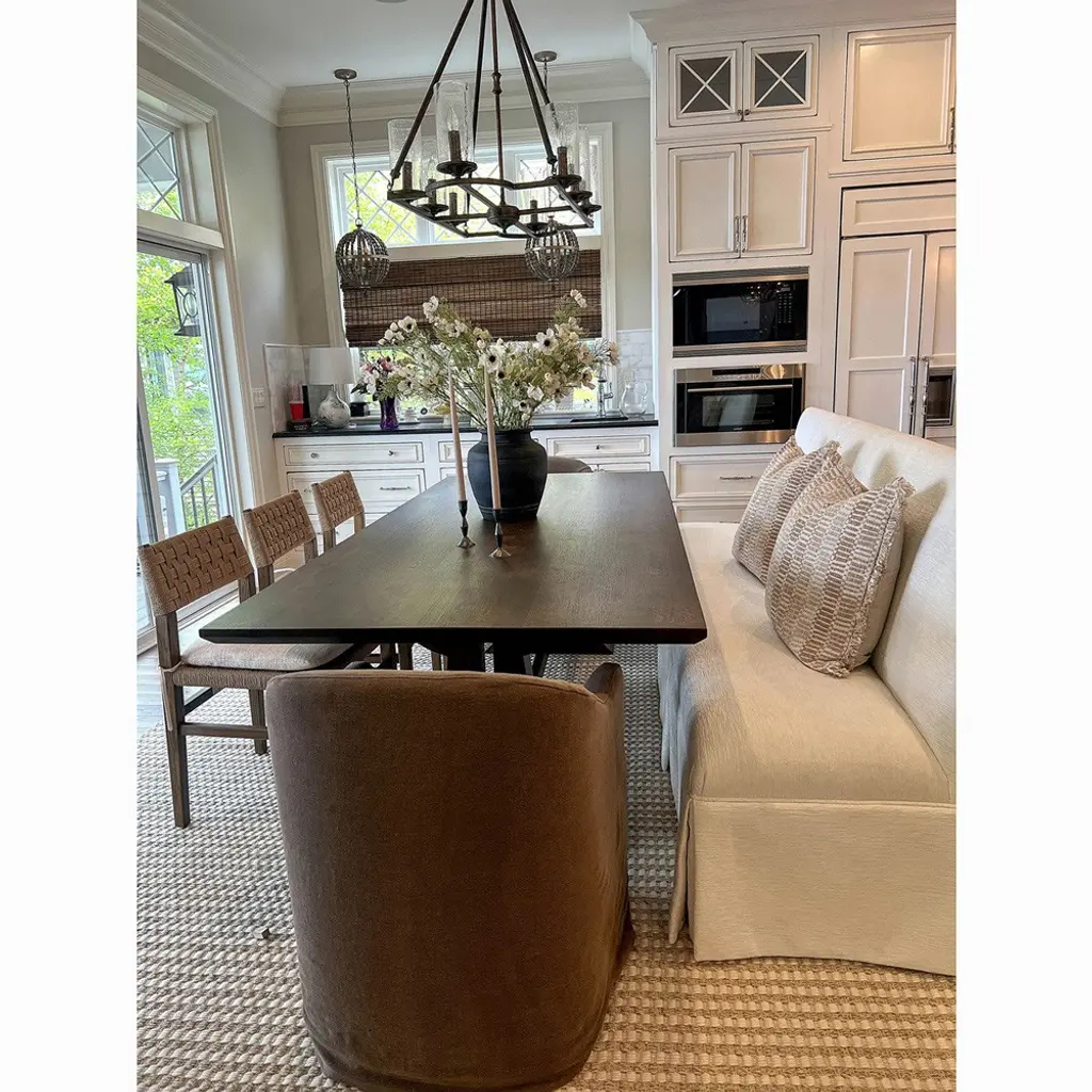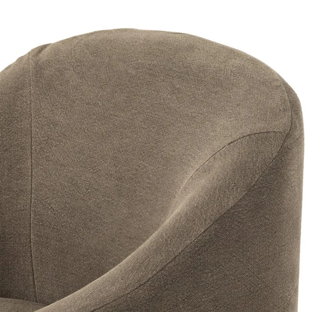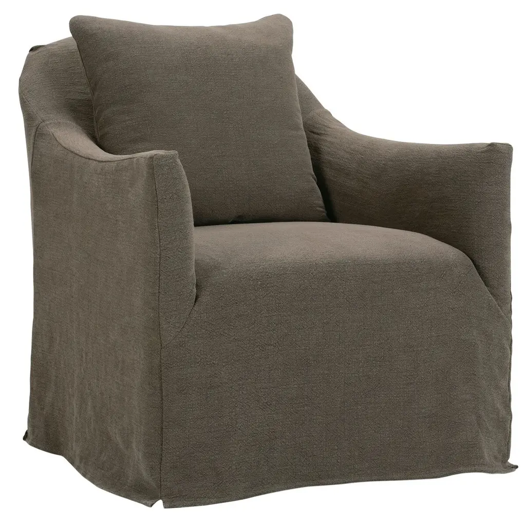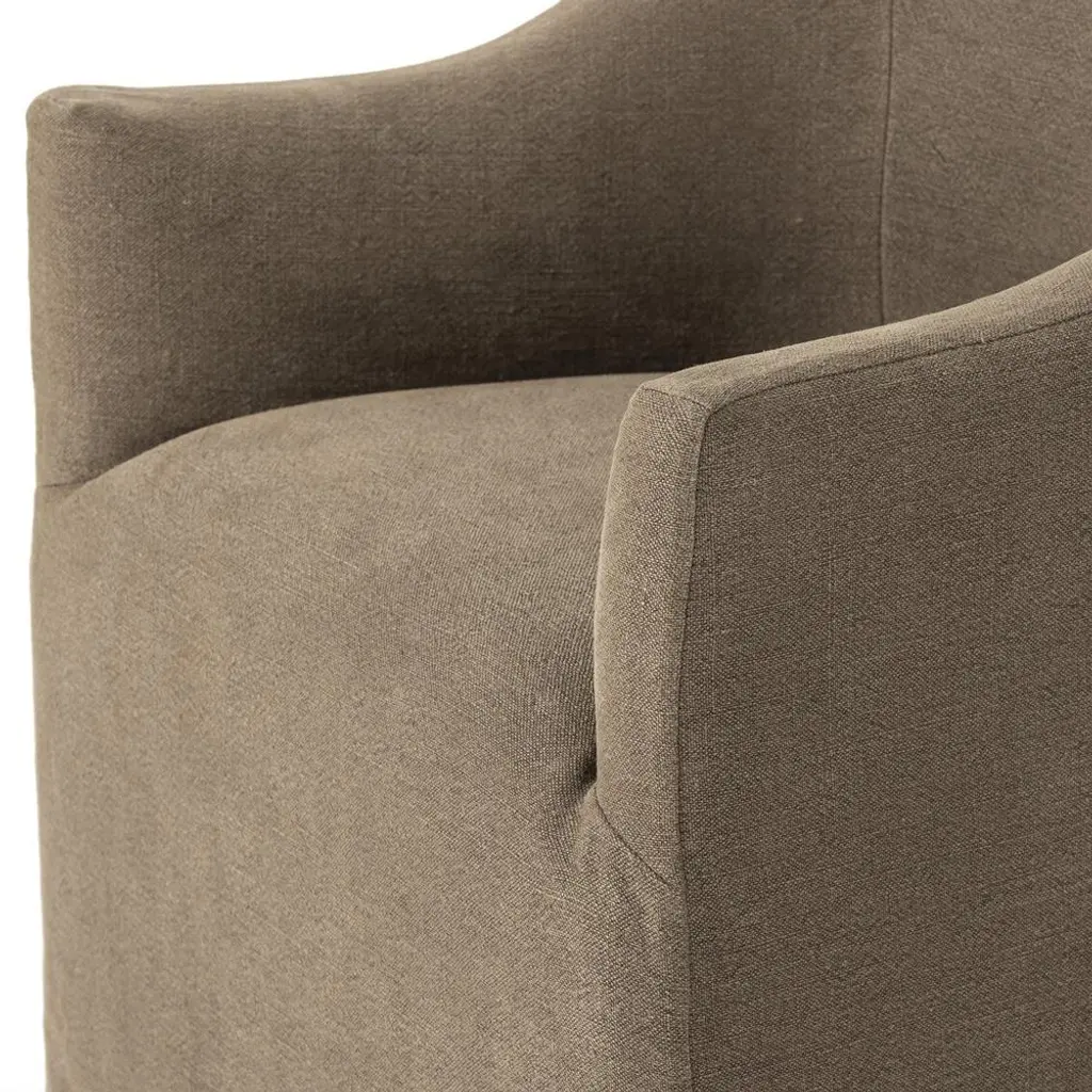 The Desiree dining armchair makes a beautiful addition to a dining room, home office, or bedroom seating area. With its graceful curved arms, cushioned seat, and broadway coffee slipcover, this dreamy chair is the epitome of inviting. It may be so comfortable your guests won’t want to leave their seats after dinner—don’t say we didn’t warn you!