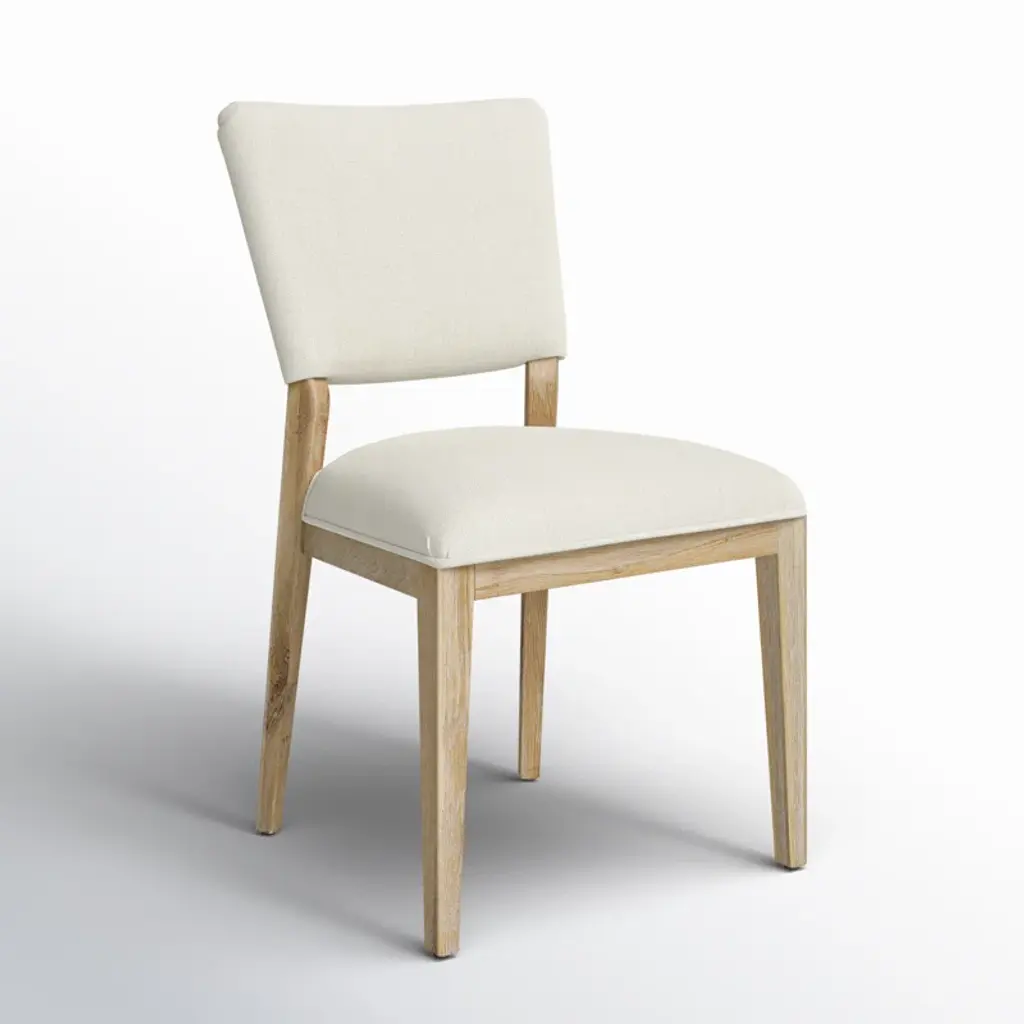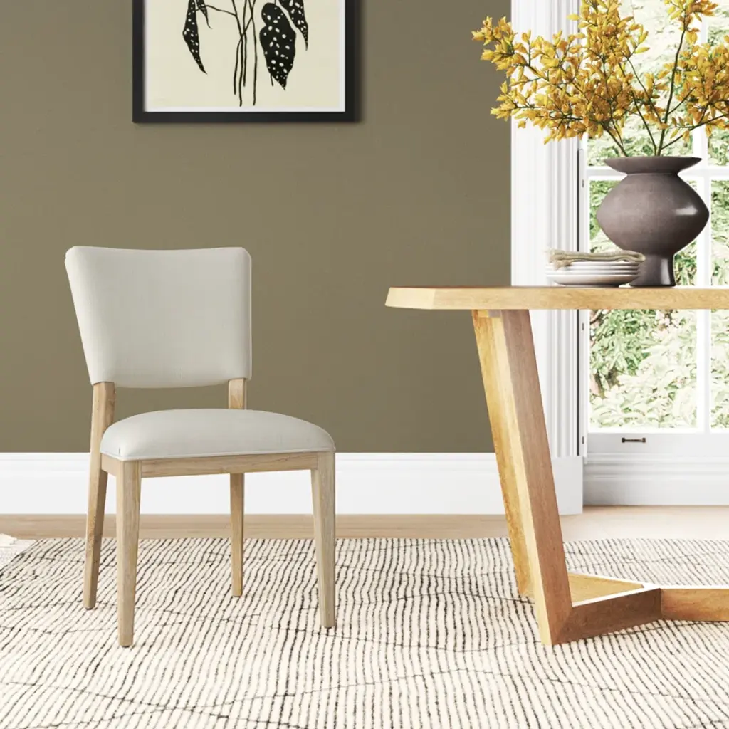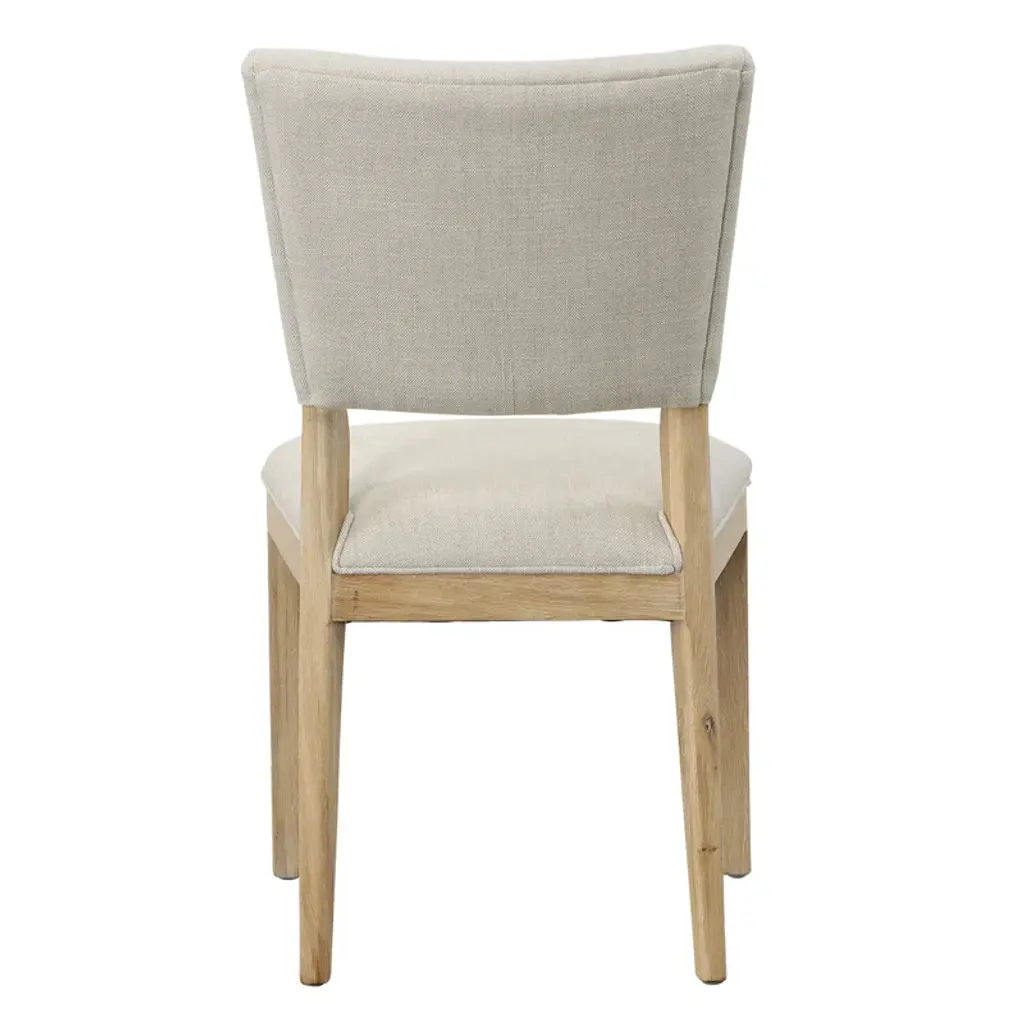 Epitomizing understated elegance, the cotton blend upholstered dining chair combines oak wood and cotton blend upholstery in a subdued, cohesive design. It features an oak wood frame wrapped in light sand upholstery, presenting a soothing palette that brings warmth to any dining area. The natural wood infuses subtle rustic charm into the design, setting off the chair's clean-lined, contemporary profile plus the cotton blend upholstery is soft and comfortable to the touch.