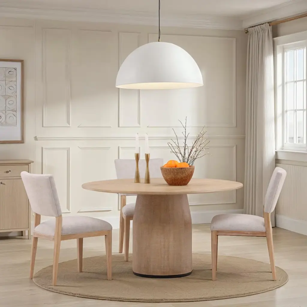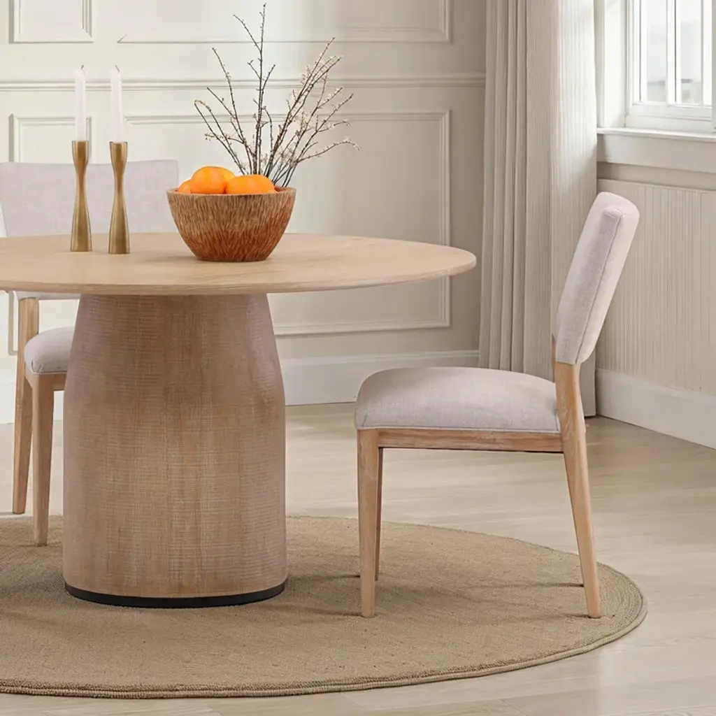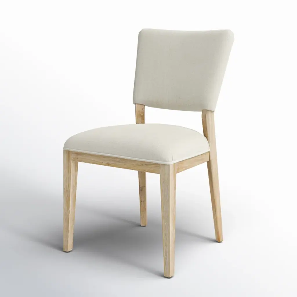 Epitomizing understated elegance, the cotton blend upholstered dining chair combines oak wood and cotton blend upholstery in a subdued, cohesive design. It features an oak wood frame wrapped in light sand upholstery, presenting a soothing palette that brings warmth to any dining area. The natural wood infuses subtle rustic charm into the design, setting off the chair's clean-lined, contemporary profile plus the cotton blend upholstery is soft and comfortable to the touch.