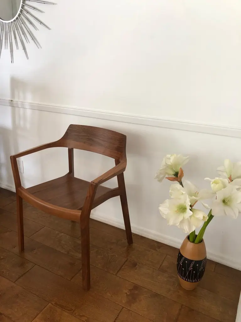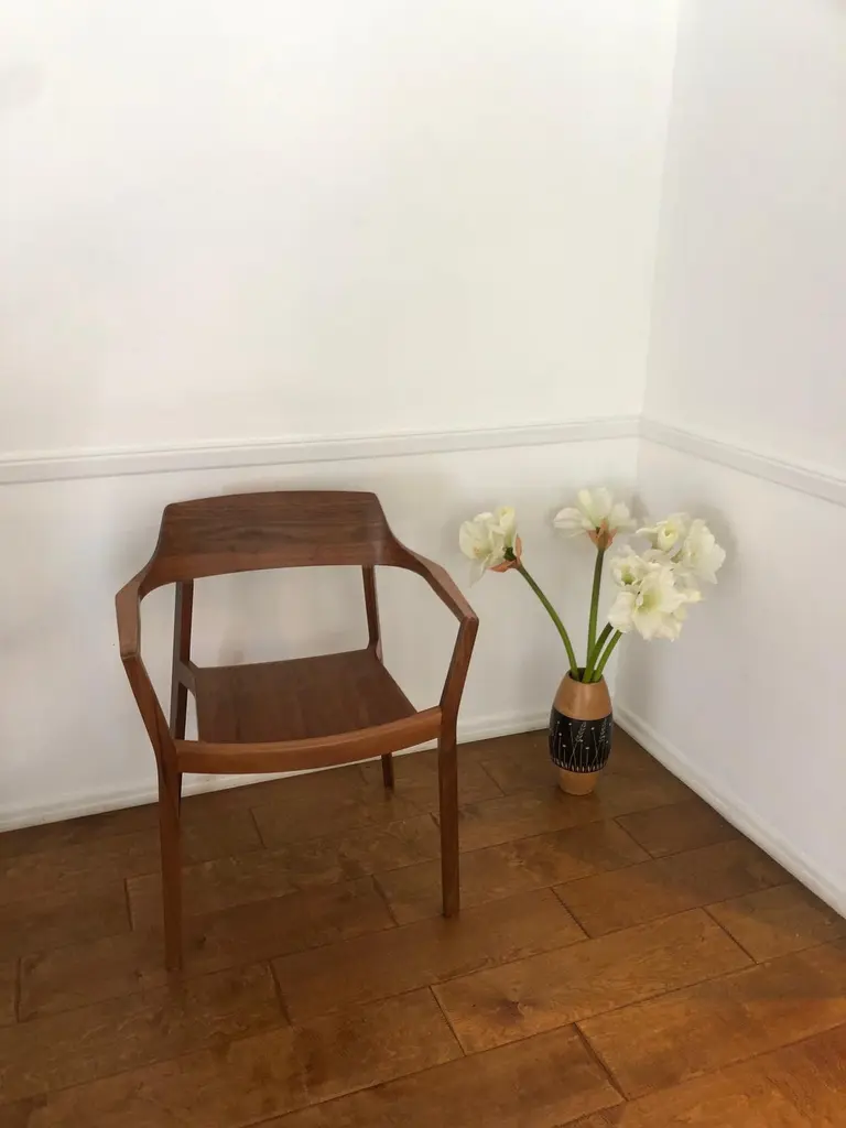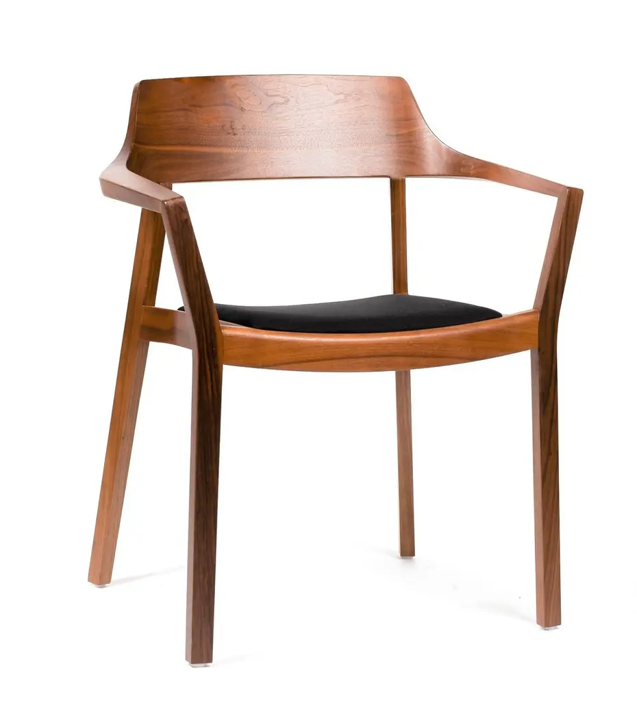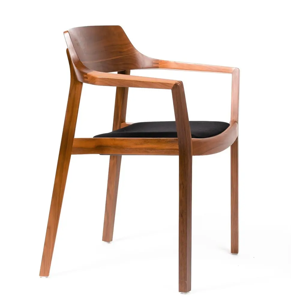 Ono is a classic piece of Swiss design and the lightest of all wood chairs, weighing only 12.5 lbs (5.7 kg).Designed by This Weber.Manufactured with care from American Walnut wood, the frame is in solid wood and the seat is in molded plywood.The chair is available in natural lacquered wood color, with or without arms, with wooden seat or with inlaid leather upholstery, and plastic glides. It stacks up to 4.